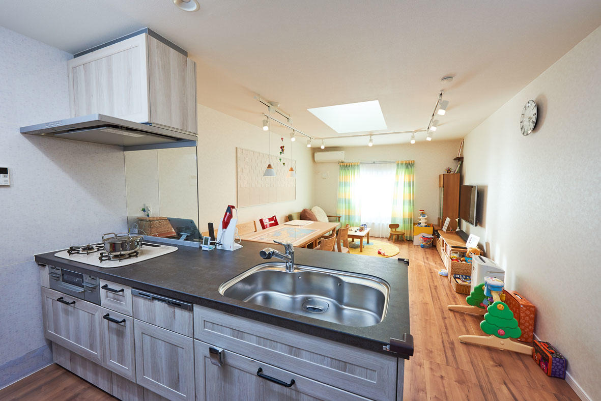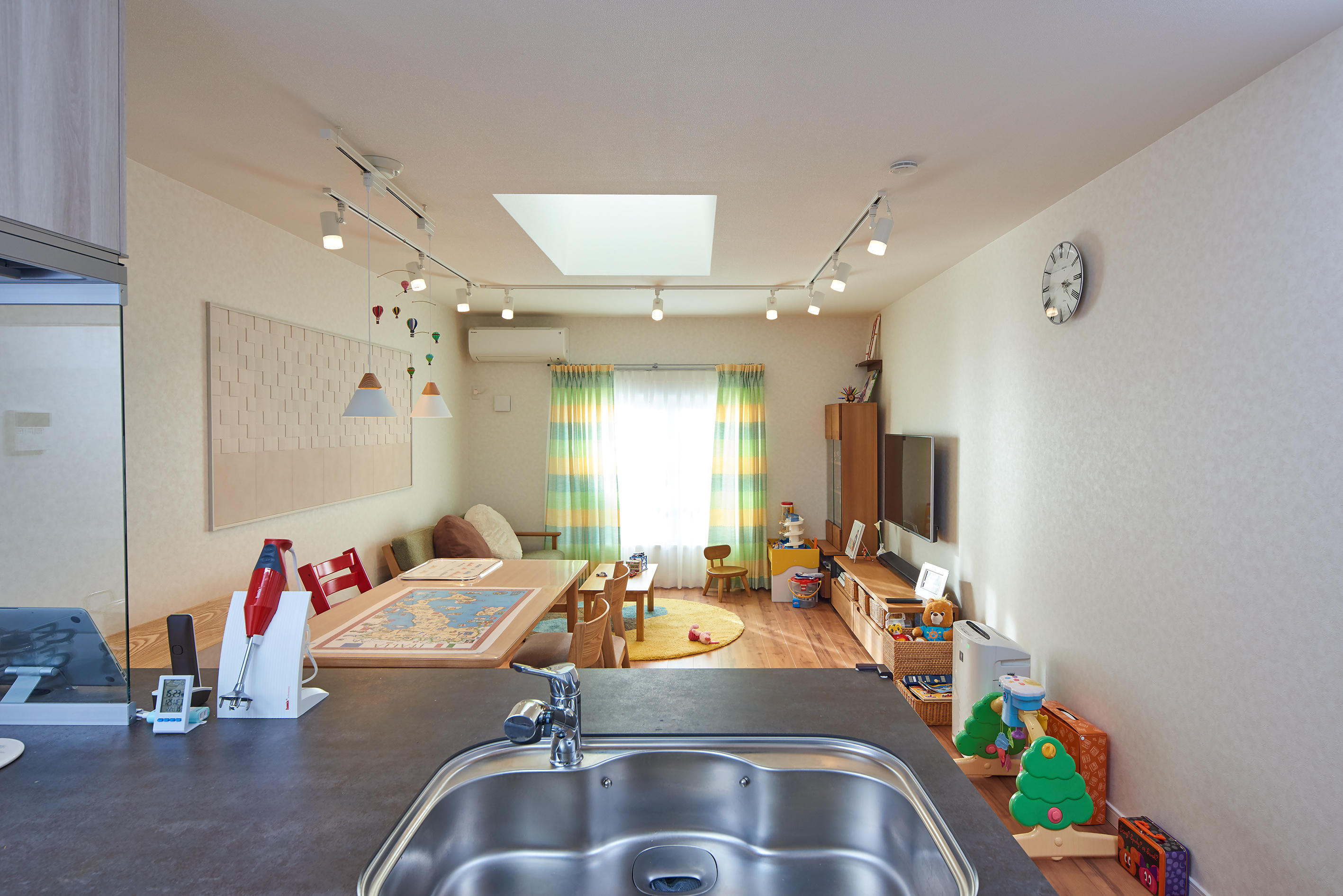 2階の天窓と調光できるライトの組み合わせが気に入っています。 お気に入りは明るく使いやすくなった対面キッチンです。収納もたっぷり作ってもらいとても重宝しています。 キッチンから子供たちの様子が見えるので安心です。