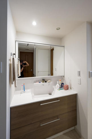 築21年のマンションのフルリノベーションです。 流れるような無駄のない動線をこころがけてプランさせていただきました。 また、元々の仕様で床暖部、カーペット部、和室畳部を統一床材で仕上げる為の 組み合わせ選定が少し困難でしたが何とかご満足いただける内容で仕上げさせていただくことができたと思います。