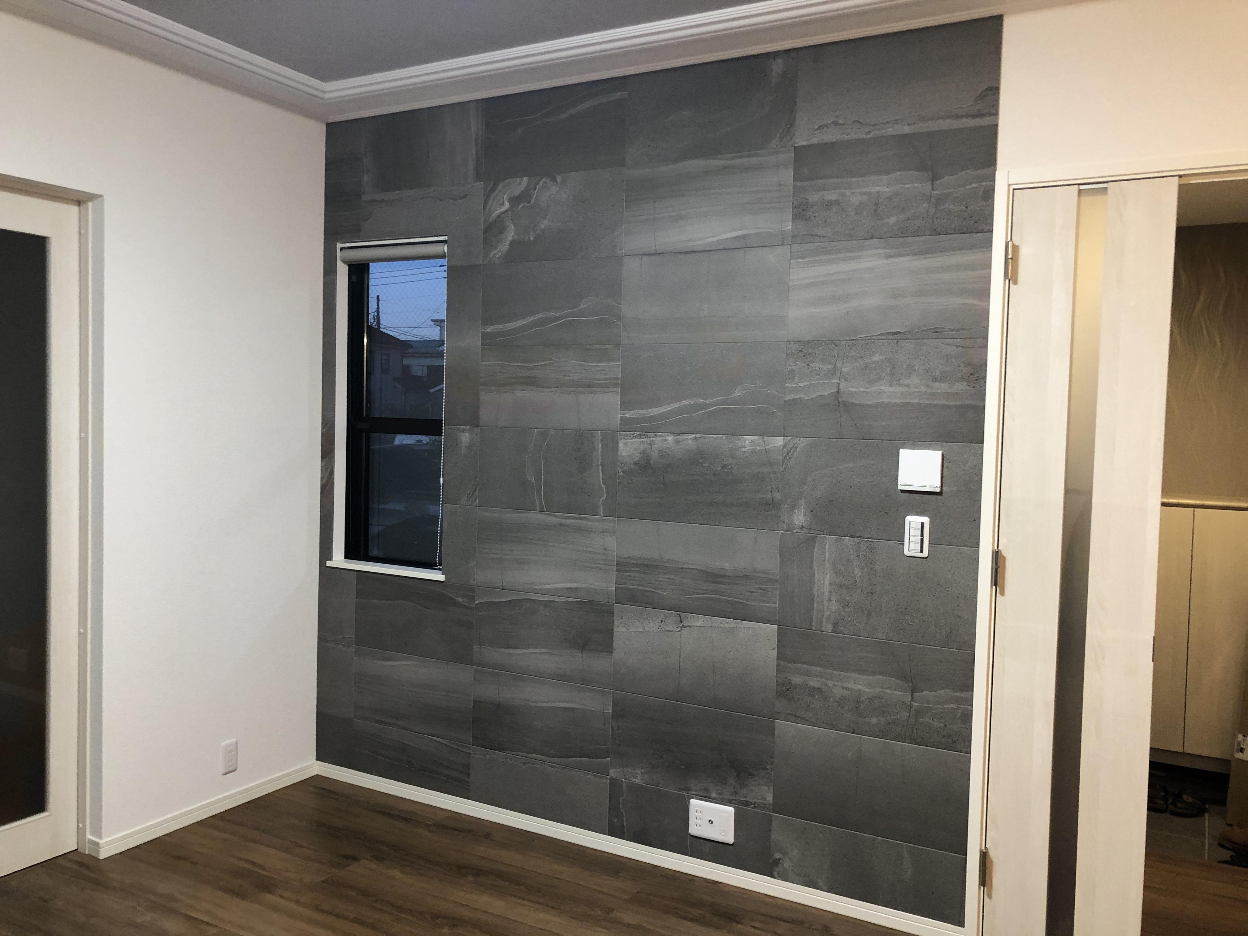 リビングの壁が白系だったので、1面だけ対照的な黒系のエコカラットを貼ることにより、高級感のある落ち着いた空間に仕上がりました。