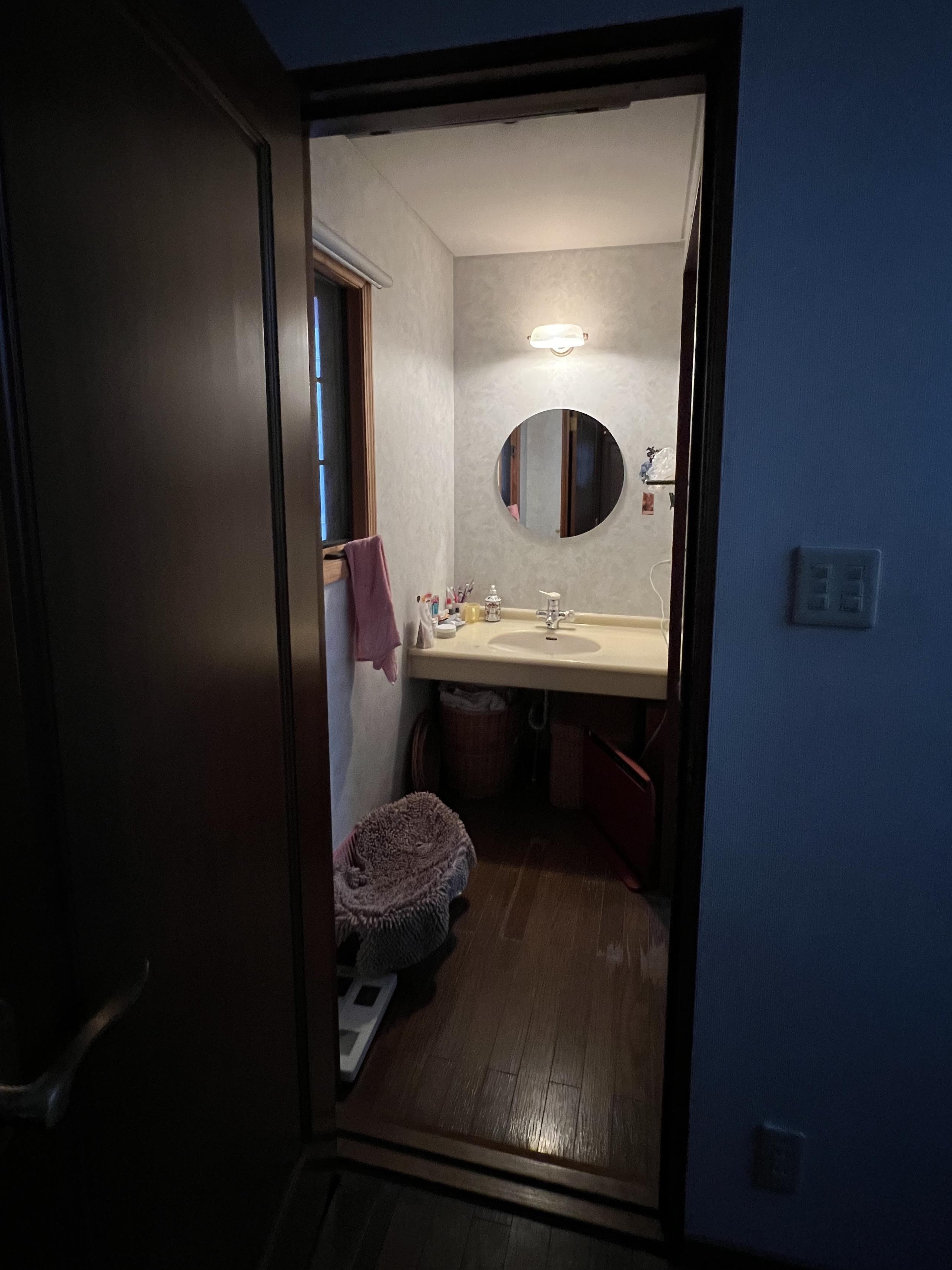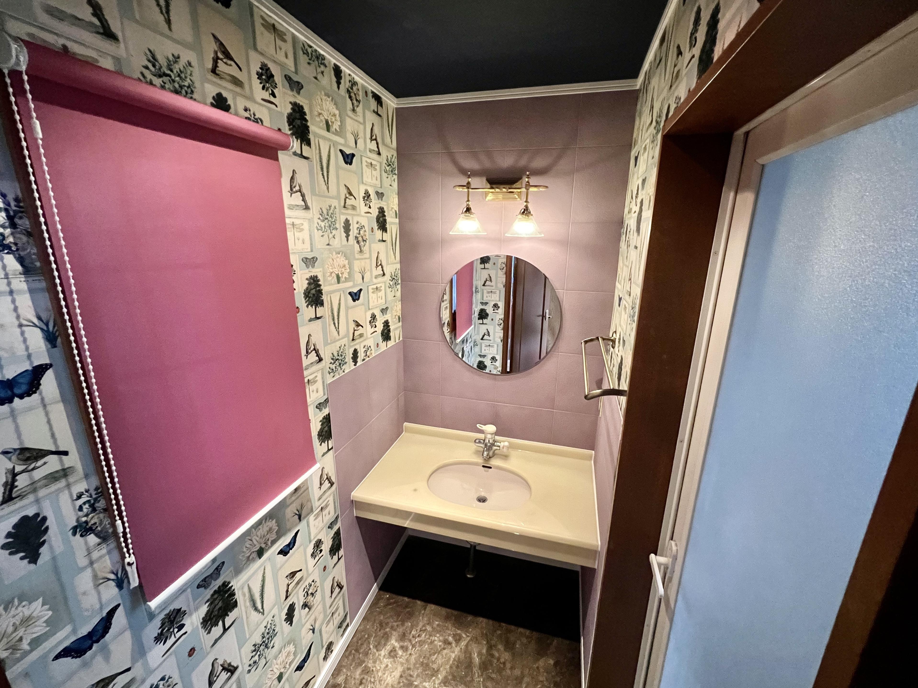 洗面台は既存のままで、内装材だけでアンティーク風の洗面所にリフォームしました。 輸入壁紙「テシード」を全体的に貼りたいとご要望を頂いていたので、それに合うテイストをご提案させて頂きました。 お施主様支給の照明も加わりよりアンティーク感が増した空間に仕上がりました。