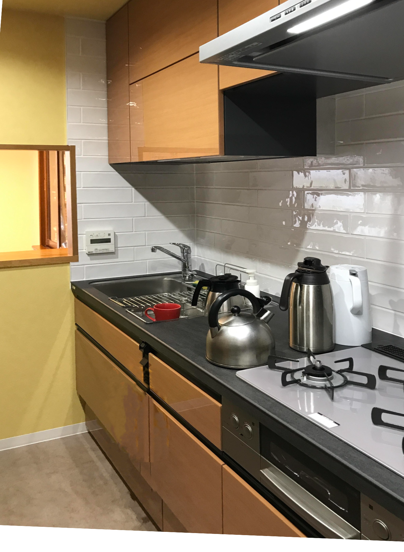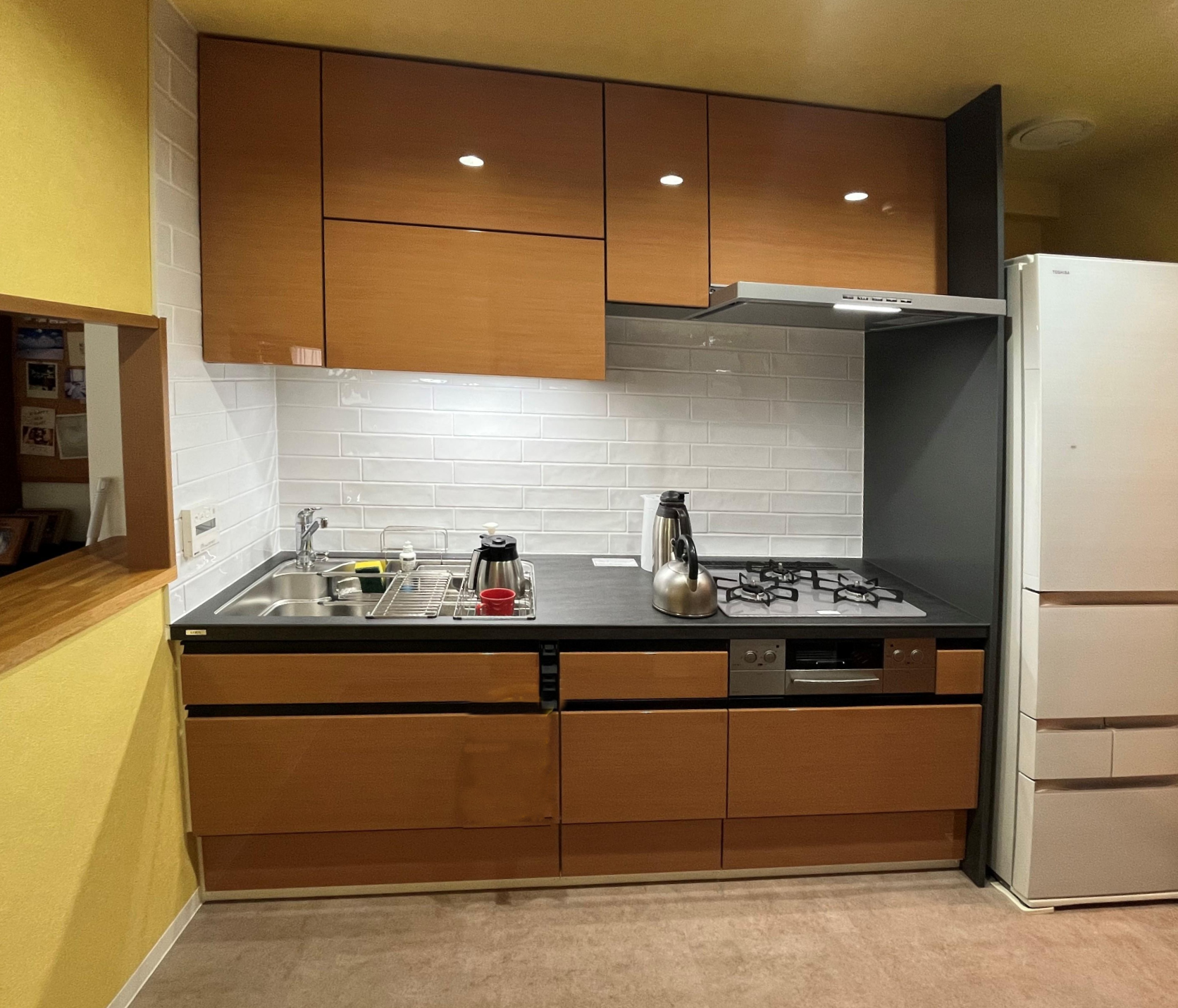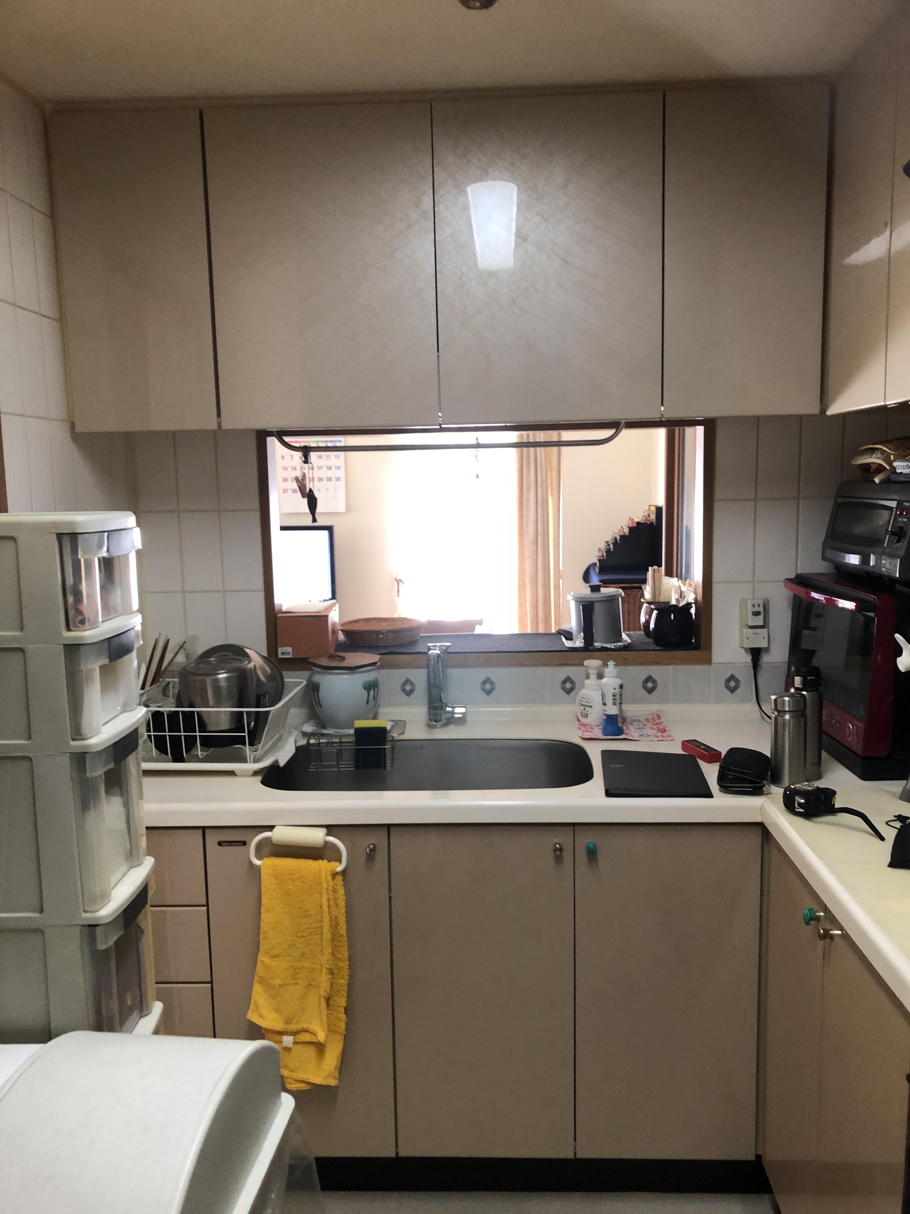 お客様のライフスタイルの変化によりL型キッチンからシンプルなI型に変更したいとの ご要望に基づいてご一緒にプランを考えさせていただきました。 ご選定下さった石目調の黄色のクロスを壁~天井まで貼り込み、よりニュアンスのあるキッチンとなりました。