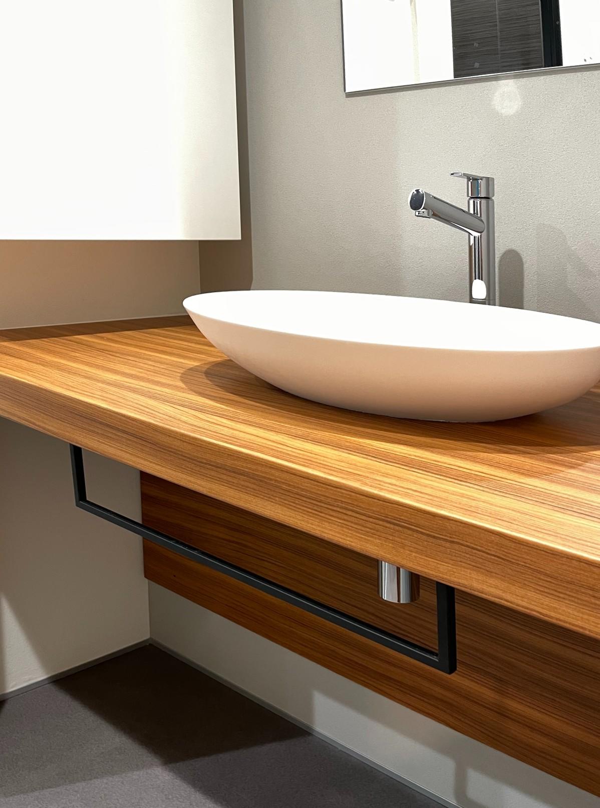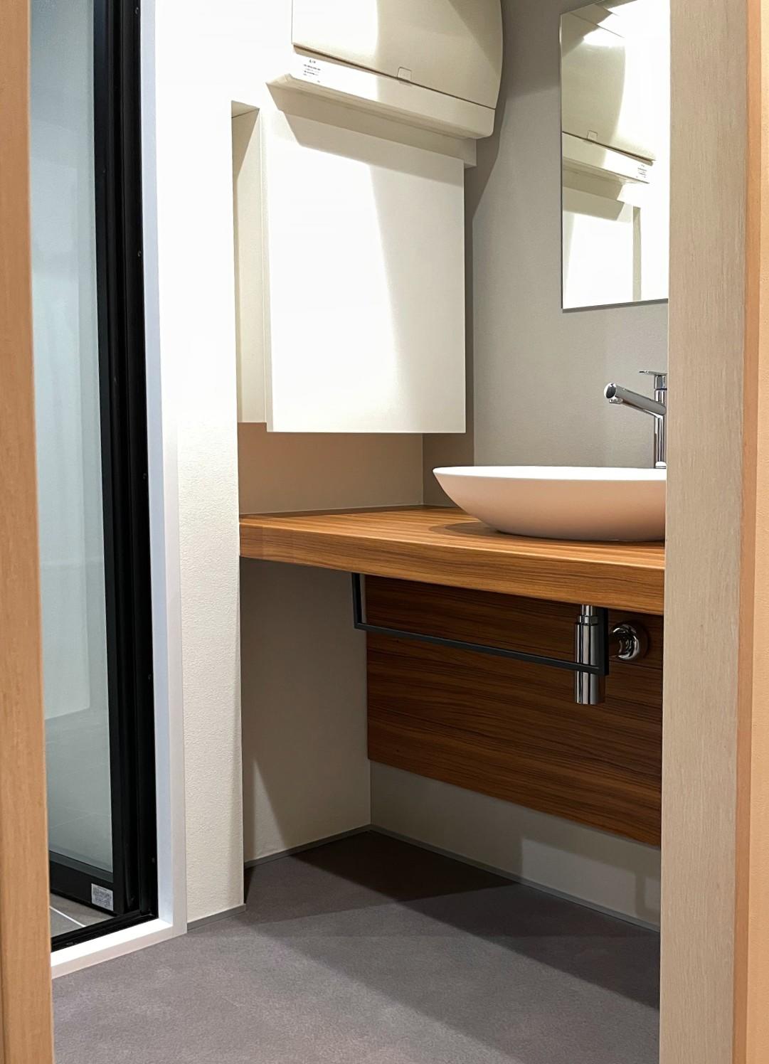 今回の洗面浴室スペースはお施主様自らショールームに足を運び、デザイン色柄を吟味されお選びいただいたこだわりの空間です。 また、工事担当者含め打合せを重ねることにより、細部にわたりスッキリとスタイリッシュな空間がうまれました。