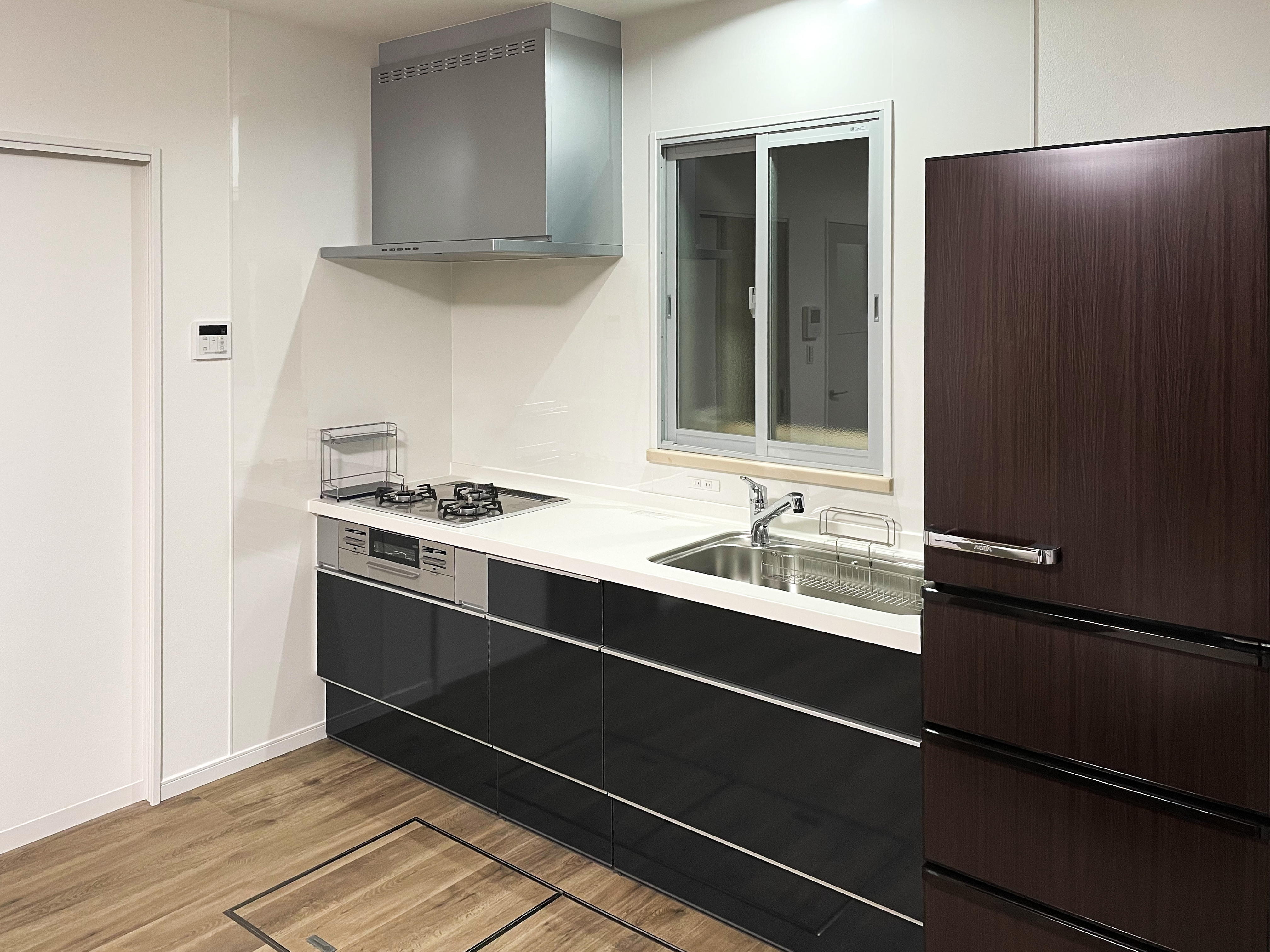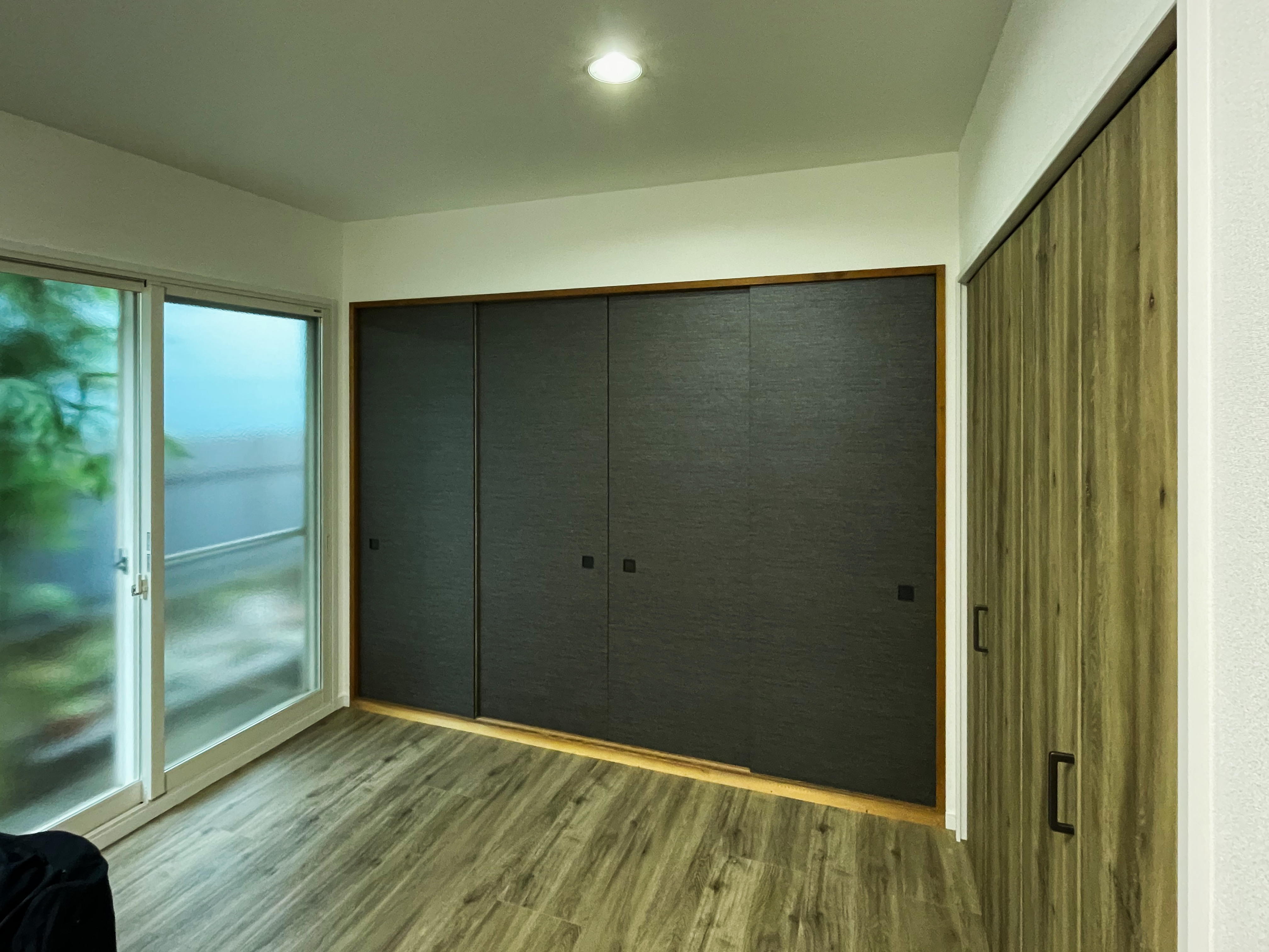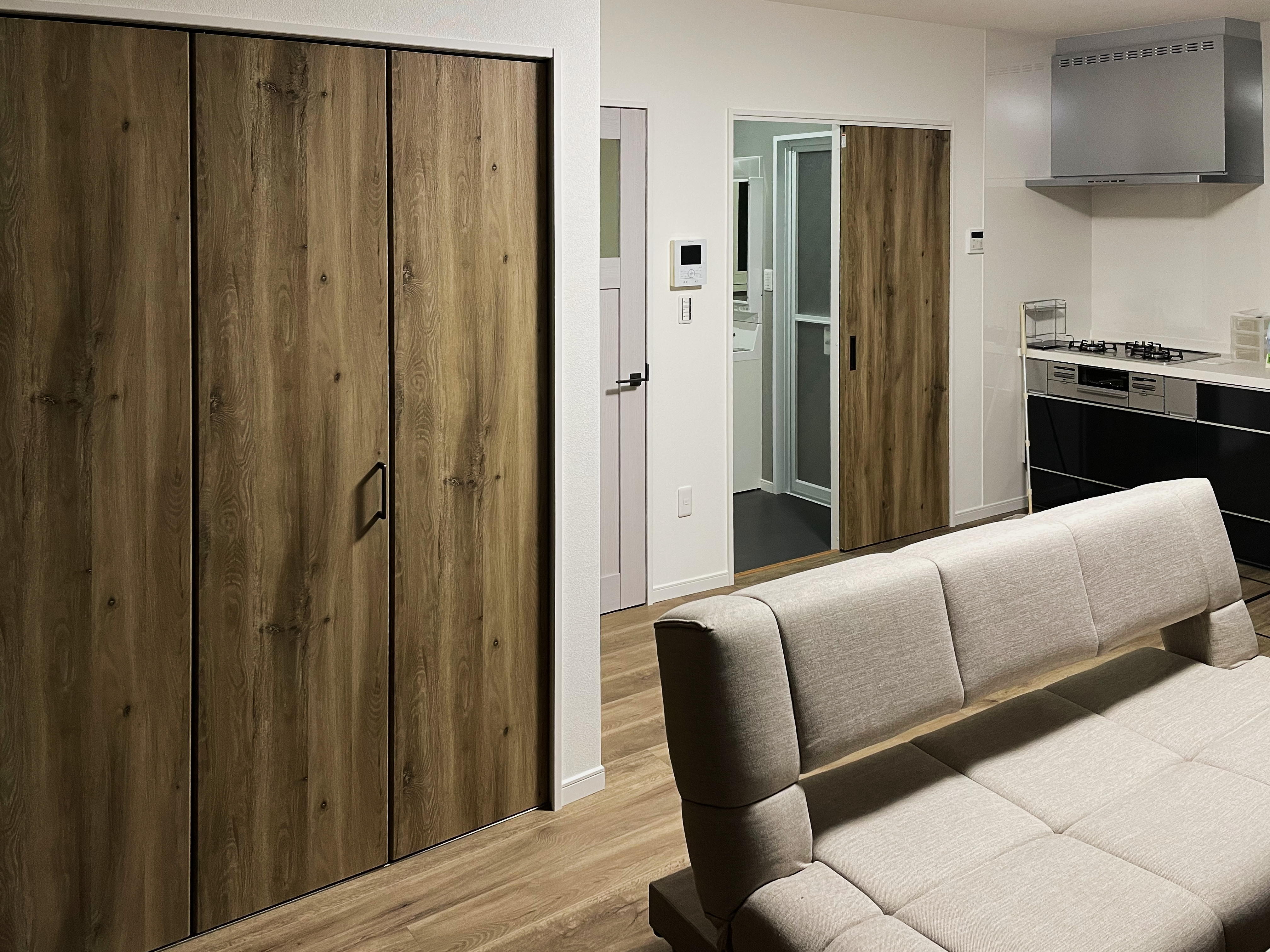戸建ての1、2階のリノベーション。1階の和室を洋室にしてLDKとつなげ襖を木目に変えました。扉もラシッサDのラフオークに変えウッディなイメージに。 キッチンは白の木目から、ダークな色の扉に変えガラッと印象が変わりました。