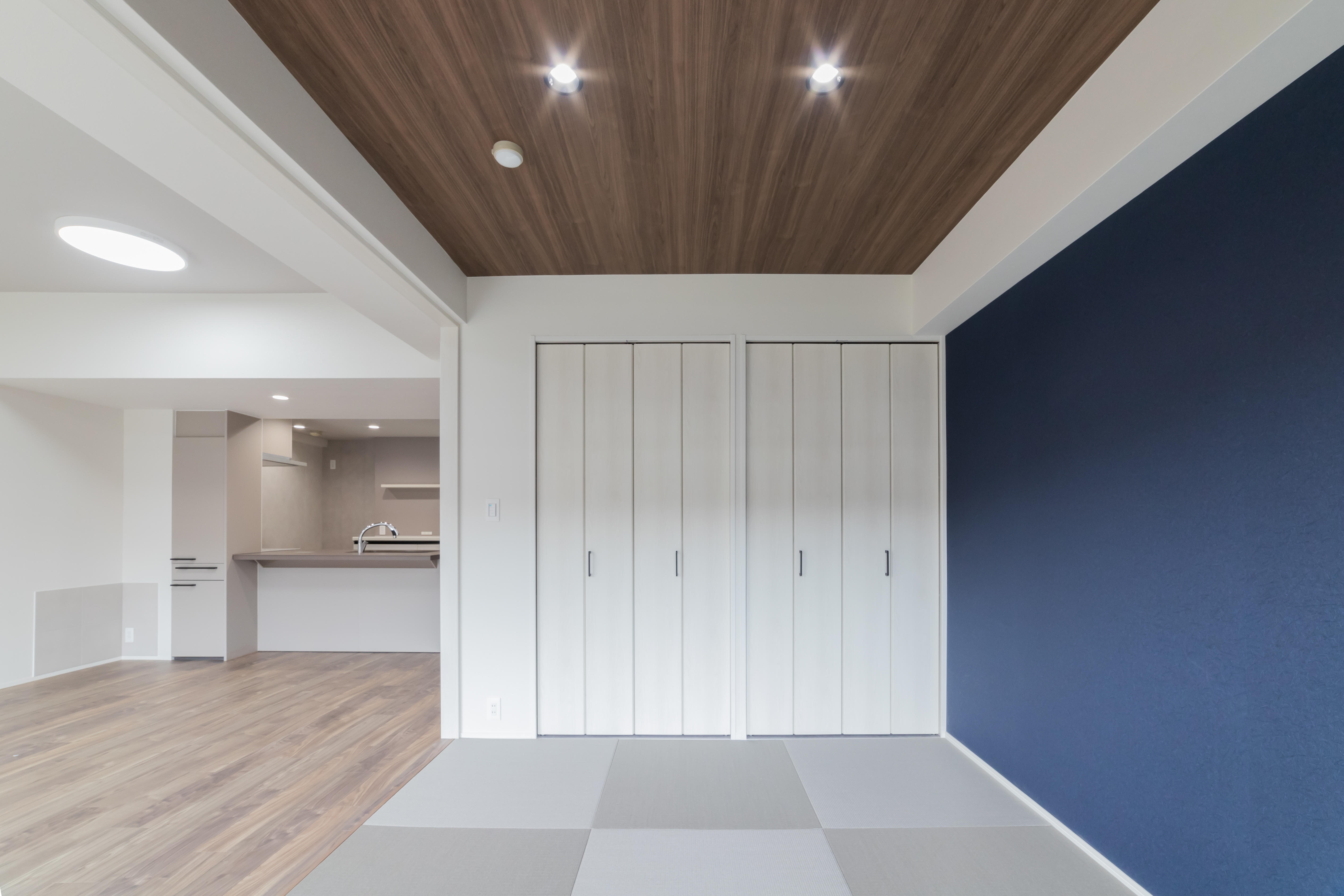 和室の改装になります畳は『 ダイケン 健やか表 』に交換しています清掃性にも優れており、日当たりのいい場所でも色褪せしにくく美しさが長持ちする畳です紺のアクセントクロスや天井の木目クロスが鮮やかな仕上がりになりましたリビングダイニングとの境目の間仕切り戸を撤去することで圧迫感が減り空間が広くみえるようになりました