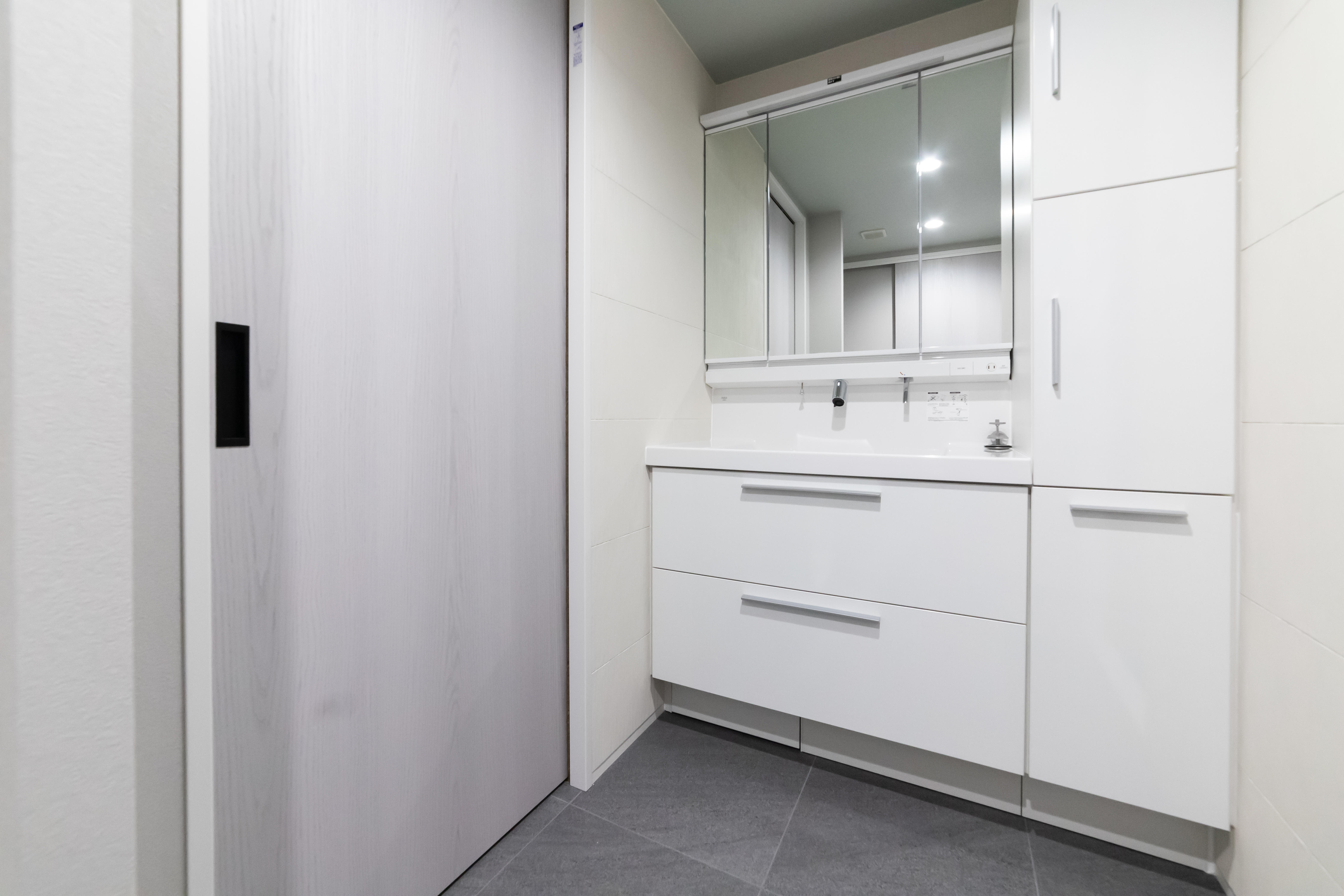 「自動水栓を取付したい」というのが第一のご希望でした。間口ピッタリで収納力たっぷりグレーを基調とした空間にホワイトの化粧台が映える空間に仕上がりました