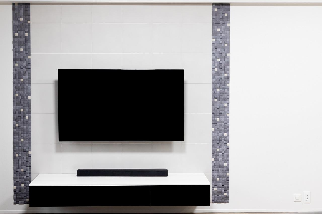 壁掛けテレビに合わせてテレビ台を取付致しましたテレビ取付箇所周りには『LIXIL エコカラット』でアクセントを入れましたコンセント周りのさりげないエコカラットも可愛く、スッキリとした空間に仕上げました