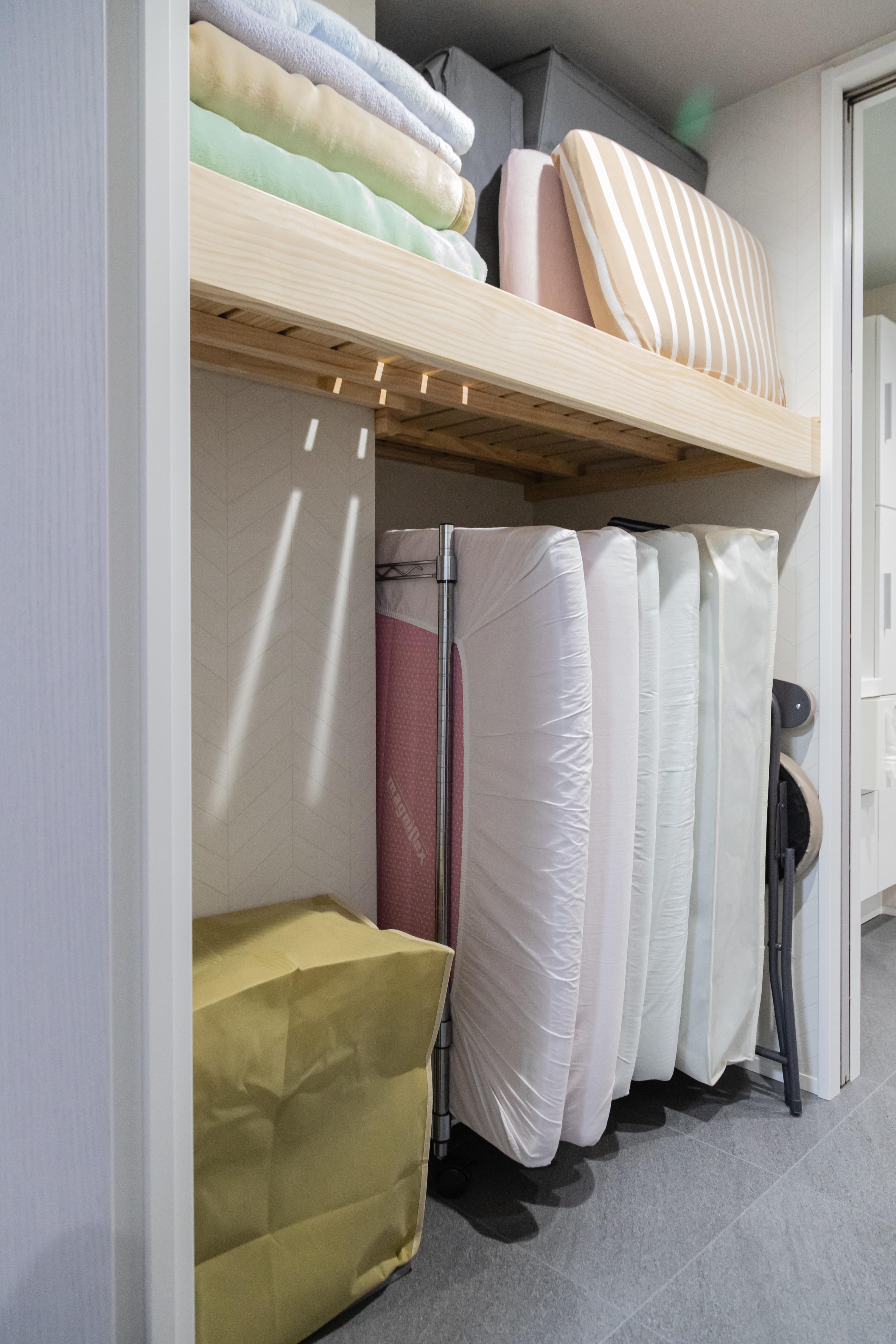 出っ張っていた天板は高さを調整し簀の子調の中段に通気性がある収納スペースとなっています中段下にはスライド式の収納を造作し、マットレスなどを収納できるように工夫して仕上げました可動式の棚板収納は使い勝手に合わせて調整できます