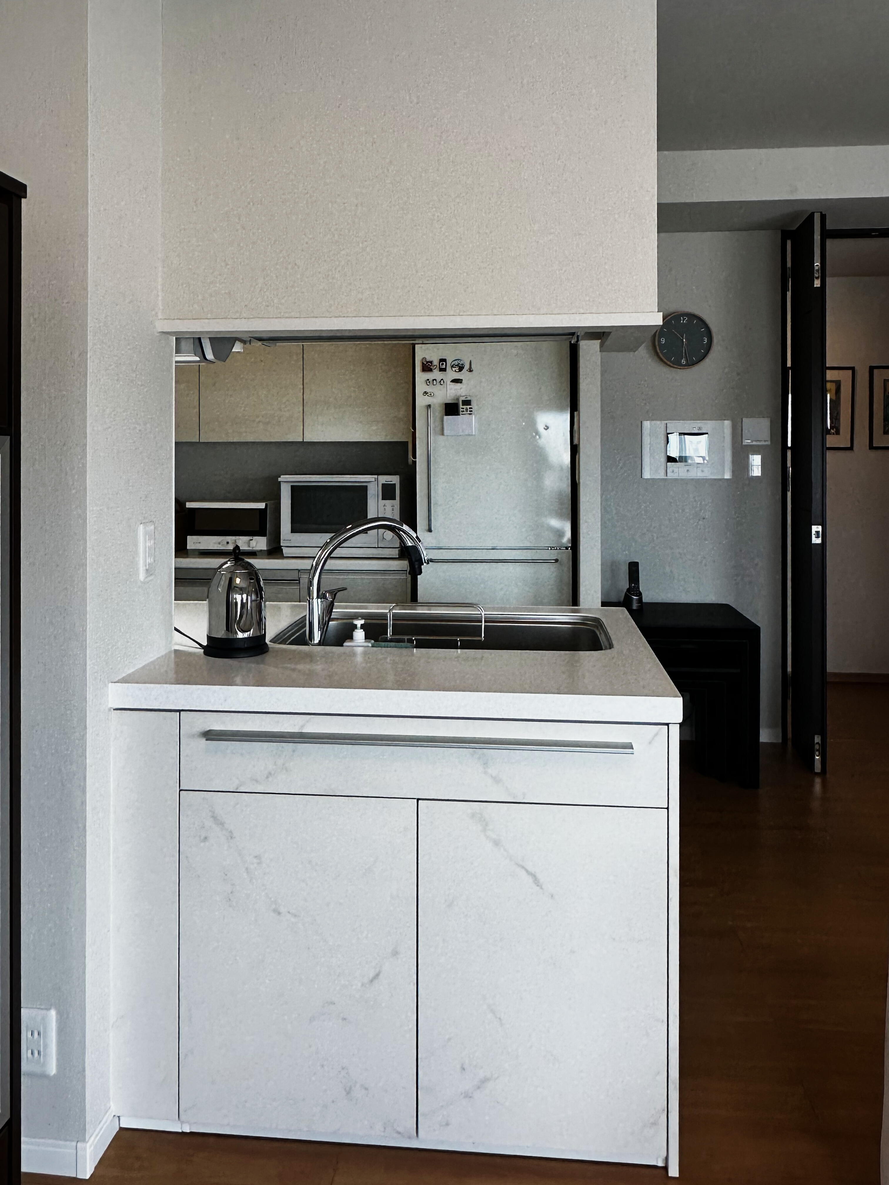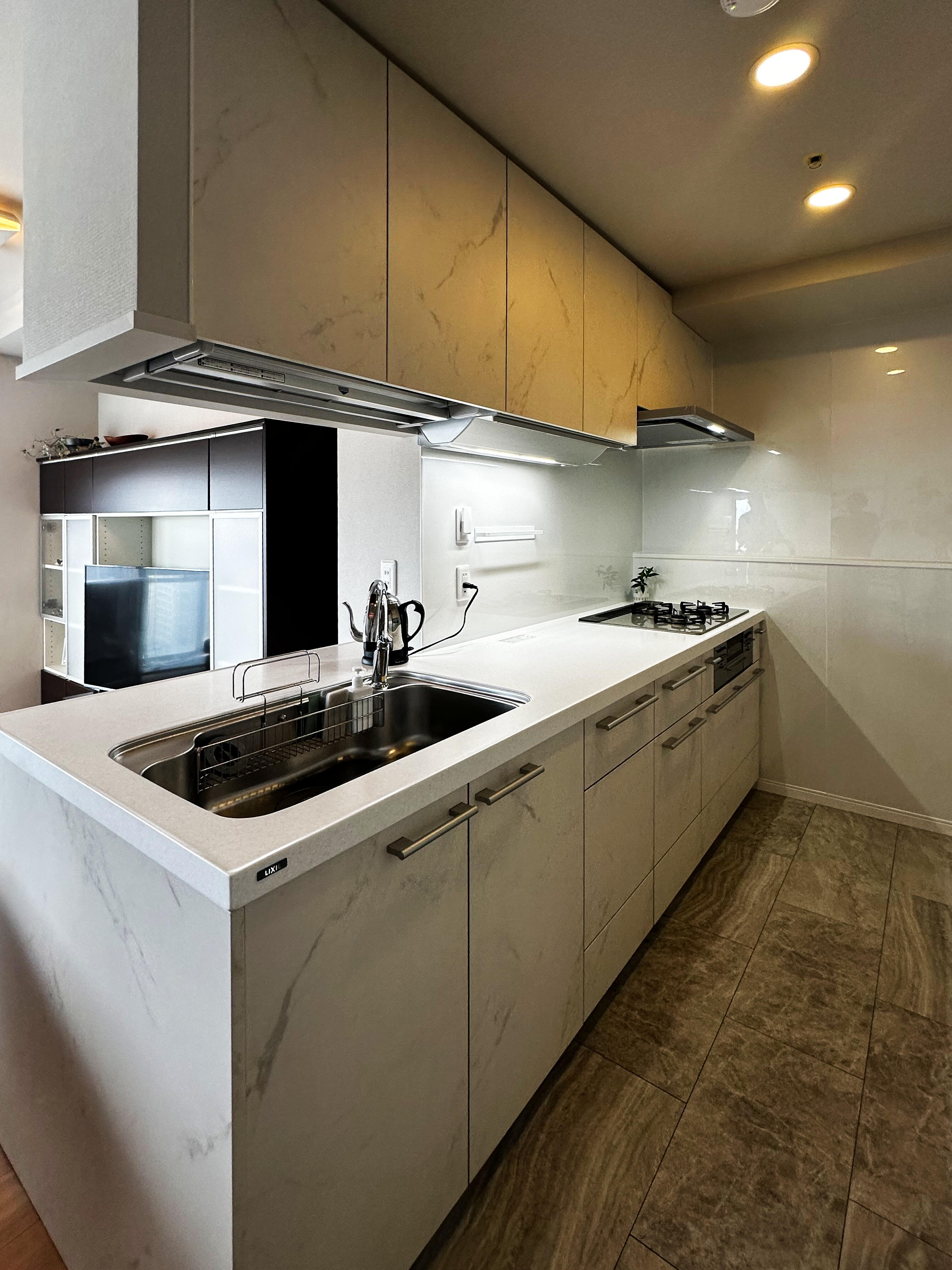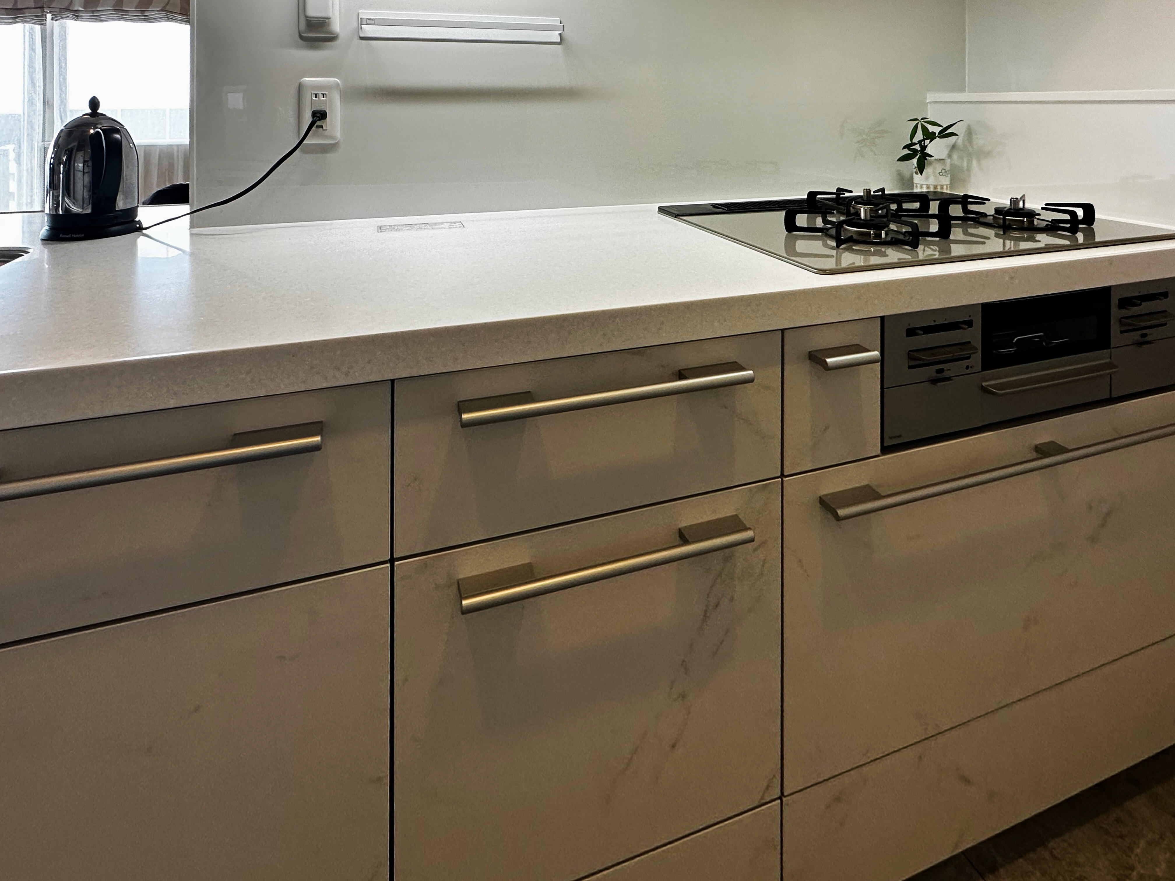 ショールームでLIXILリシェルに一目惚れ。扉は新柄のカルカッタホワイトをセレクト。ただマンションの制約上、課題が多く、リシェルは難しいよと言われ、他メーカーを勧められることも。なんとかメーカーと交渉して担当者が紆余曲折ありつつも課題を突破して工事ができることに。