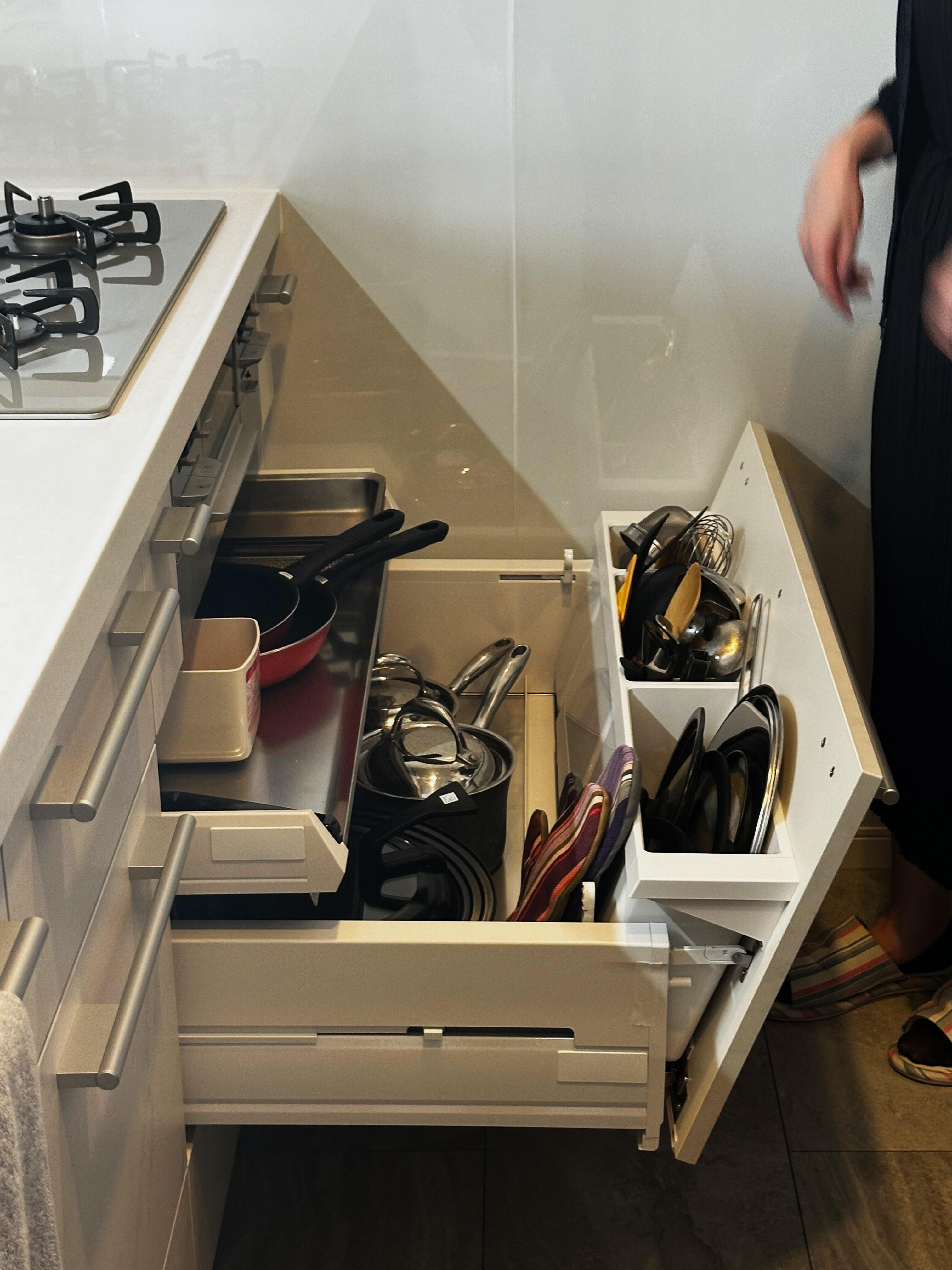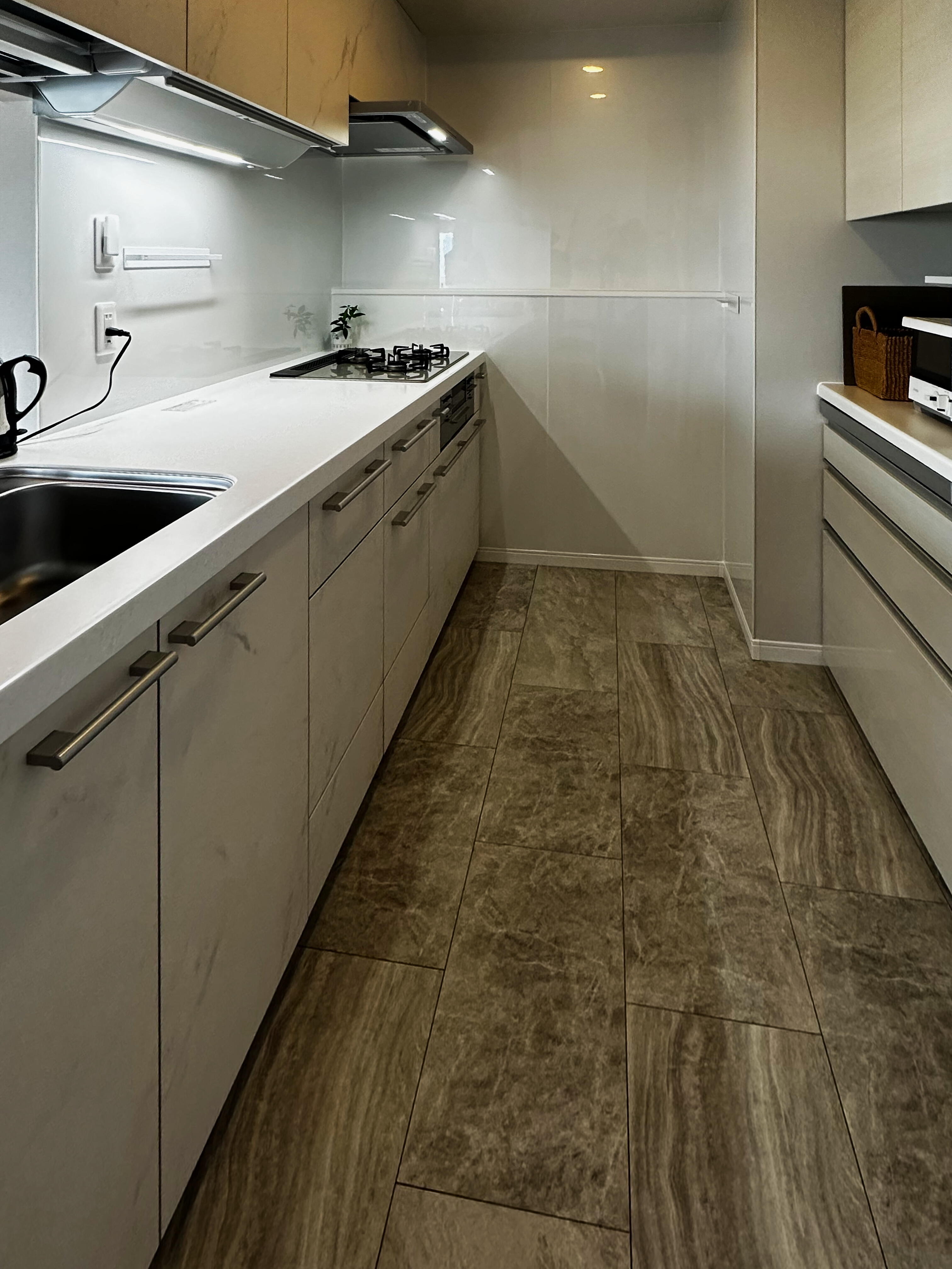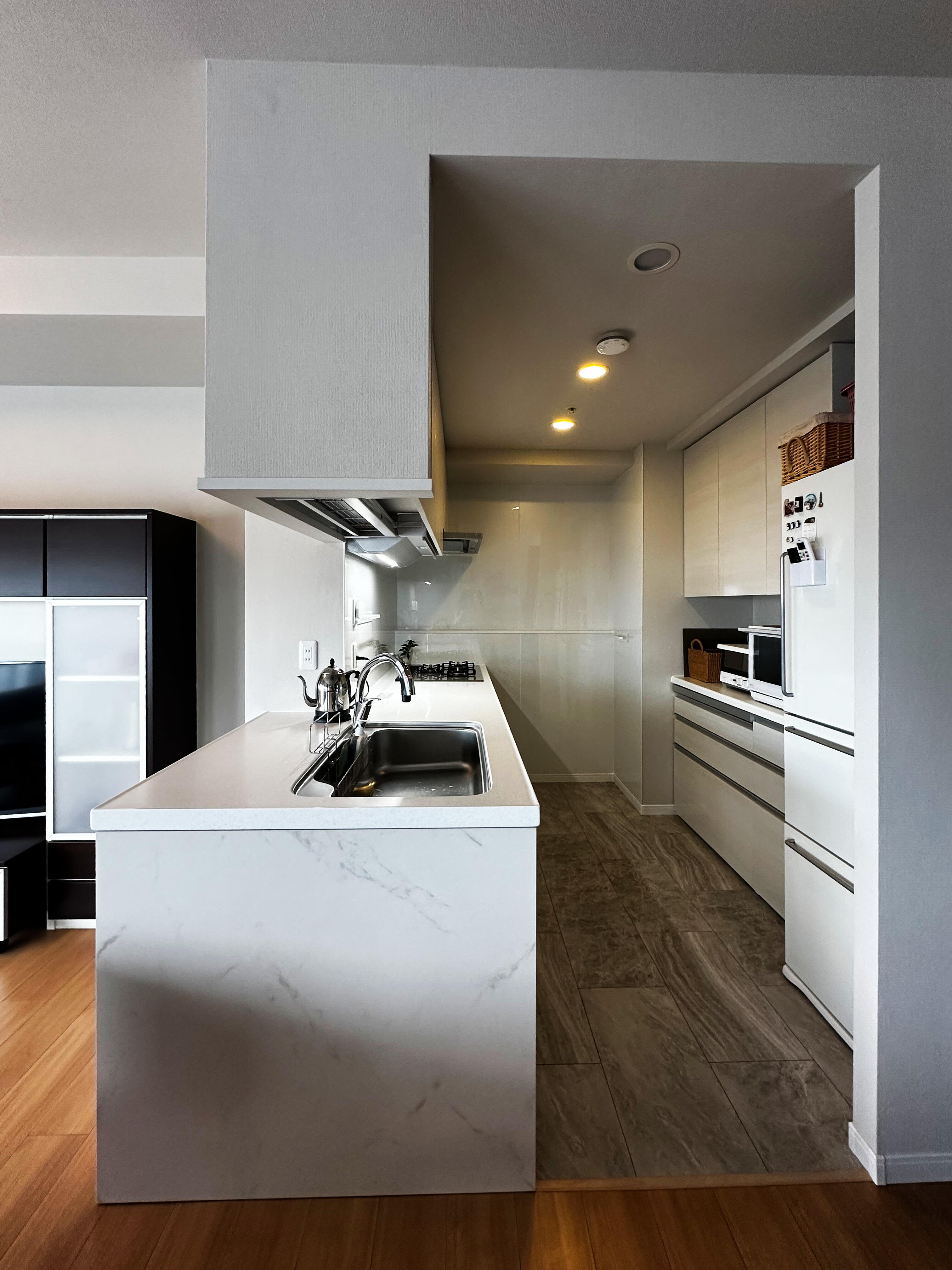 ショールームでLIXILリシェルに一目惚れ。扉は新柄のカルカッタホワイトをセレクト。ただマンションの制約上、課題が多く、リシェルは難しいよと言われ、他メーカーを勧められることも。なんとかメーカーと交渉して担当者が紆余曲折ありつつも課題を突破して工事ができることに。