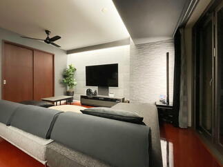 間接照明の配置を考え、イメージを一新。壁の造作をして、コーニス照明の光をきれいに見せることが 苦労しました。 内装の完成図を3Dパースを使ってお見せして完成後のイメージを伝えし、お客様とイメージの共有をしました。 リフォーム後、家具を買い替えたり、DIYをしたりと、さらにカスタムされています。 ペットドアを取り付けたので、ワンちゃんがリビングから寝室まで自由に動けています。 喜んでもらえていてうれしく思います。