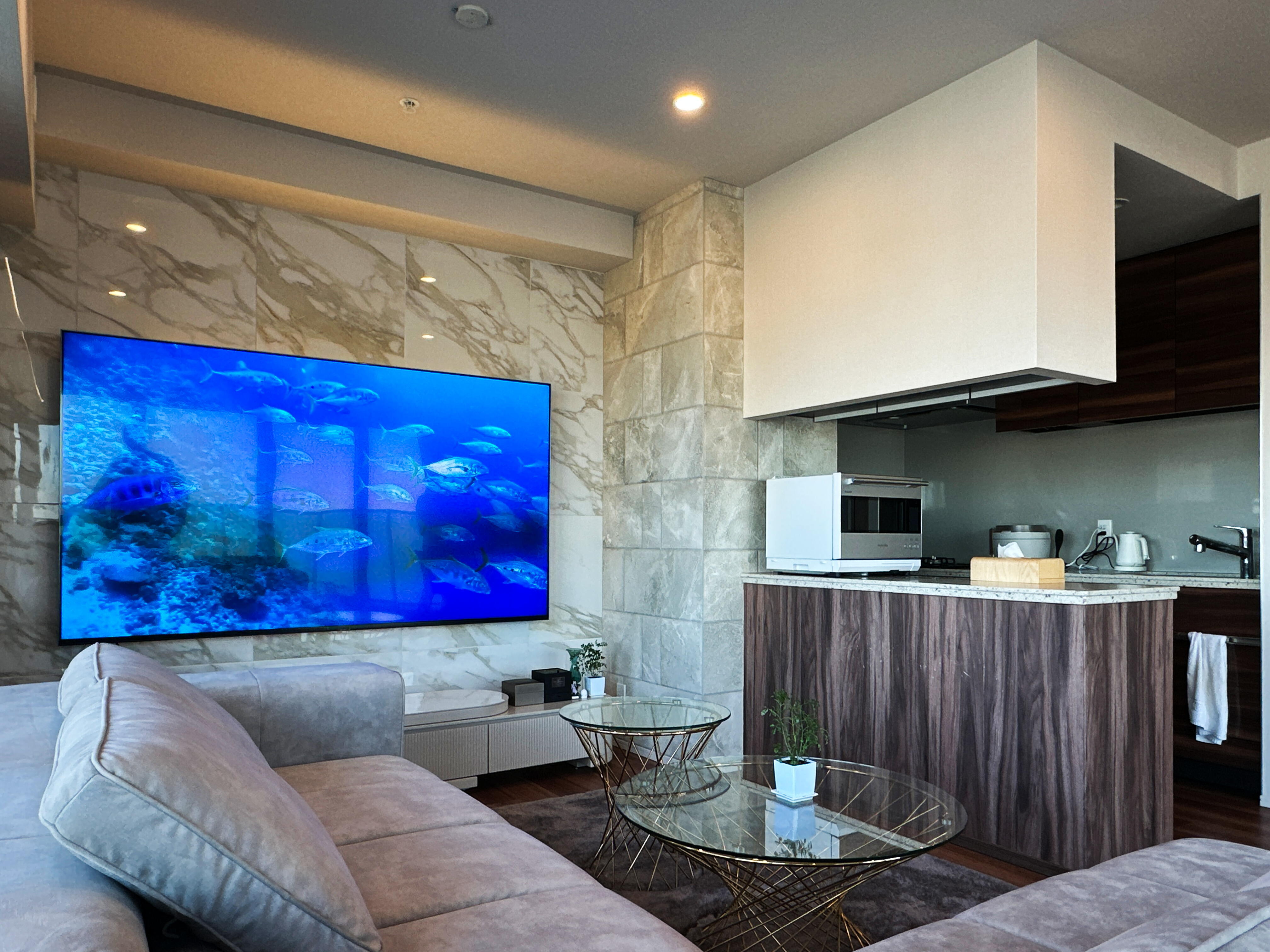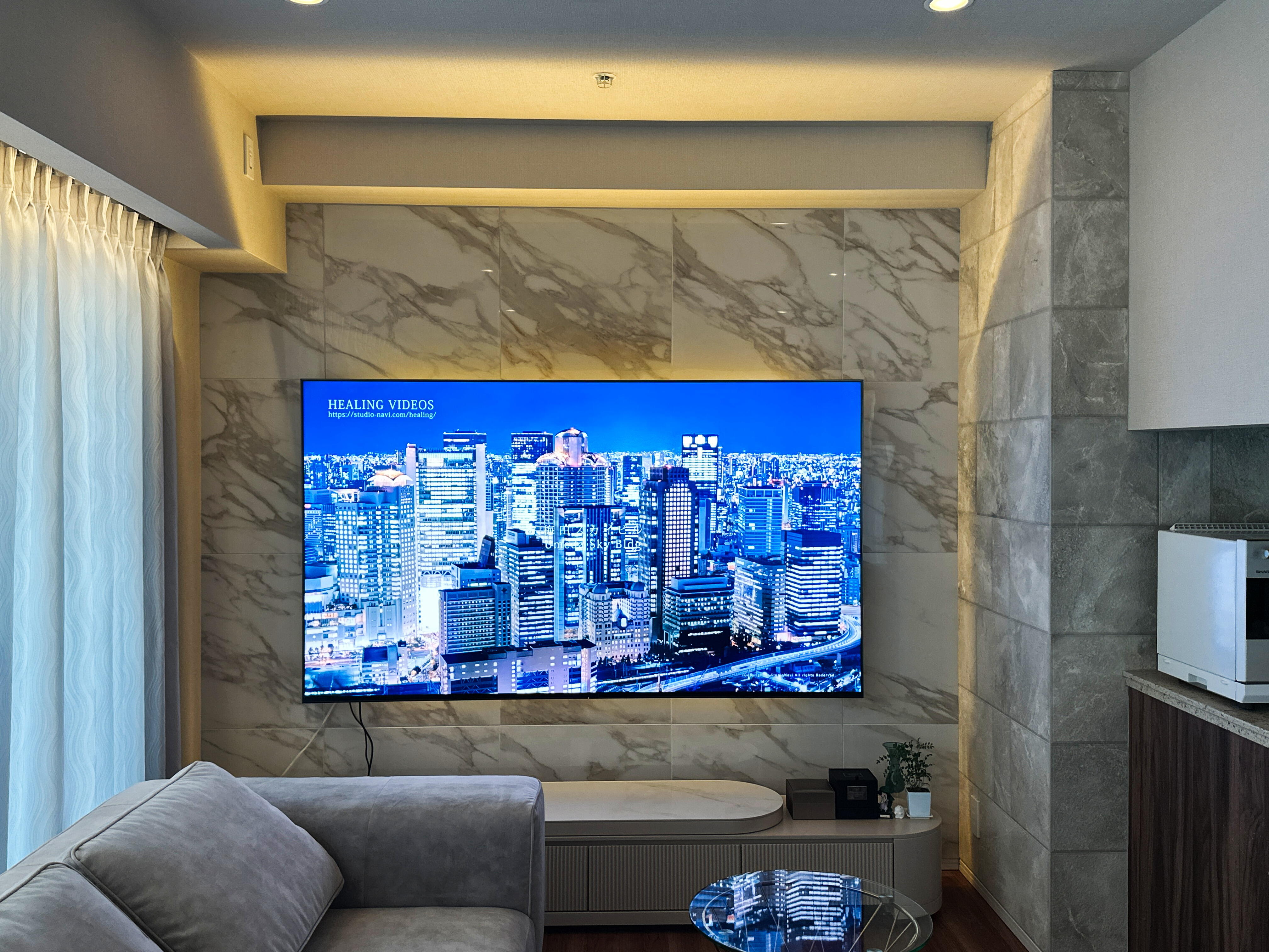 壁掛けTV×石調タイルで高級感UP! 間接照明でホテルライクな演出! 内装だけのリフォームでも、ここまで変わる! より詳しく見たい方はクラテルリノベページでご紹介しております。<ここをクリック>