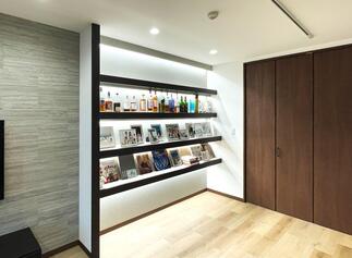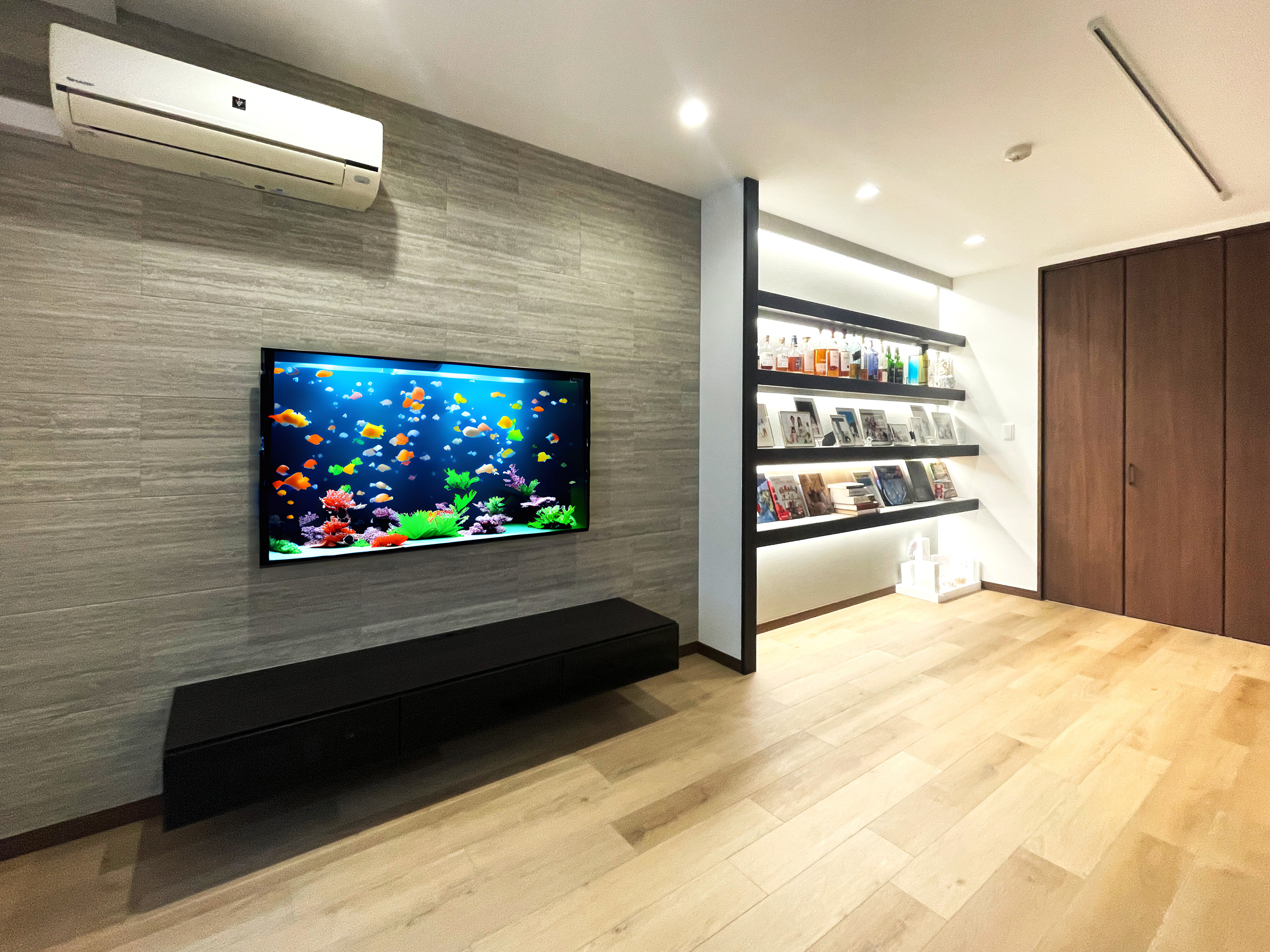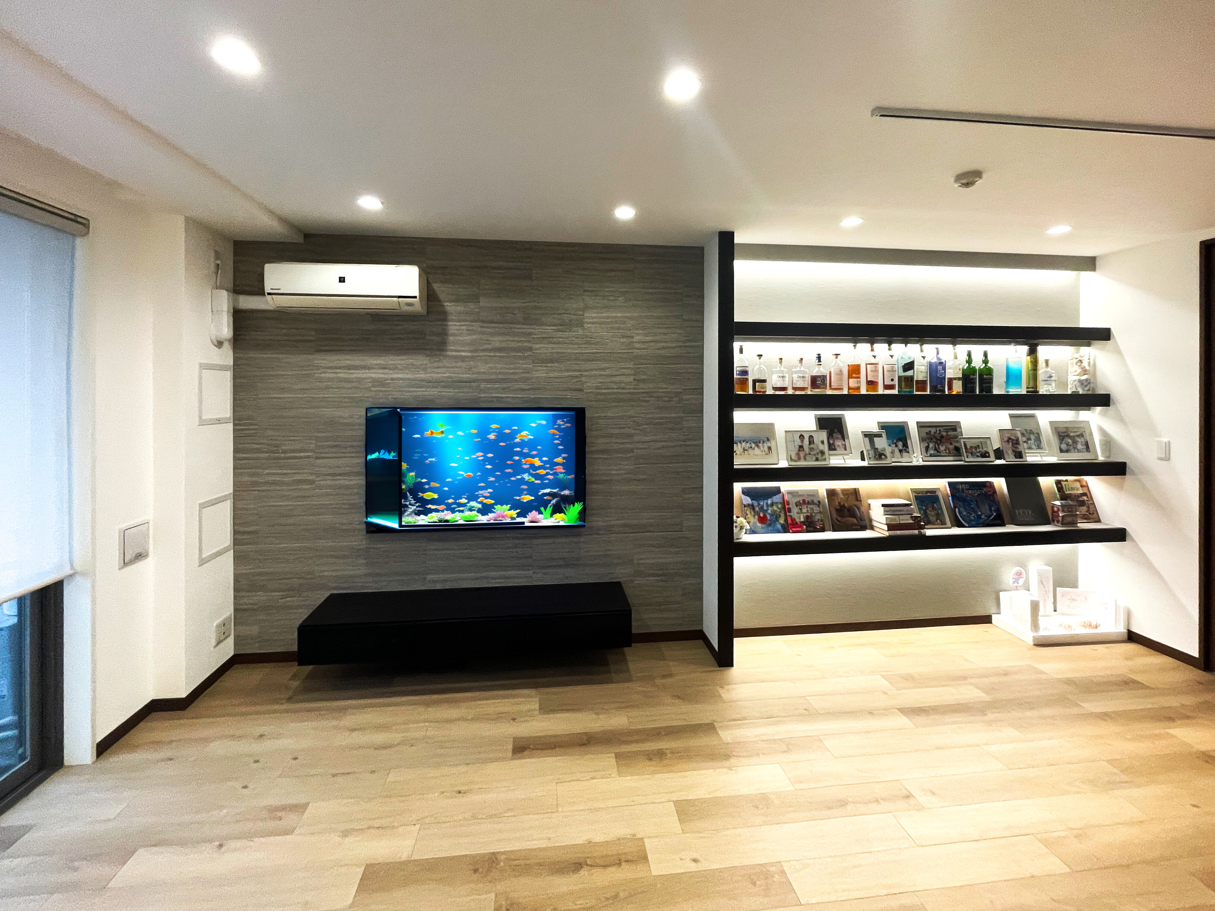 デザインとパースの活用 当社には、設計デザインをもとに3Dパースを作成する専門部署があります。 言葉やイメージ写真だけでは伝わりにくい部分も、立体的なパースで確認しながら、棚の奥行き・高さ・照明の入り方まで細かく調整していきました。 「完成後の暮らしが想像できたことで、安心して決断できた」 そう感じていただけたことも、印象に残っています。 完成したのは、テレビボードと一体化した背面のアクセント壁と和室だった壁面に造作の壁面飾り棚。 お気に入りのボトルや写真、思い出の品が自然と並び、 “収納”ではなく、“暮らしを映す背景”としての壁が生まれました。 和室を解体したことでリビングはより広く、光と視線が伸びる空間に。 ただ広げるだけではなく、その家族らしさがにじむリビングへと生まれ変わりました。