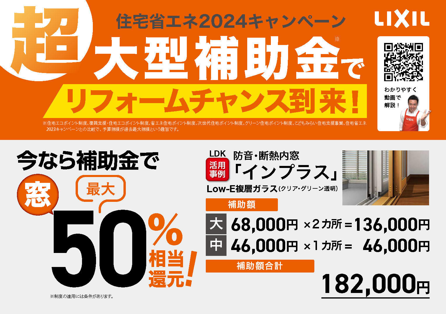 既存住宅の窓・ドアを省エネ効果の高い断熱窓・ドアに改修する費用に対して、補助金がもらえる制度です。補助対象工事の内容に応じて、一戸当たり、5万円から最大200万円までの補助金が交付されます。