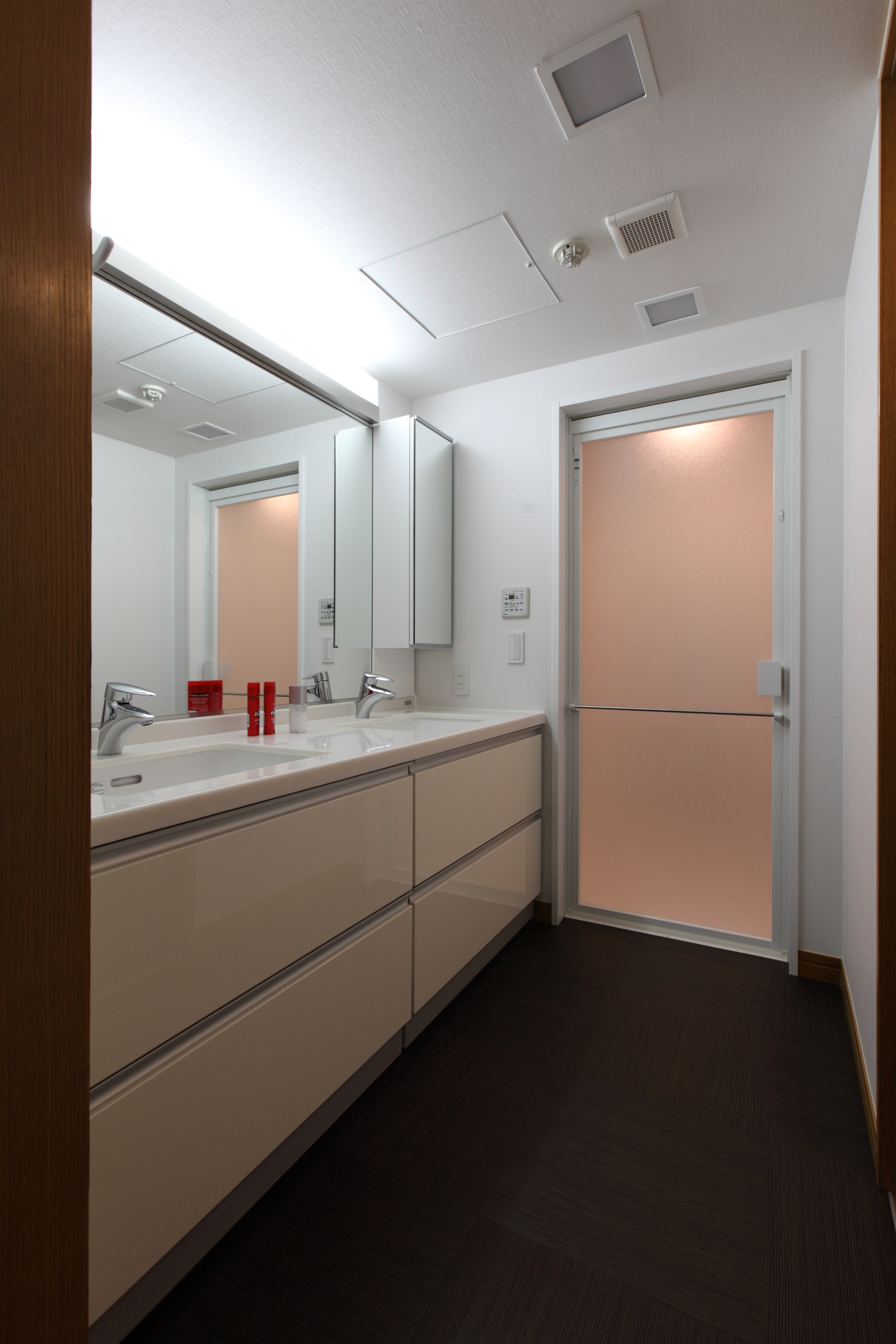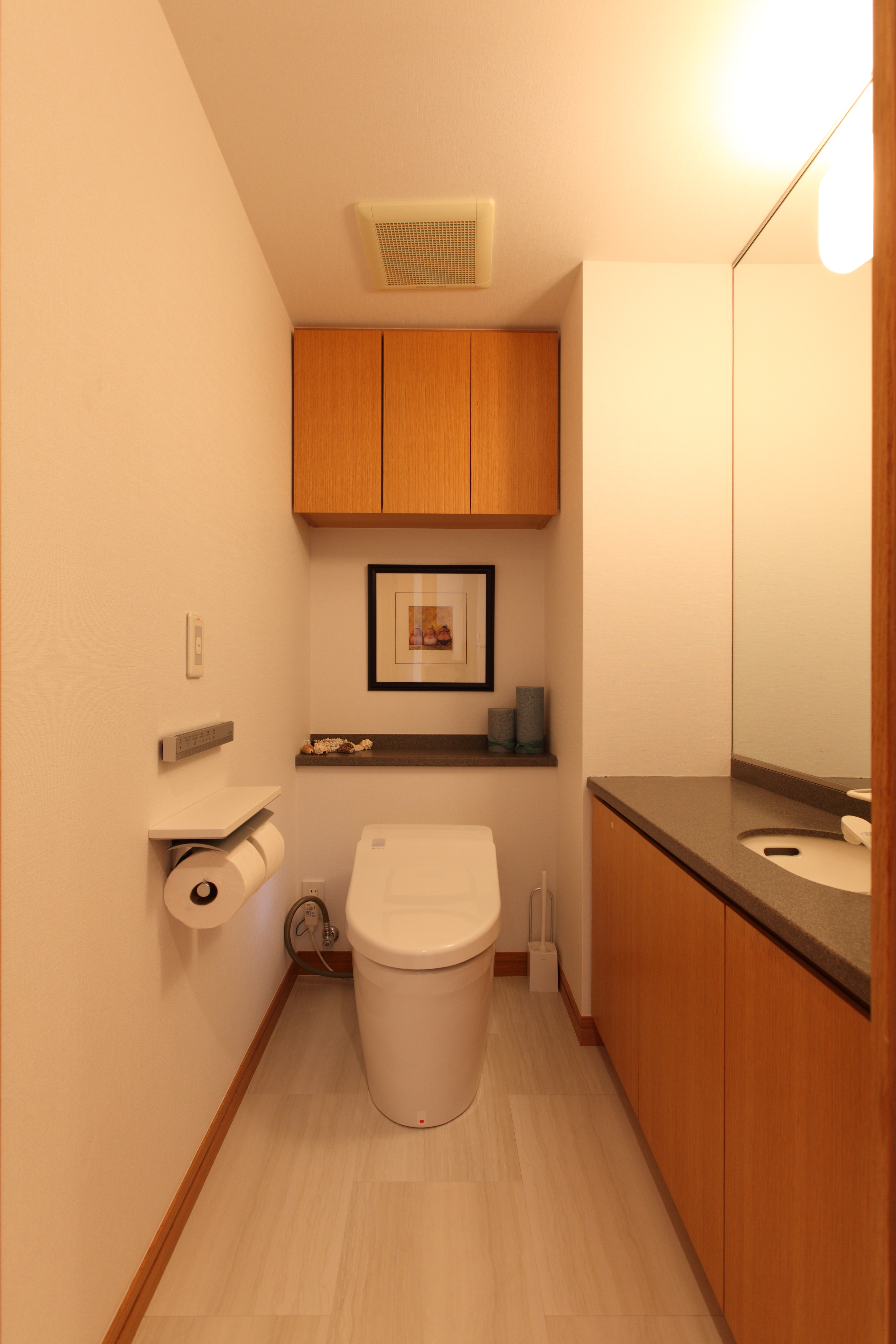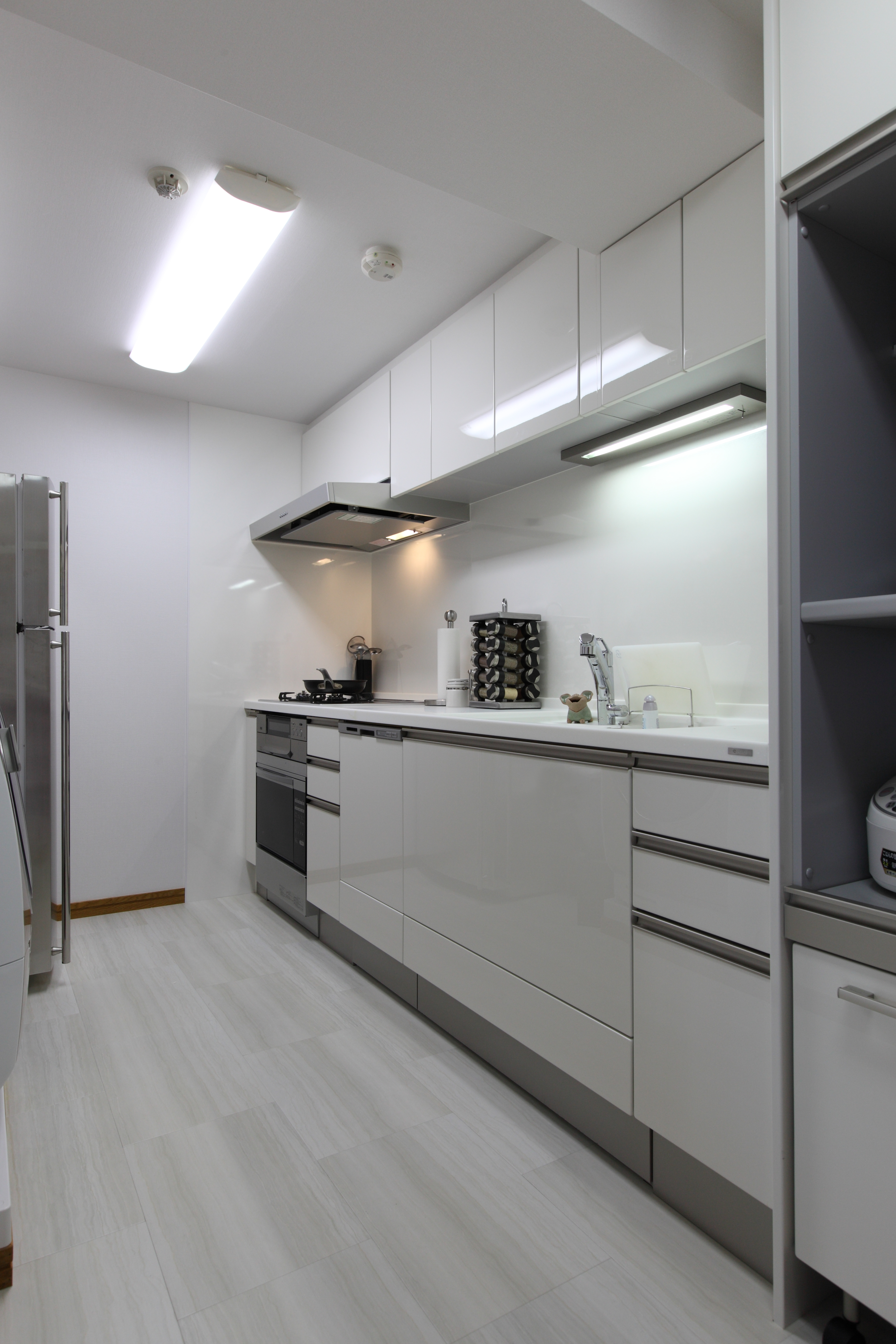 T様のお住まいは六本木ヒルズを間近に望む、築14年の大型マンションです。広さは120㎡の3LDKでしたが、「数字ほどには広さは感じられない」とT様は思ったそうです。キッチンも不満でした。建物の一番奥にあり、従来はコの字配置の独立型。入口も狭く、リビングとは完全に分離した形です。それを今回、オープンなキッチンにリフォームしました。トイレを洗面室そばに移設し広くなったところに配膳台というべきワークカウンターを設置。キッチンもⅡ列の配置に変更。これによりリビングとの一体感が生まれました。