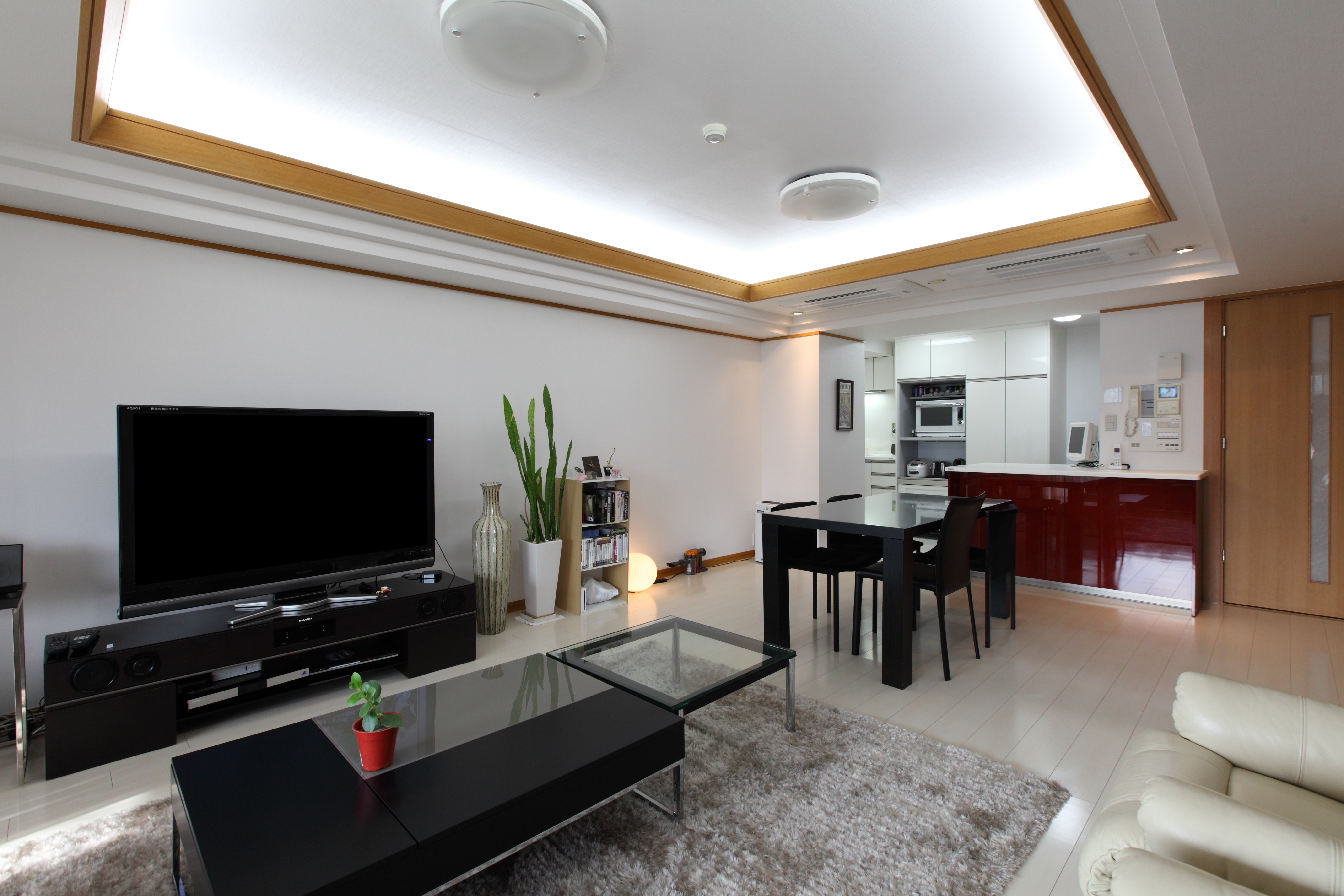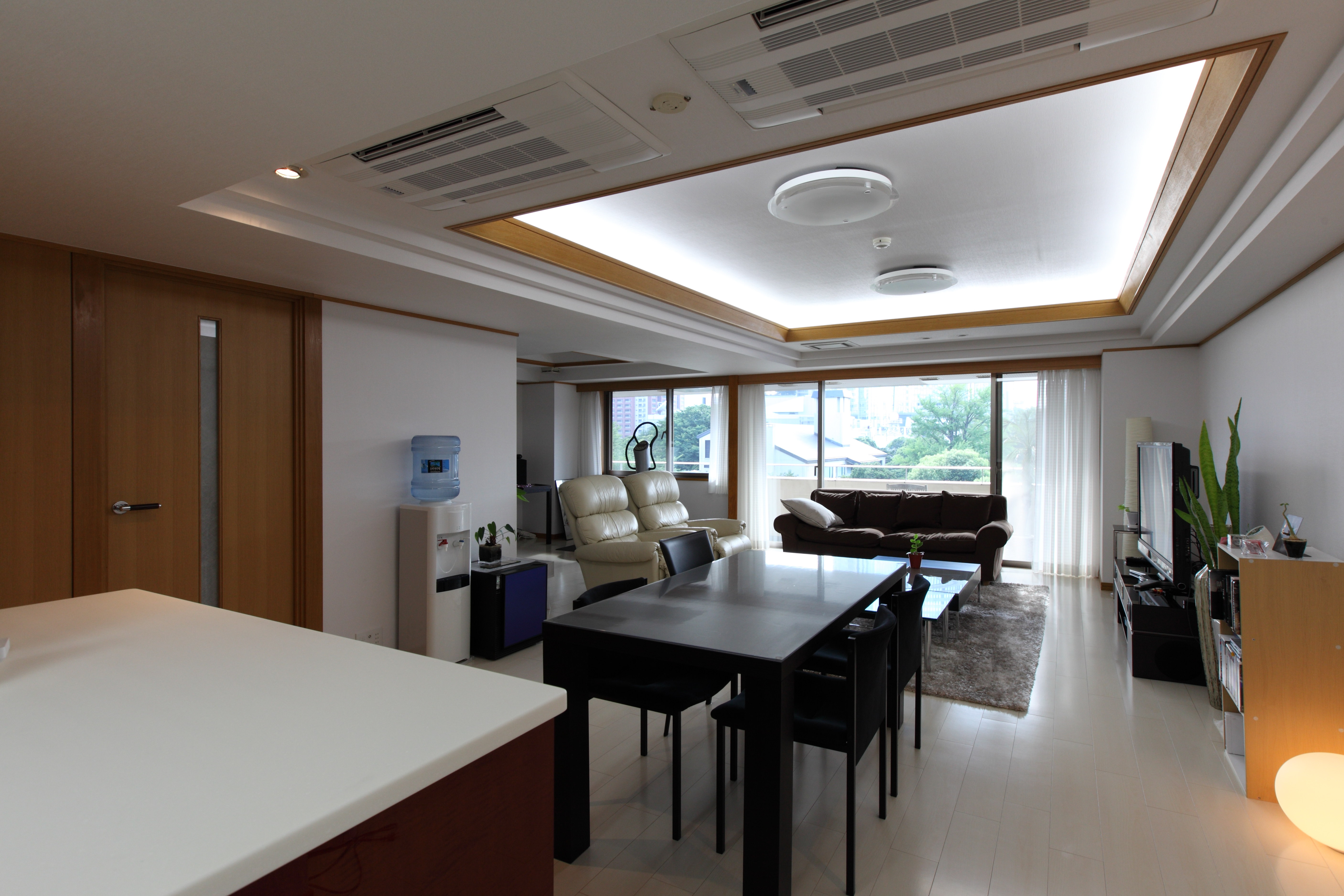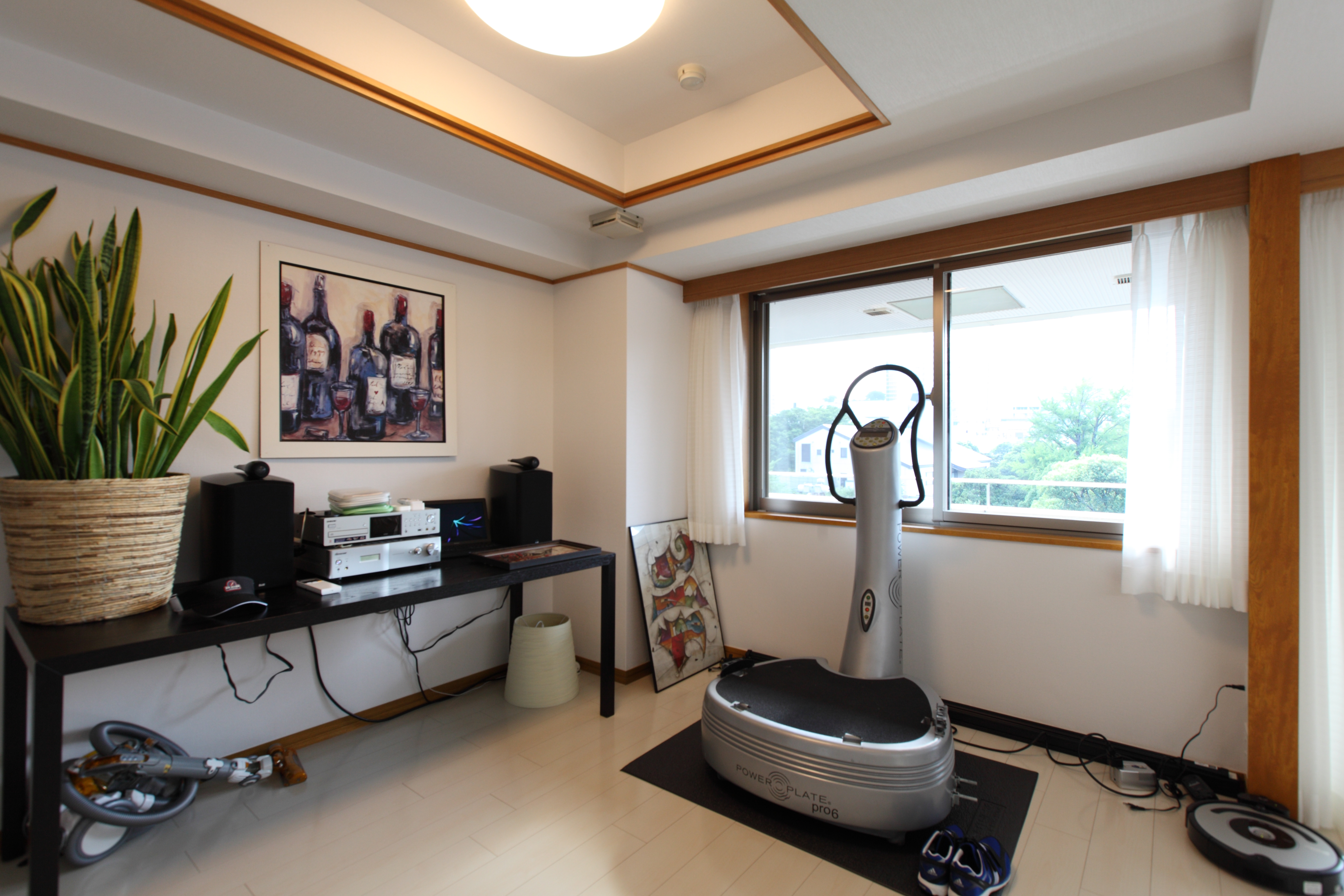 リビングに隣接している洋室の壁を取り払い、広々としたLDKに改修。 これによりゆとりが生まれただけでなく、眺望も格段に良くなりました。 目の前にはグリーンスポットもあり、眺めるだけでも心が癒されます。 またリビングの一角には体力づくりのためのランニングマシンも置かれています。