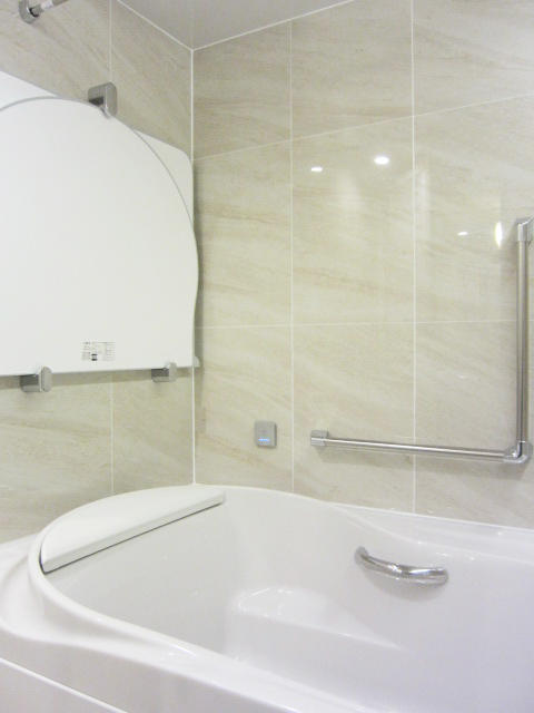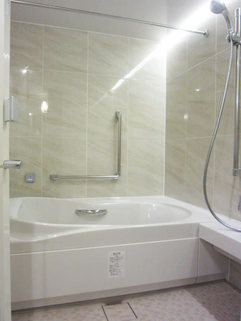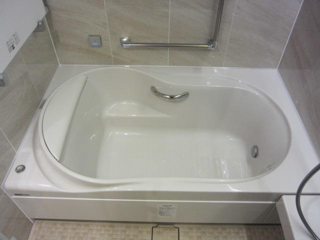 浴槽はハイバックワイド浴槽をお選び頂きました。ハイバックワイド浴槽は包み込まれるような安心感を育むだけでなく、ひじをあずけるアームレストと小物置スペースでより長い時を快適にします。