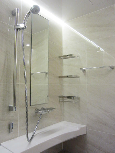 壁パネルは全面400×600mm角タイル調のブライト(ロックストーンホワイト)をお選び頂きました。天然石を再現したこちらのパネルは気品に満ちた柄と釉薬の艶のある表情が、浴室空間に高級感を演出します。カウンターや床材などは全体的に白・ベージュを基調とした明るいものを選定。手すりやシャワー・収納棚などは全てメタル調で統一しました。スパージュの特徴ともいえるライン照明。浴室の天井ラインに合わせた光のラインは壁面のマテリアルの表情を効果的に引きだし、変化させます。上質な空間にふさわしい照明です。