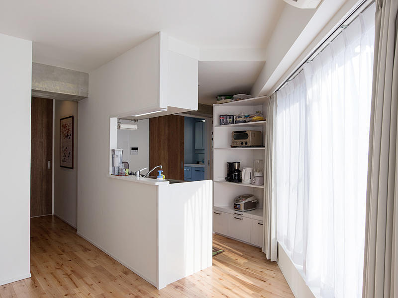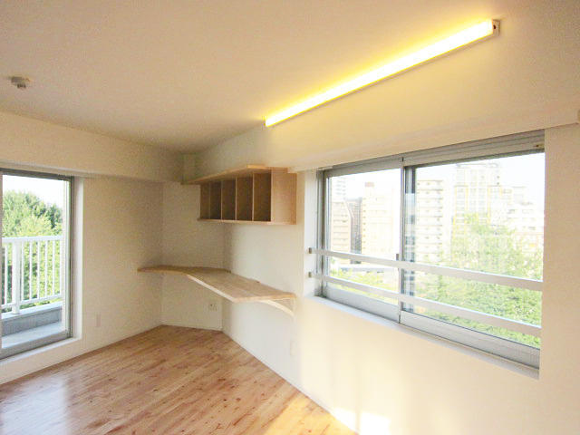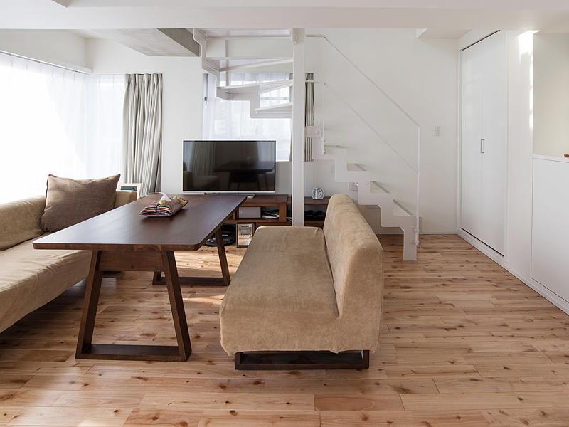 メゾネットタイプのマンションにお引越しされたT様。トイレの位置が気になるなど、間取りや内装を含む全面的なリフォームをご希望されていました。水廻り、生活導線や収納などじっくりとお打合せさせていただきました。メゾネット上階(8階)はご主人様の書斎と寝室、ウォークインクローゼットがあります。変形の間取りにあうように書斎をデザイン。収納とデスクを造作しました。クローゼットの壁を一部撤去してオープンにしたことにより、ベッドからの導線がスムースになりました。