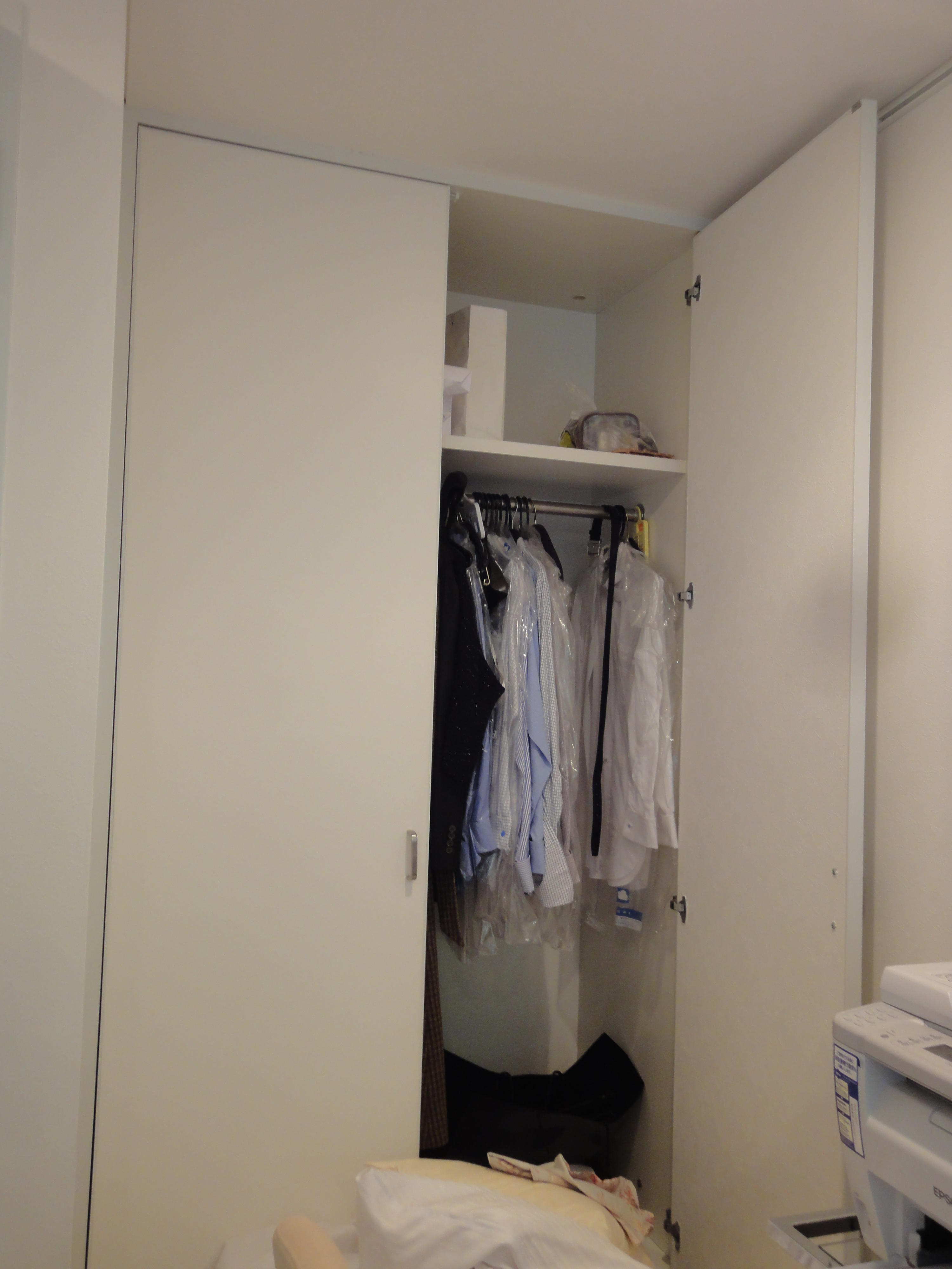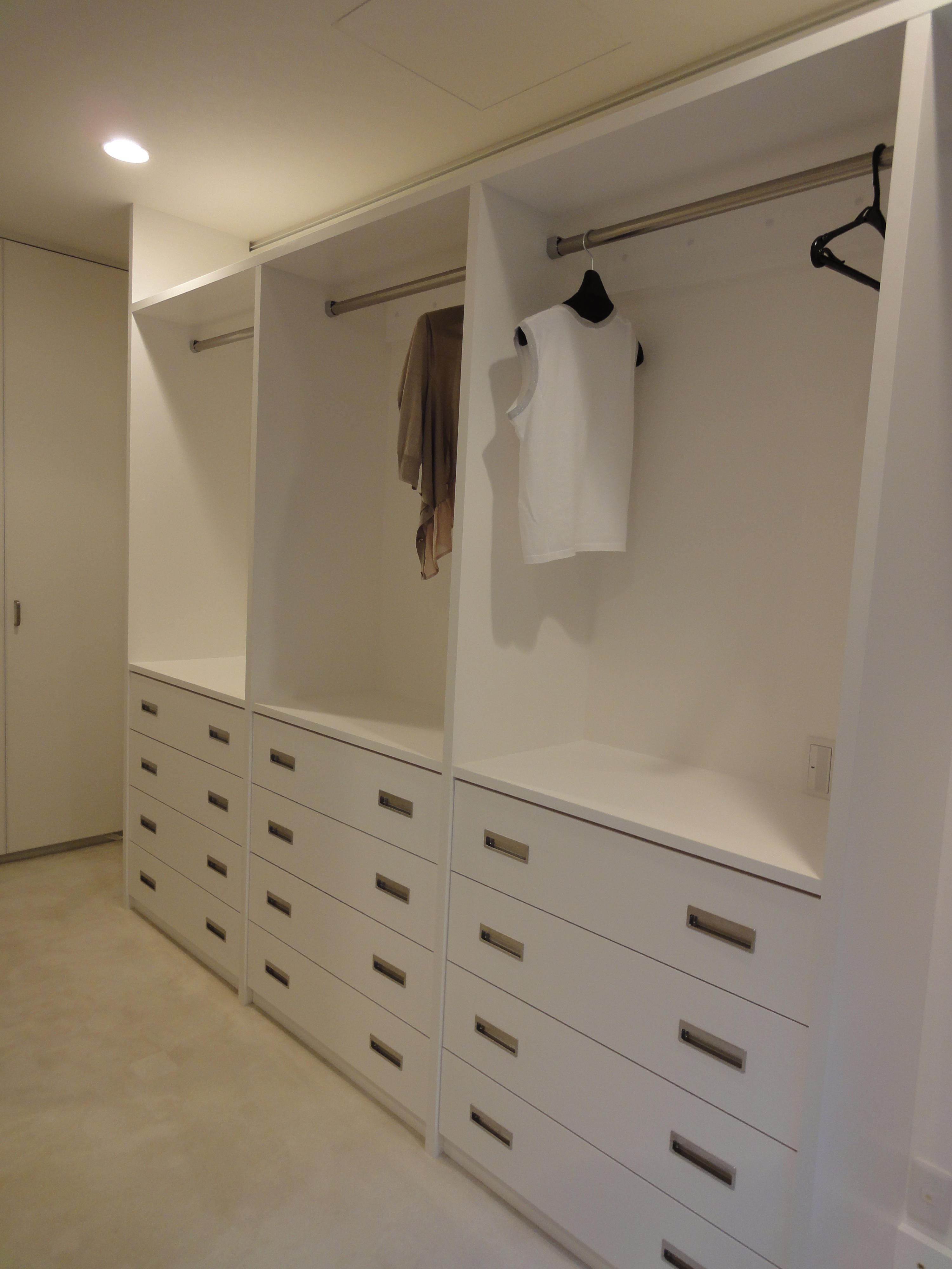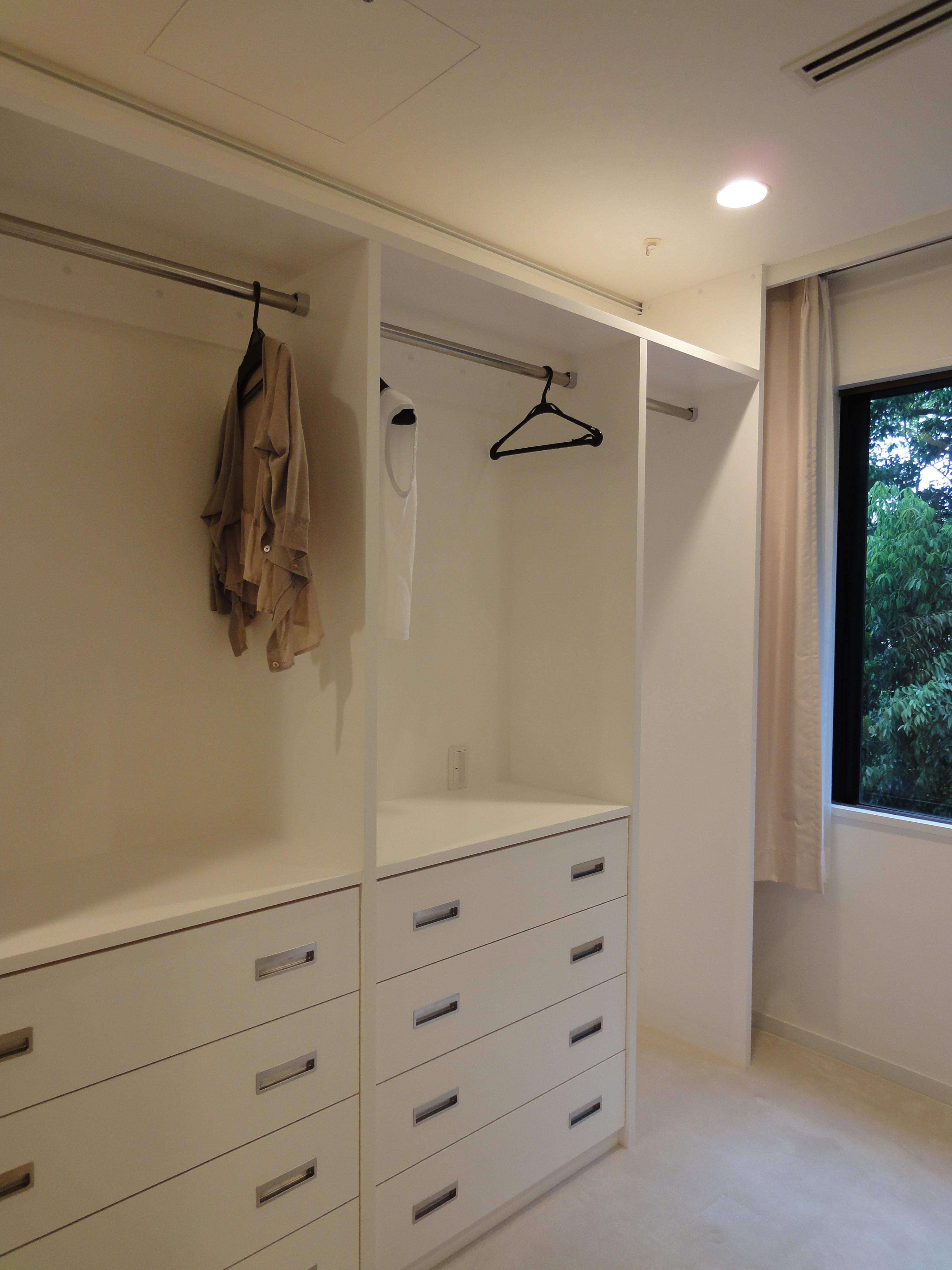 既存の洋室には備え付けのクローゼットがありましたが、お持ちの服を全て収納できる大きさではありませんでした。 約6畳の洋室の両左右にW2400・W3300の洋服収納を造作。完全オーダーの収納で、お店のような雰囲気の見せる収納のウォークインクローゼットになりました。窓からは陽に照らされとても美しい新緑が見える、素敵な景観のお部屋です。引出しも使いやすいオリジナルな寸法で製作しています。棚板の奥行きは45センチ、奥様のお洋服はほとんど全て棚の内側に納まりました。長めのお洋服と、通常の寸法に納まる服を分けて設置し空間を効率よく活用しています。引き出し上部はカウンターにしているので、小物や戻ってきたクリーニング品の置き場として大活躍しています。