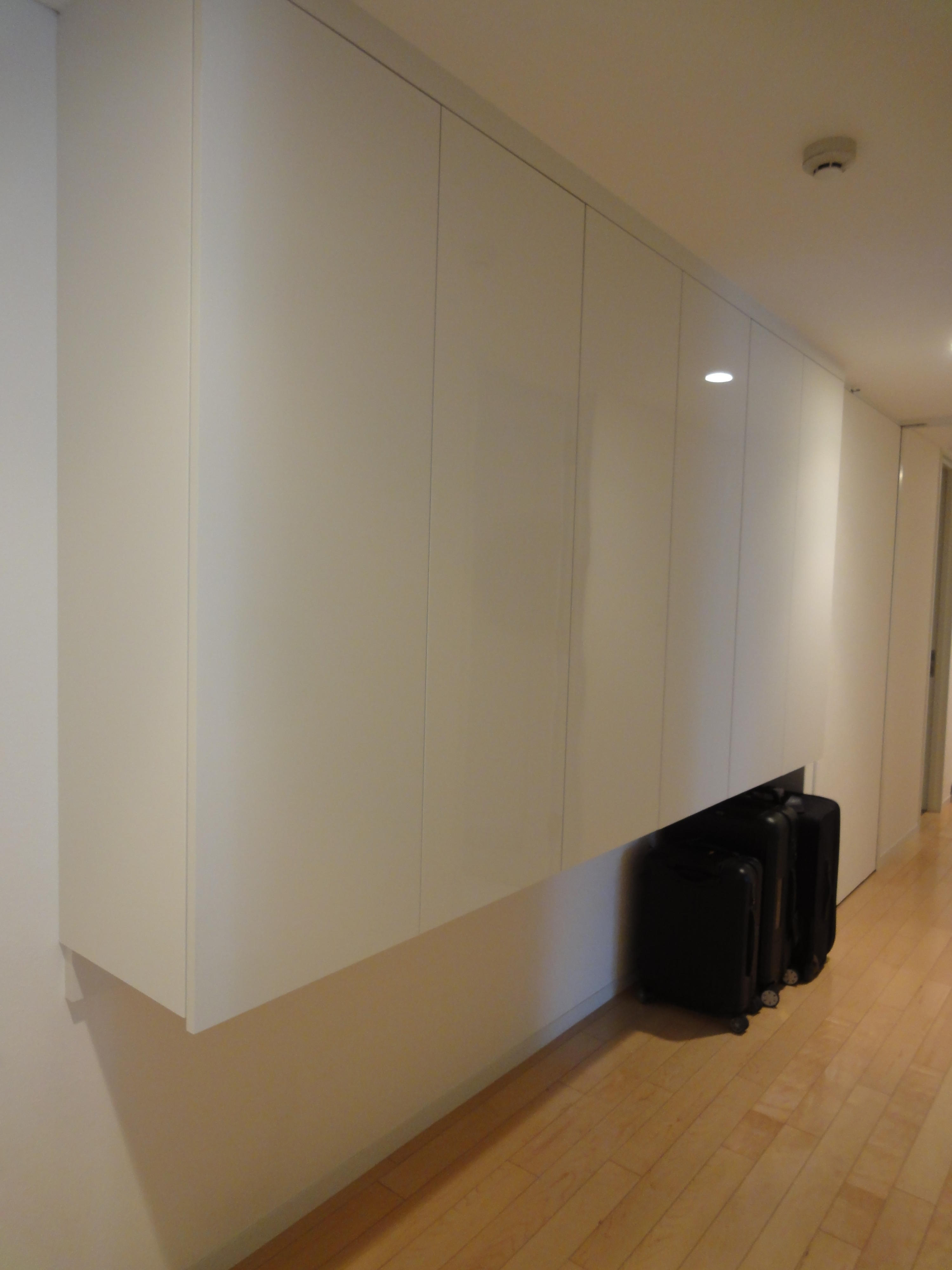 幅1.4mの広い廊下に奥行き40cmの収納を造作。ご旅行や出張の際使うキャリーケースを置くため、下のほうはスペースを空けて造作しました。