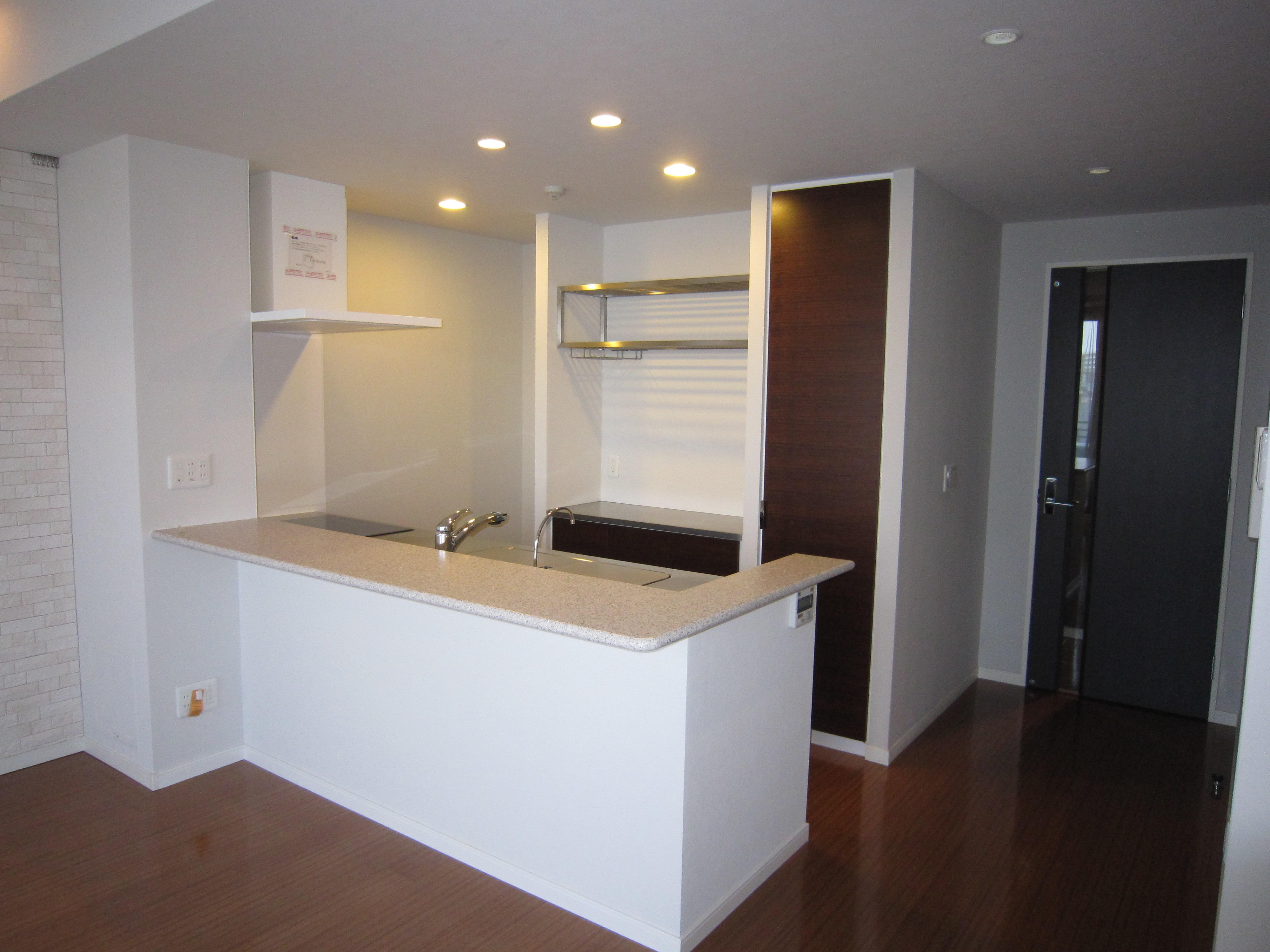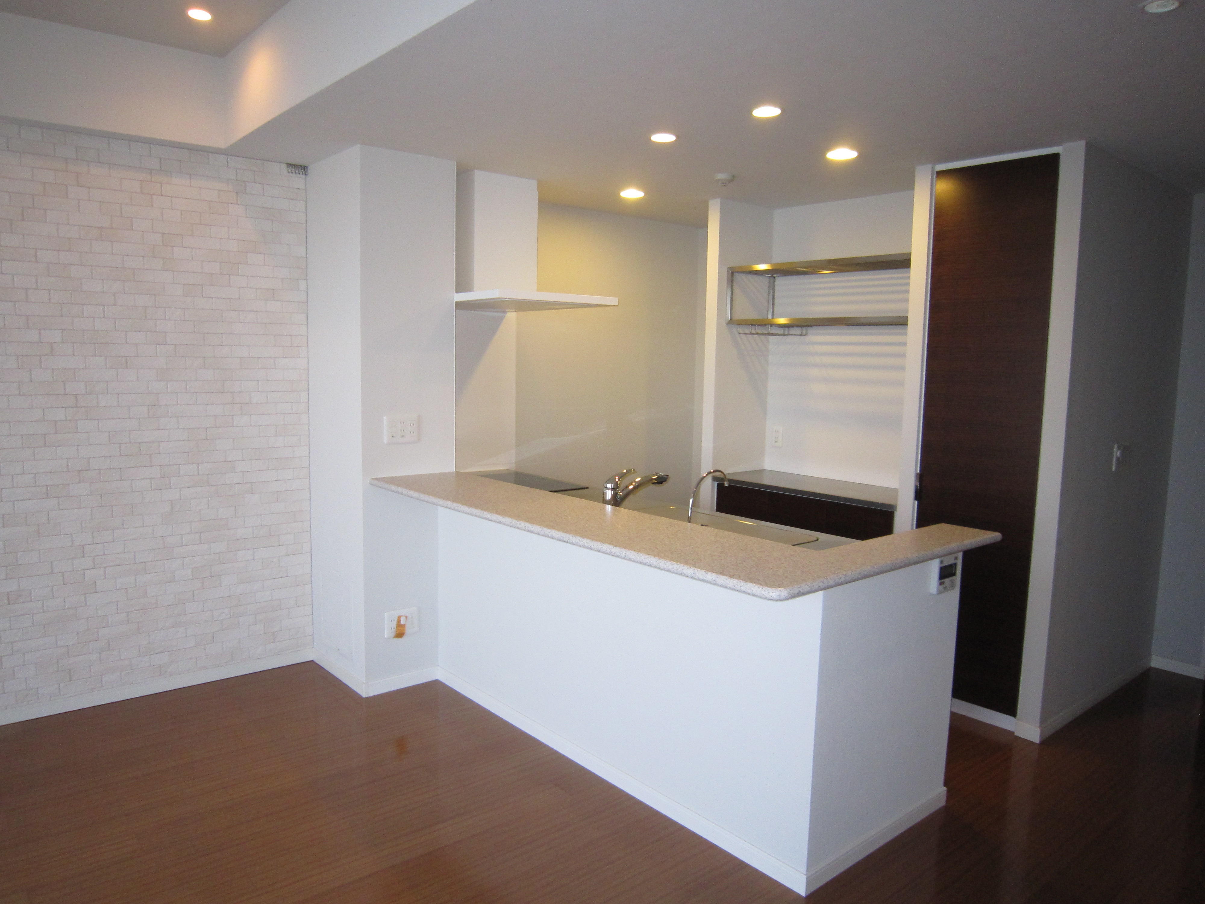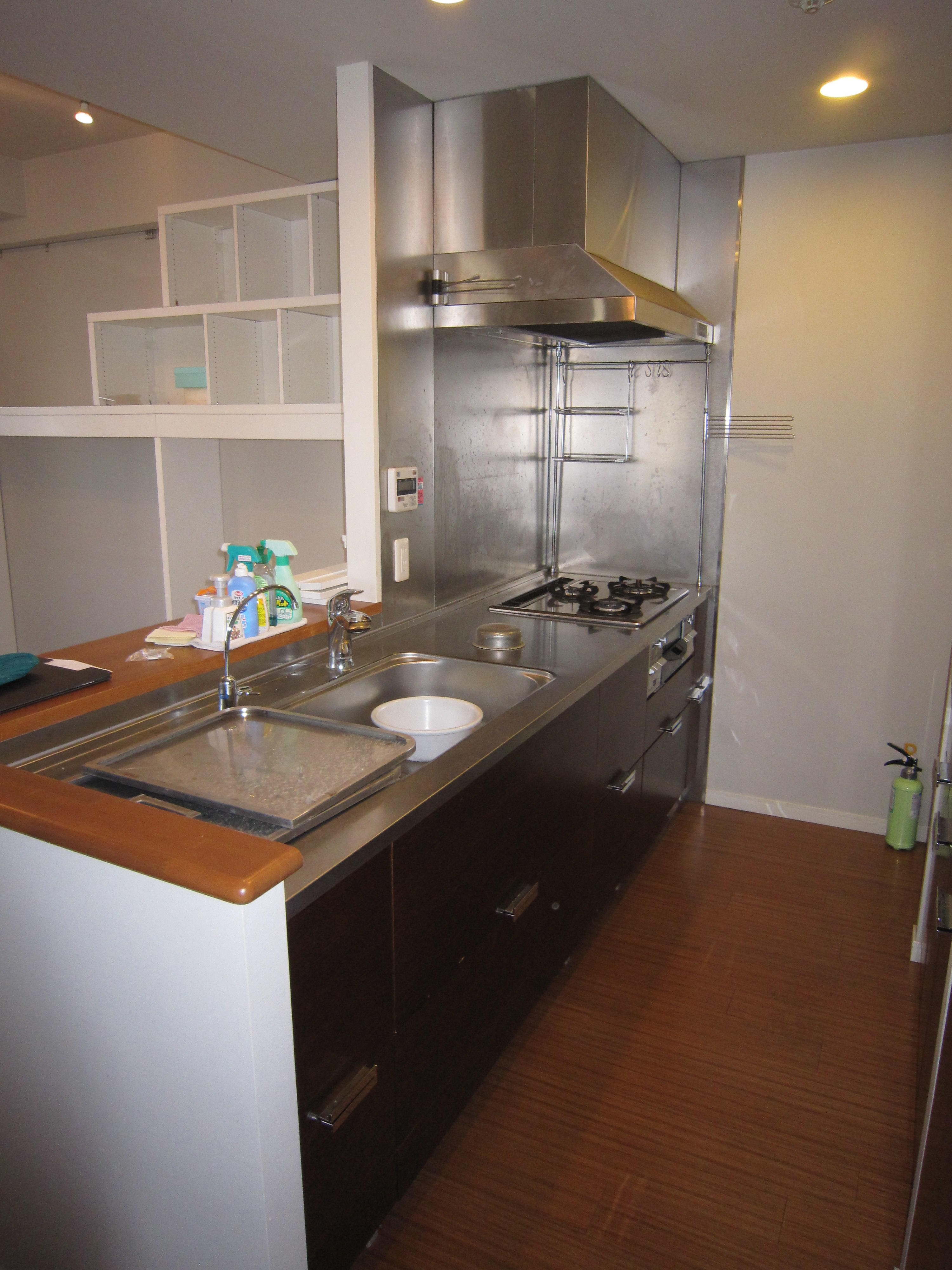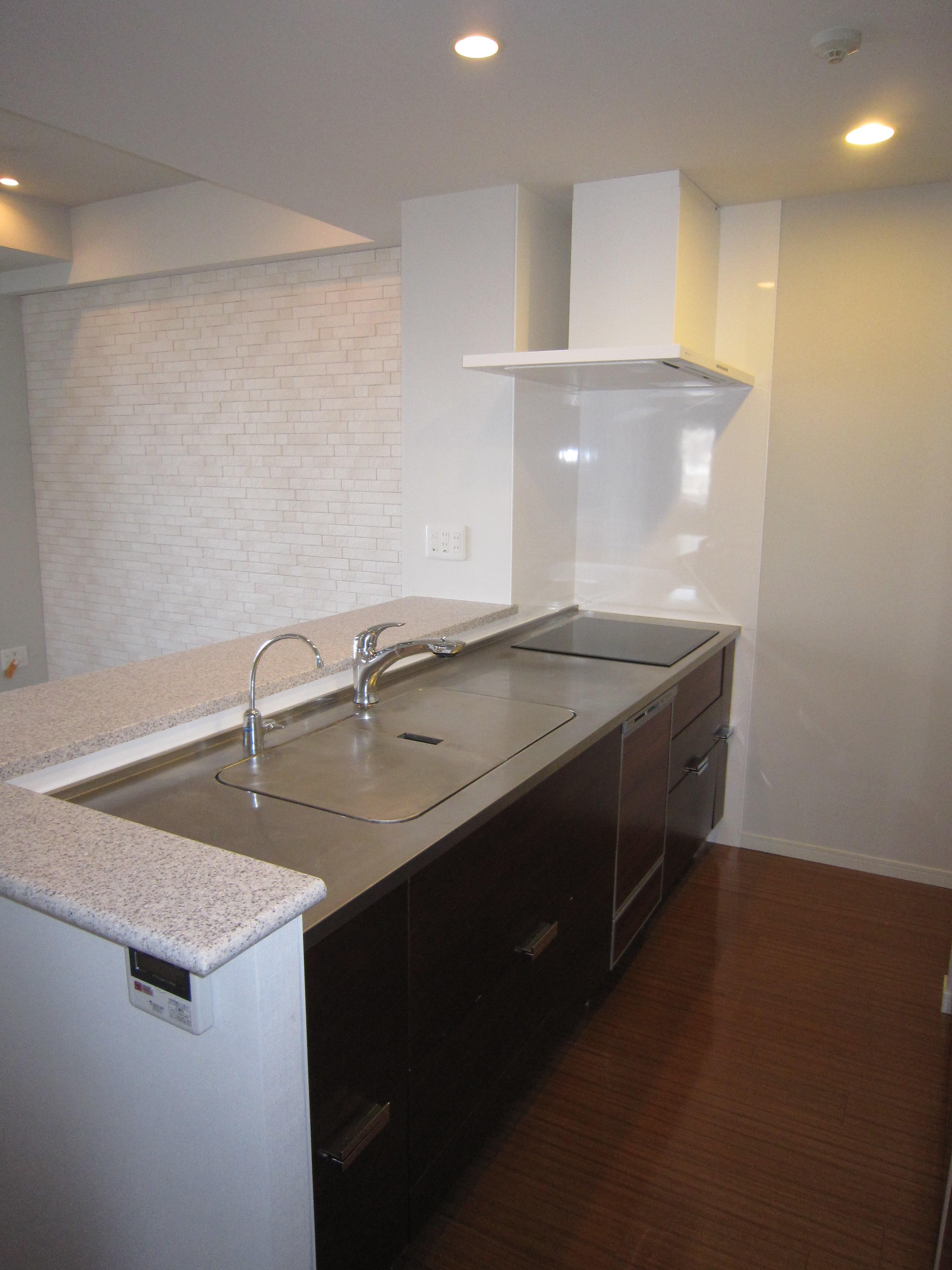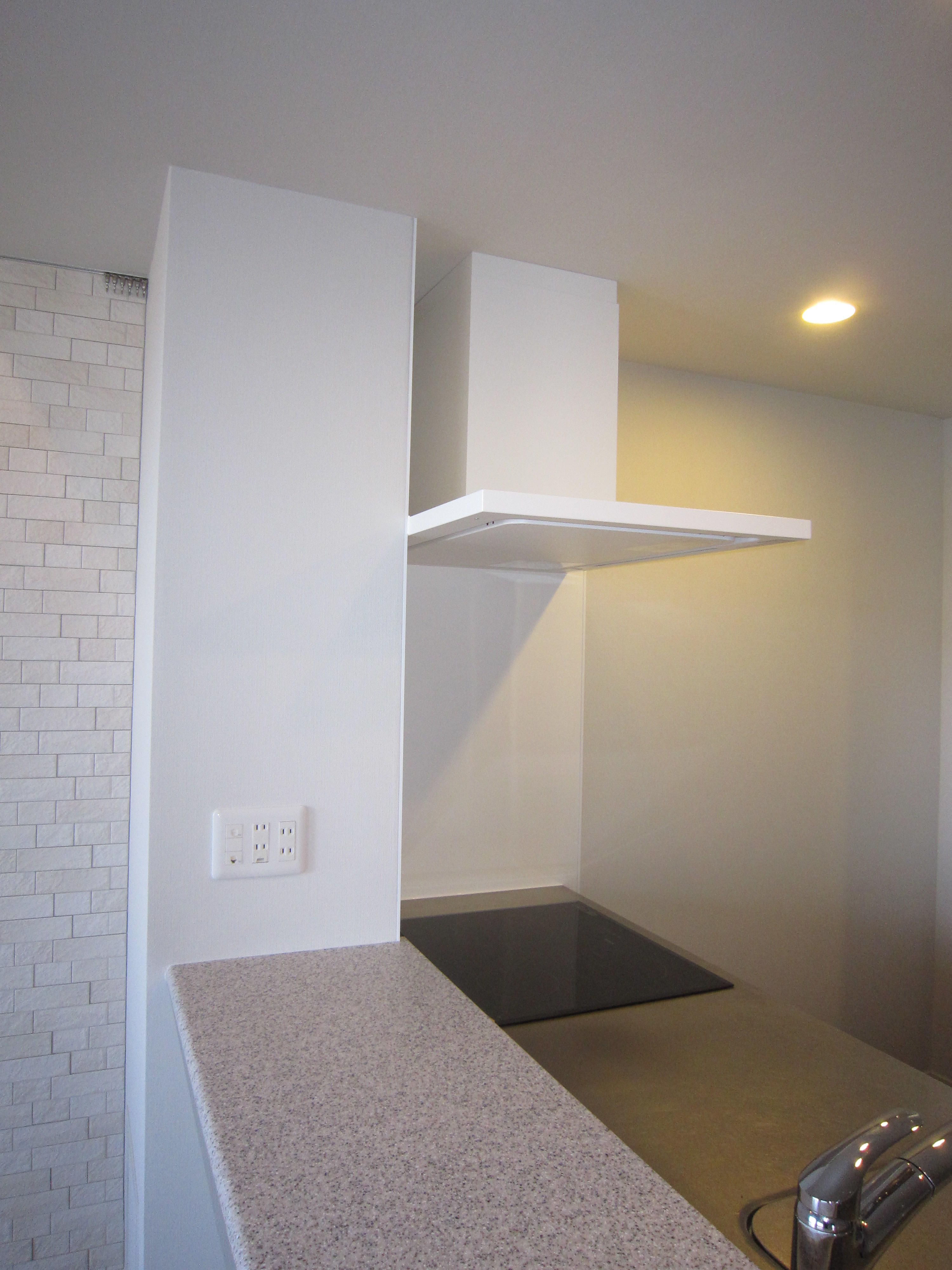 今回キッチン本体は既存利用し、レンジーフード・IH・食洗機などを交換。機能を充実させました。既存のキッチンはもともと対面の開放的なキッチンでしたが、コンロの裏側に袖壁があり、コンロ前が少し閉鎖的でした。裏側にはパイプスペースがあり完全に壁を撤去することはできませんが、できるだけ壁を撤去してより開放的なキッチンにしました。既存は90センチのレンジフードでしたが、壁を撤去したためレンジフードが30㎝壁から飛び出してしまう状態に・・・そこで、サイドマントルタイプと言うペニンシュラタイプ(片側が壁に接している対面型)のキッチンに使う物をセレクトすることにしました。そもそも対面用なので一部を壁につけて設置するのはイレギュラーな方法ですが、そこはお客様も開放感を優先することでご理解いただきました。