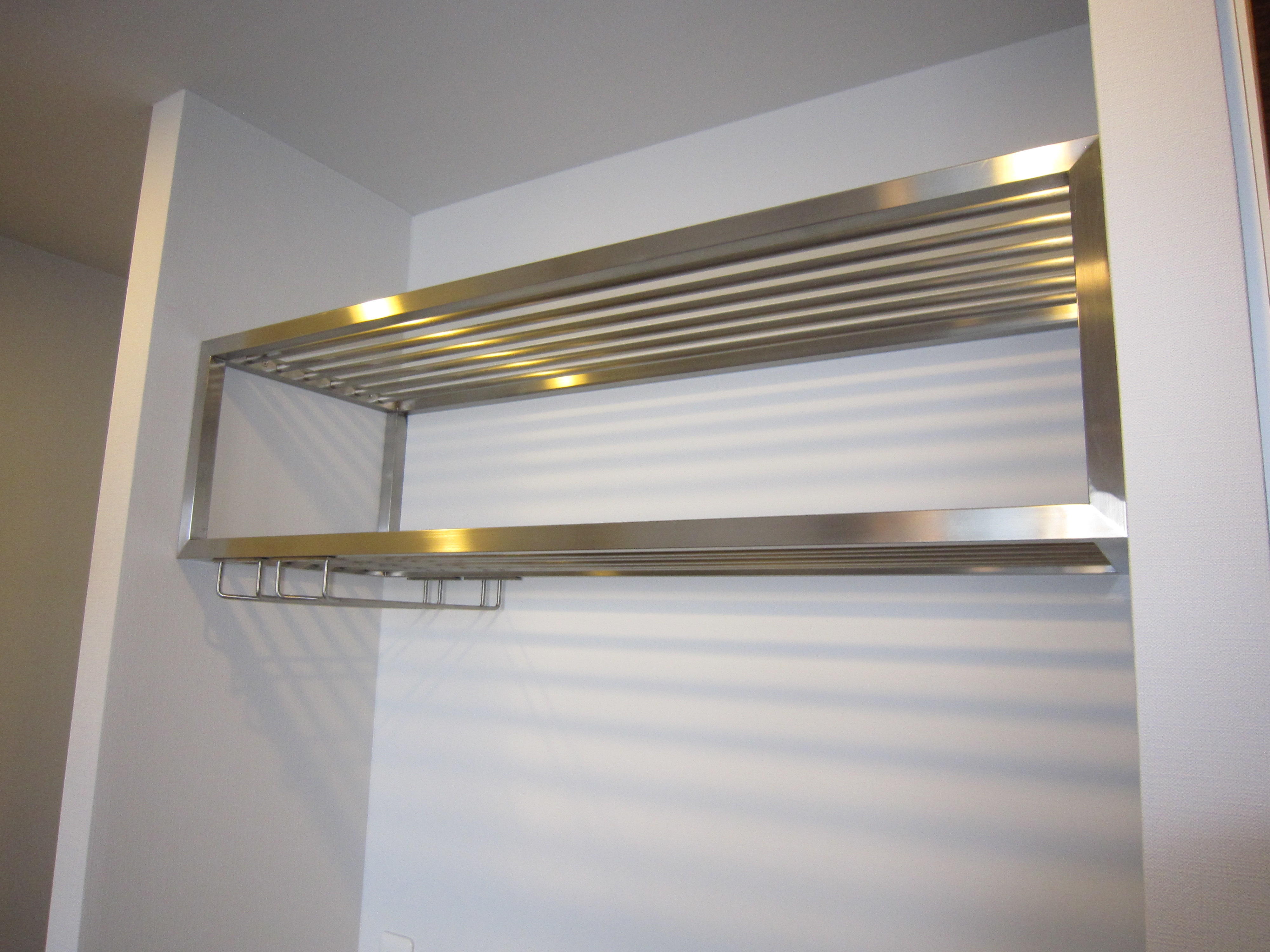 オープンキッチンのバルなどでオシャレに使われているパイプラックを取り付けたいというご希望でした。パイプラックは特注で制作、ワイングラスを逆さまに吊るすためのハンガーで使用したのは<HAFELE(ハーフェレ)>の物です。