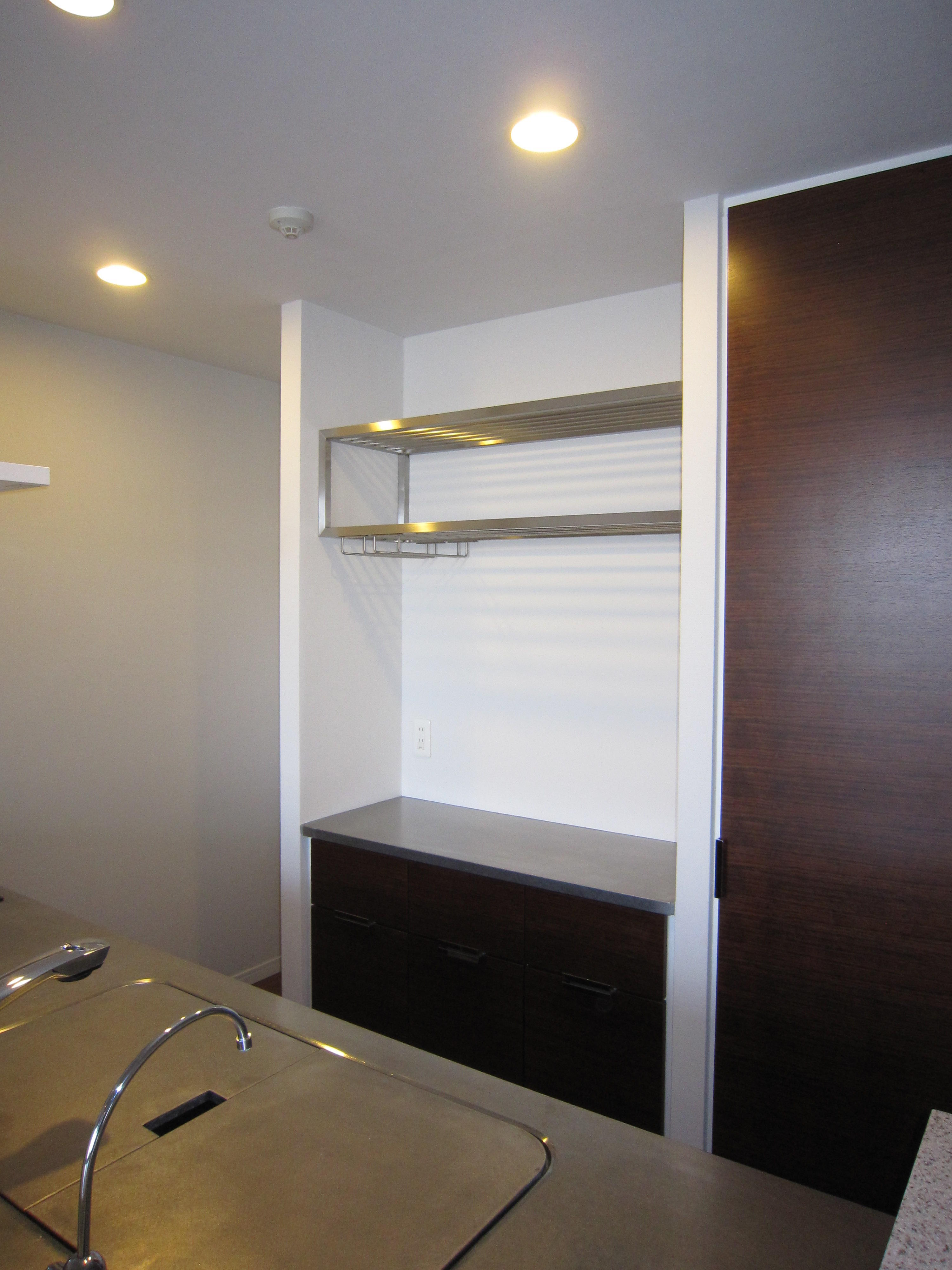 背面収納の吊戸を撤去し、特注パイプラック&グラスホルダーを設置
