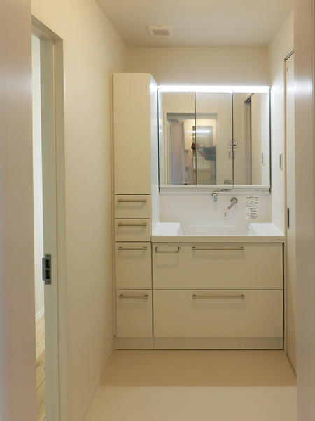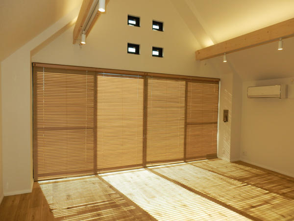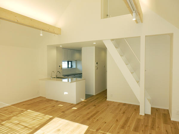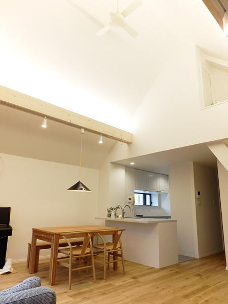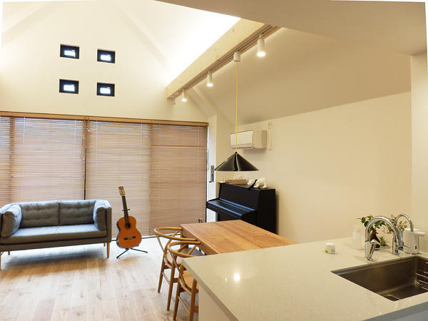 下階は賃貸と事務所スペースで、4階がK様の住居となっています。今回は内装や水周りなど全面的な改修となりました。一番のポイントはリビング。吹き抜けの斜め天井や小窓など既存のデザイン性を活かして、白と無垢の木材のナチュラルなイメージにリフォーム。大きな窓からの自然光と、ダクトレール照明がもたらす白壁の光がまるでフォトスタジオのような空間を生み出しました。