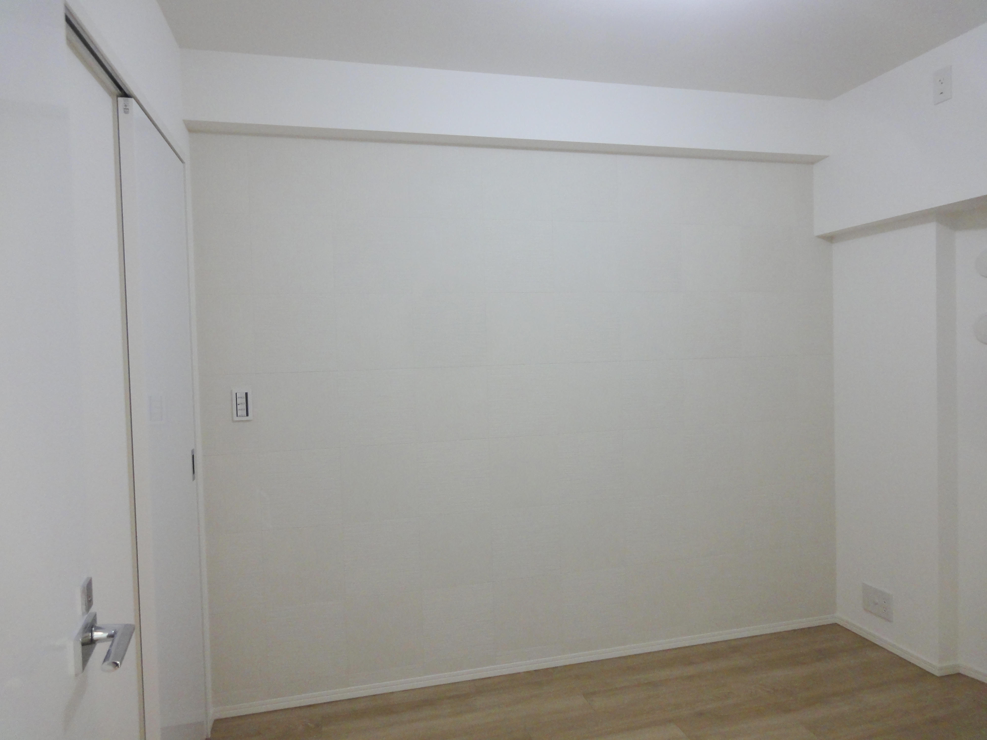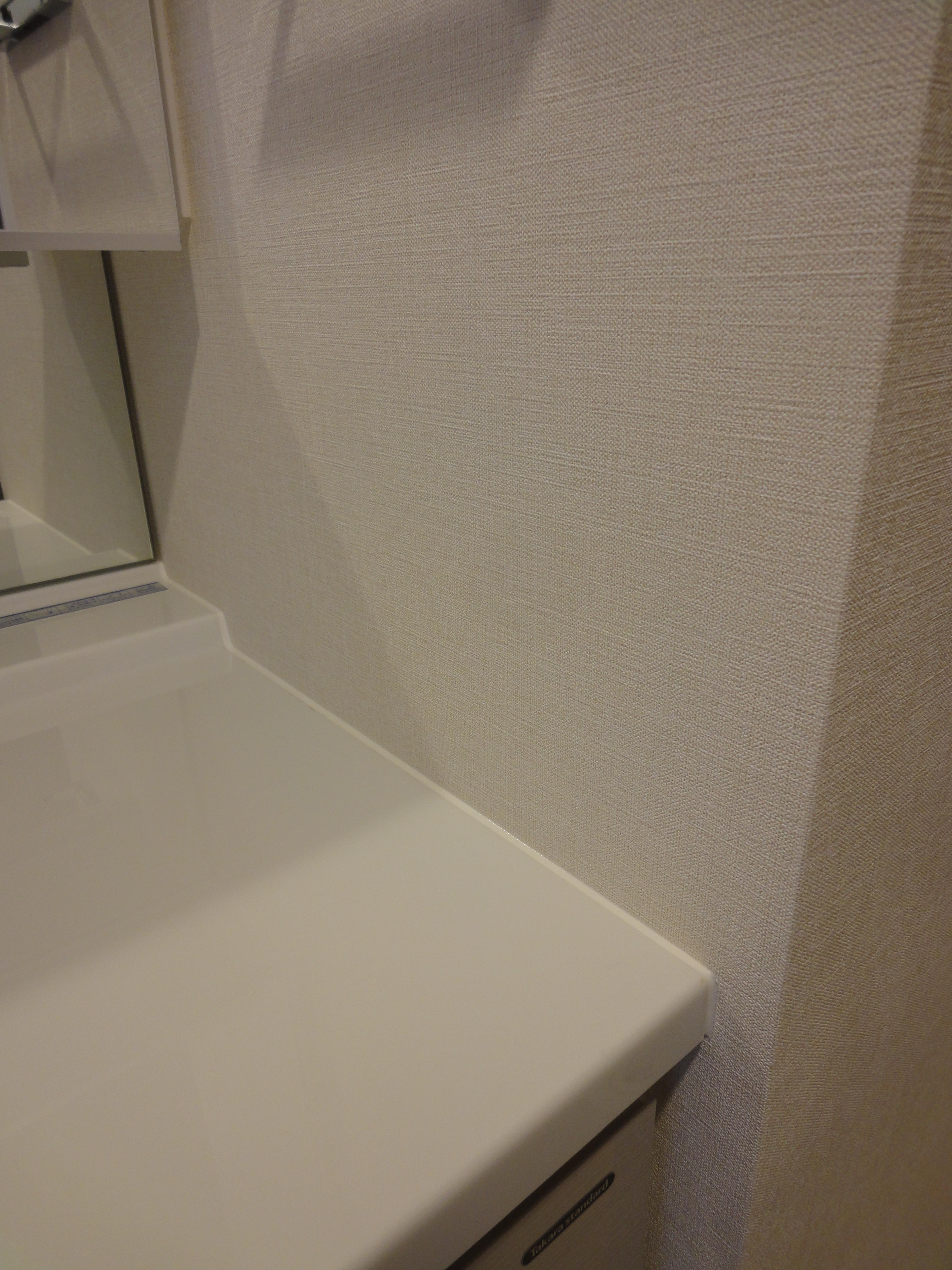 壁の一面にはエコカラットプラスの[たけひご]というシリーズを施工しました。写真だとわかりづらいですが、ストライプ柄を市松模様に貼っています。