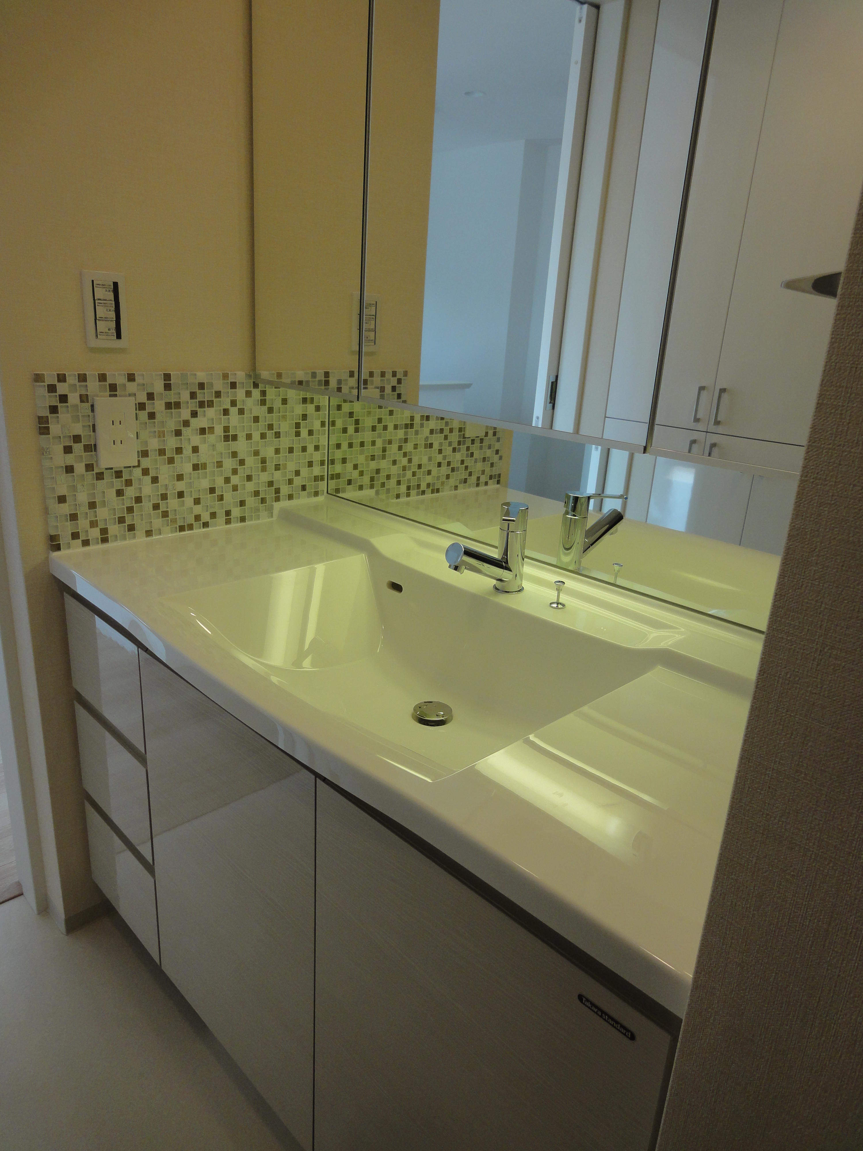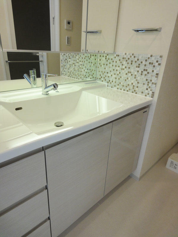 洗面カウンターの両サイドにアベルコ ラビリンスLBR-15というモザイクタイルを施工しました。