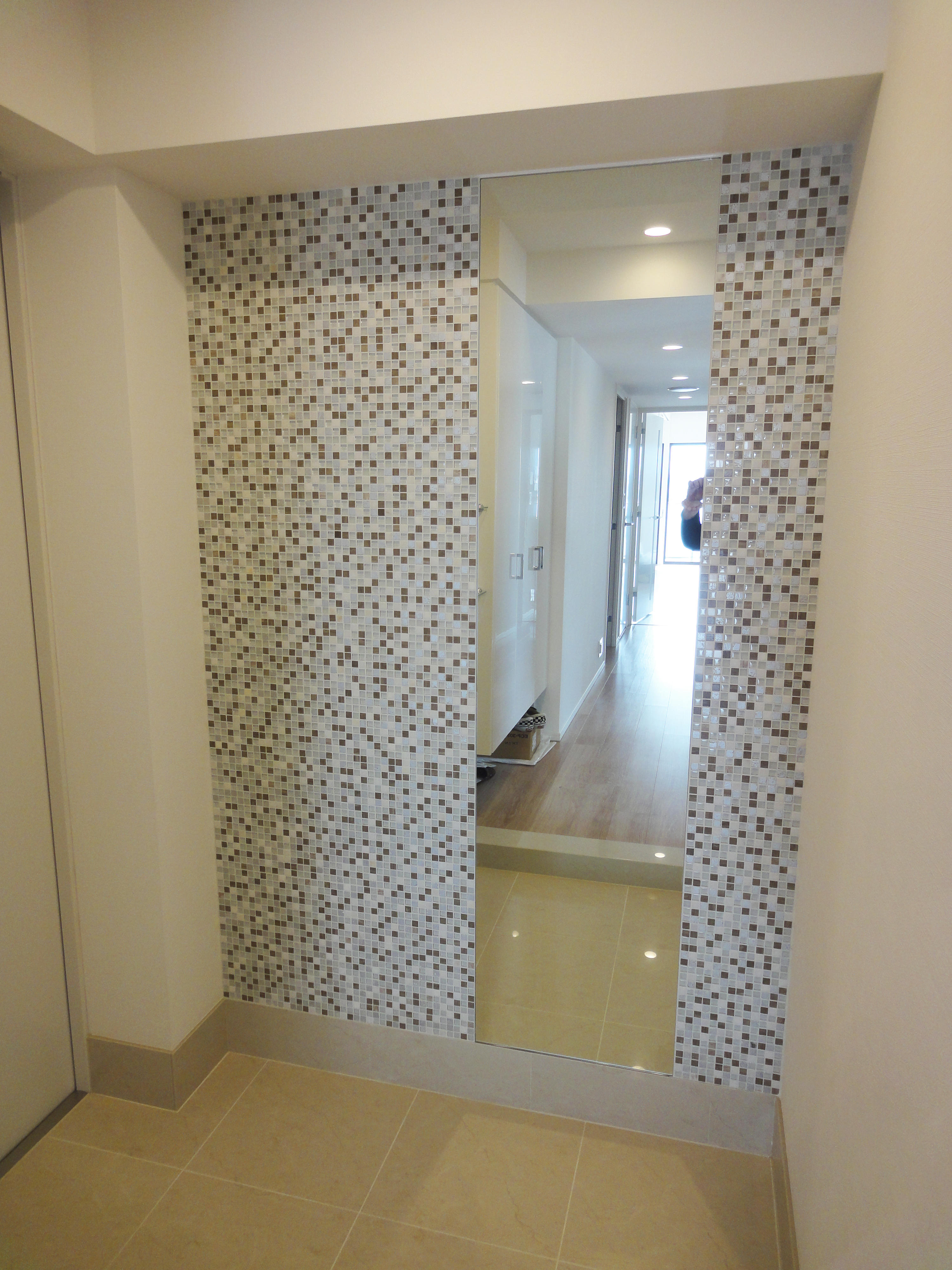 玄関にモザイクタイルと姿見を設置してアクセントに玄関に入って左の壁にW450×H1900の姿見を設置。そのまわりには洗面と同じアベルコのモザイクタイルを施工しました。