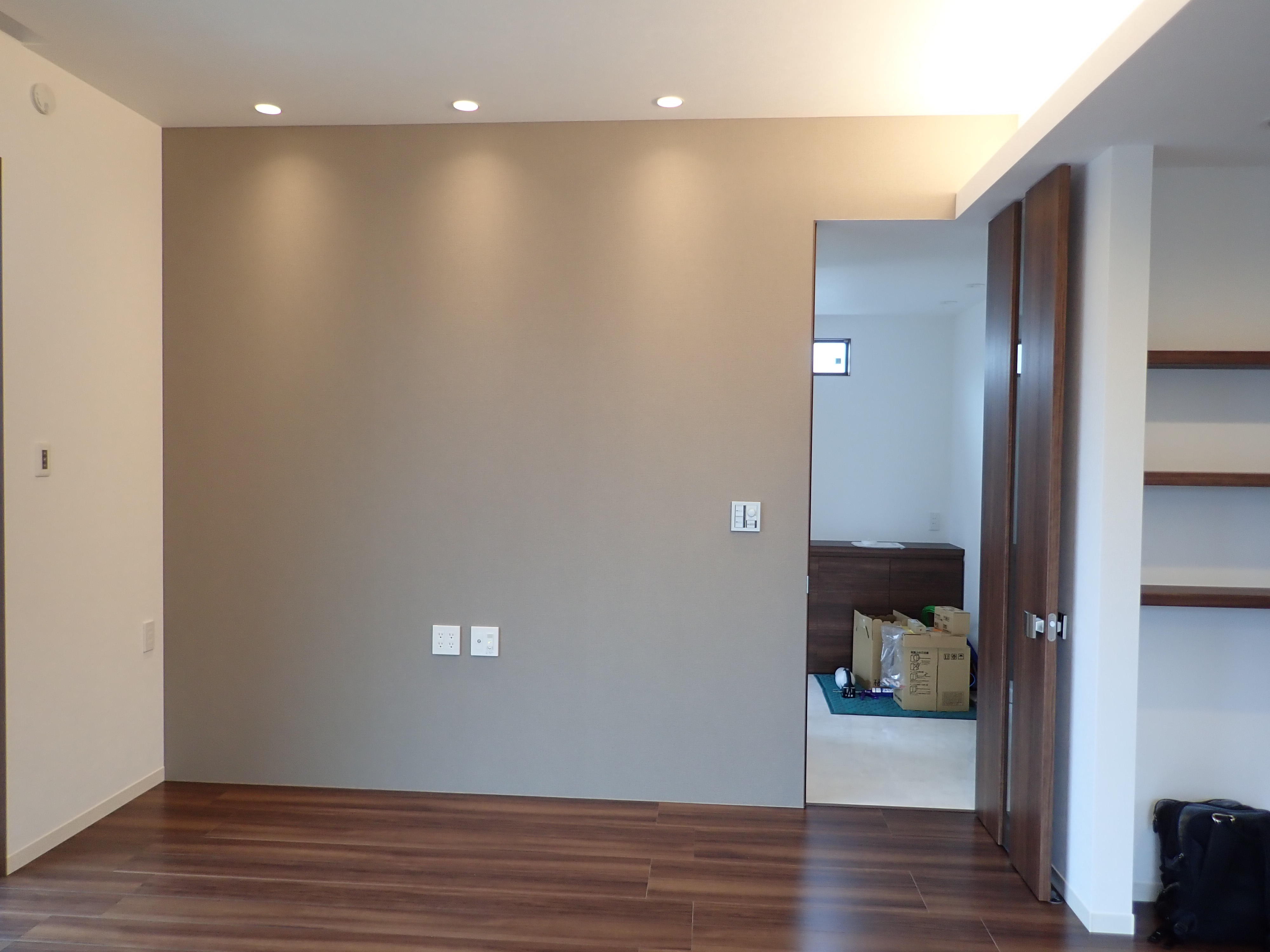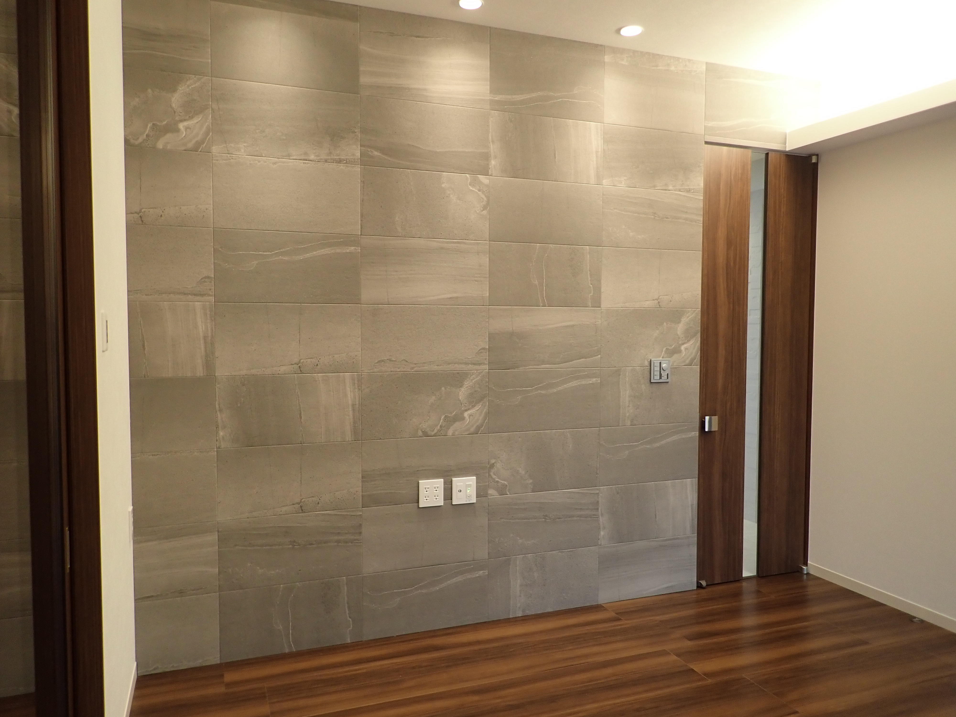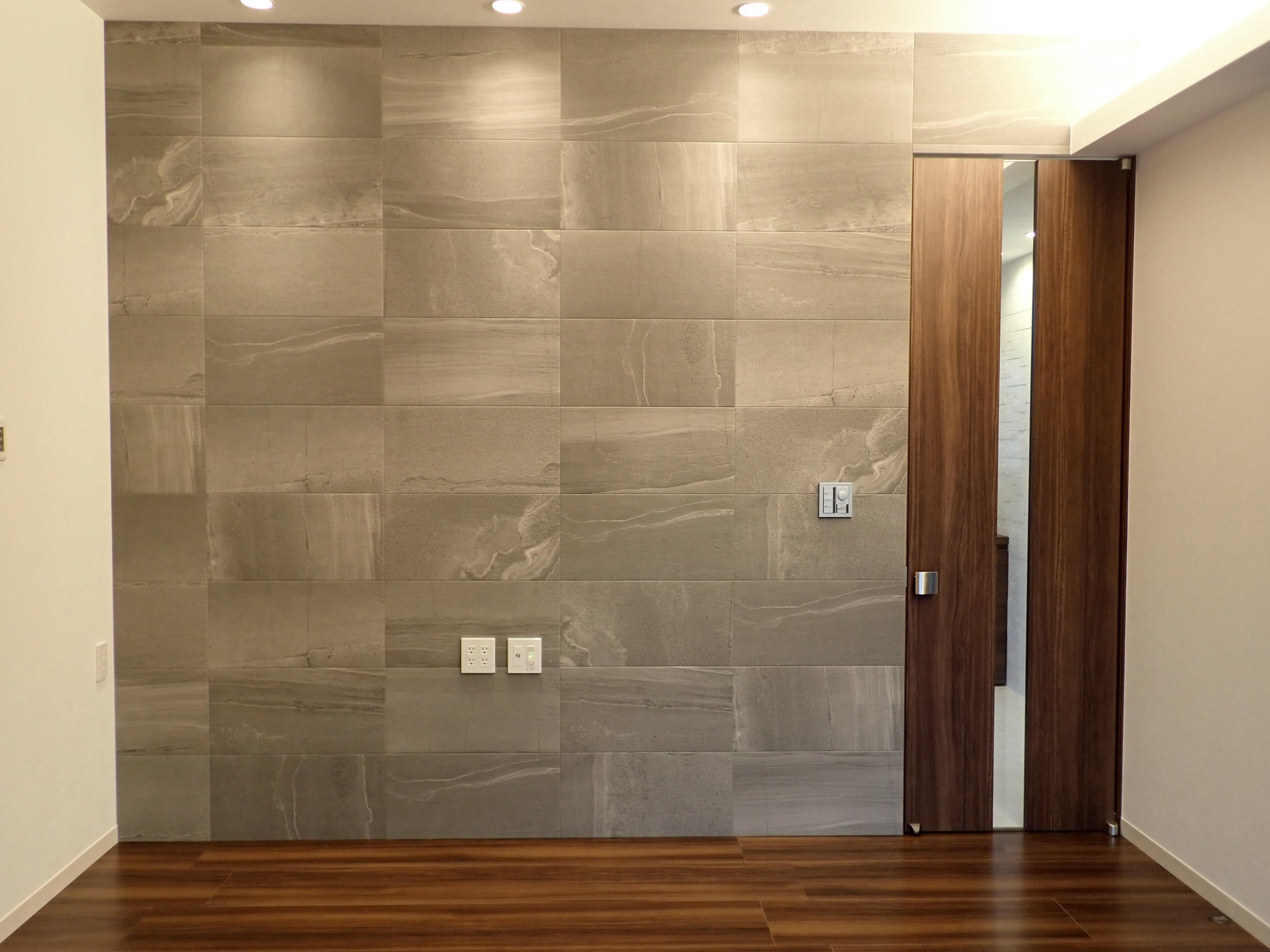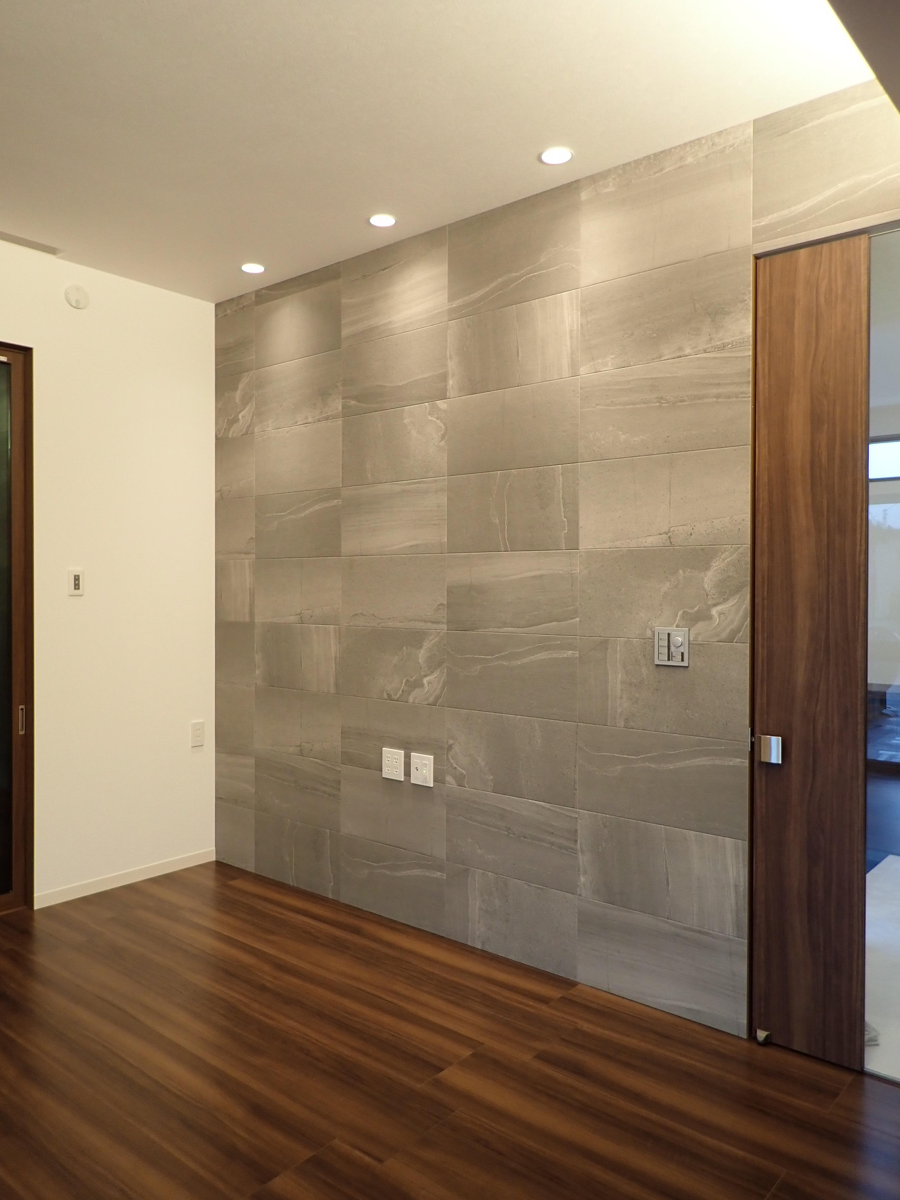 リビングにはエコカラットのストーングレースを施工しました。ストーングレースは大きな砂岩の流れ模様が特徴的なデザインです。もともとアクセントクロスが貼ってあった場所ですが、エコカラットを施工してより高級感のある空間となりました。