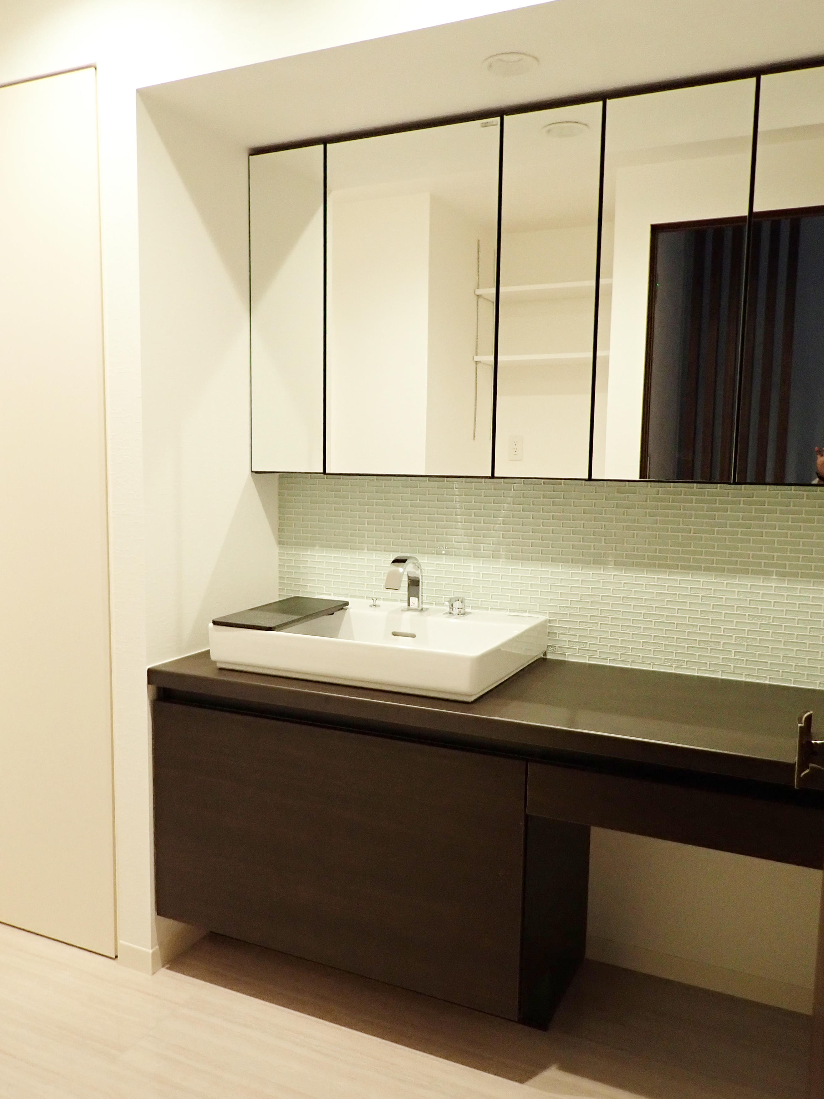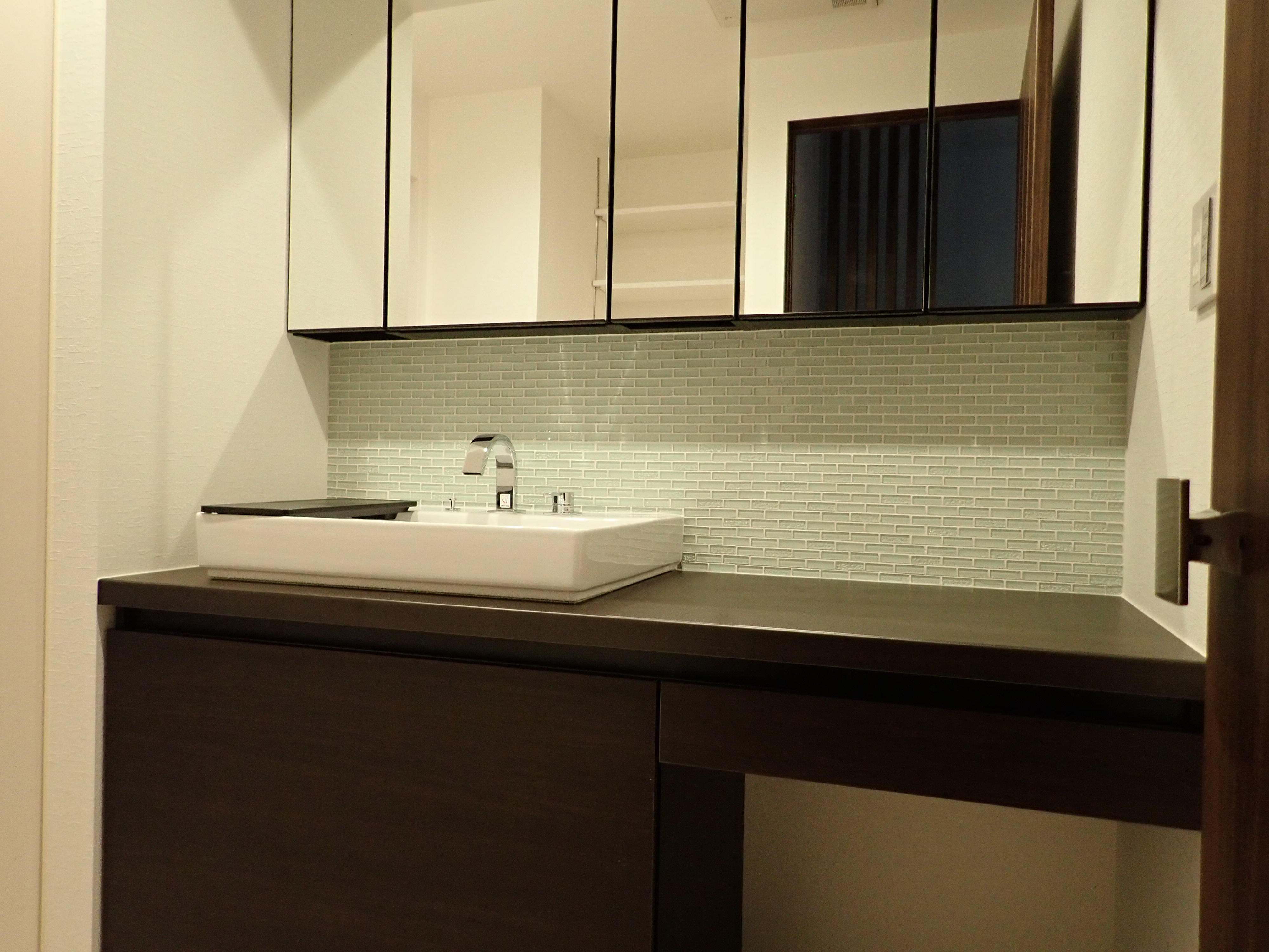 こちらの洗面もカウンターと鏡の間のスペースにLIXILのモザイクタイル ジャグズを施工しました。
