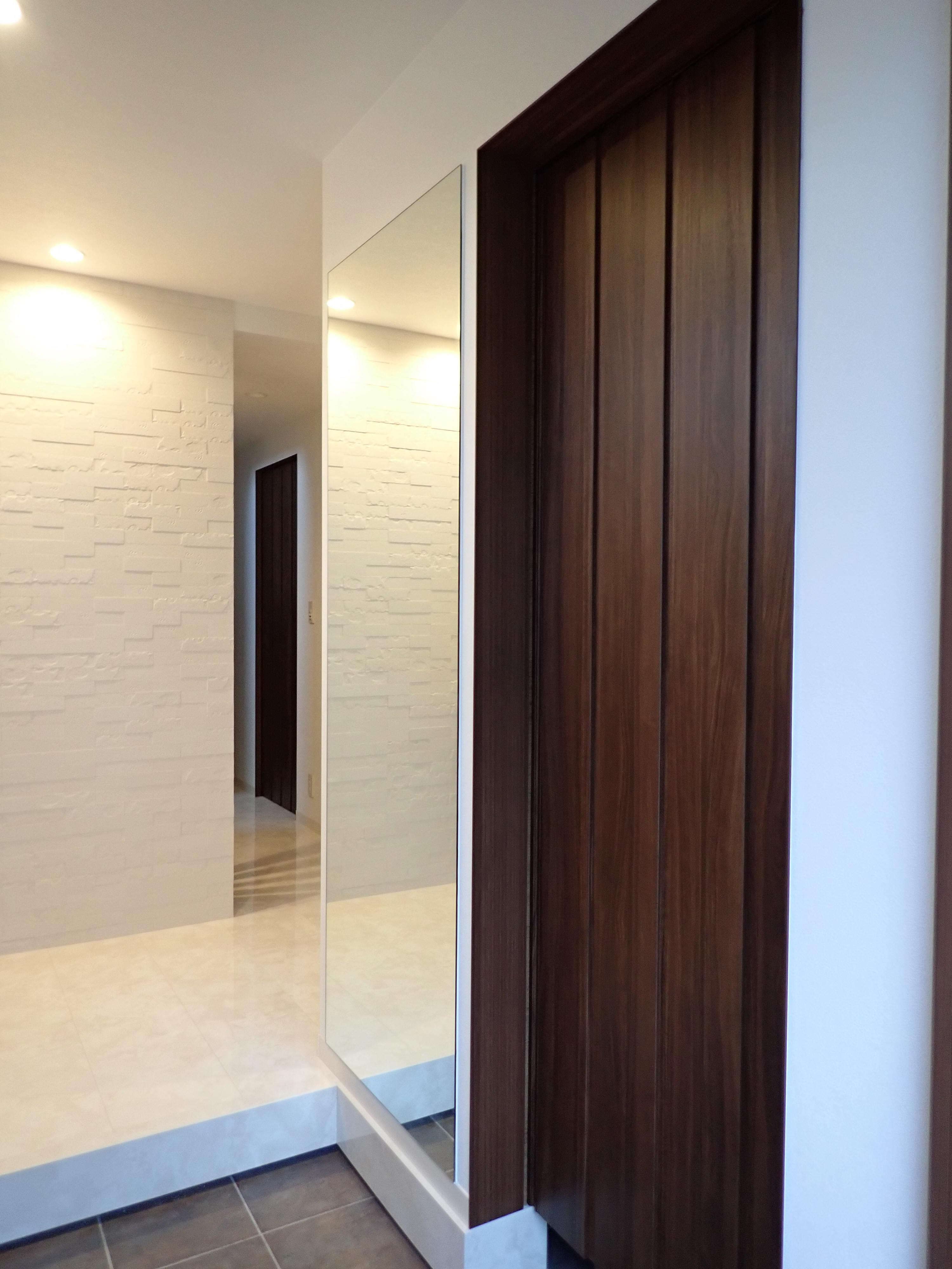 玄関右壁にはW700H2020の姿見を取り付けました。