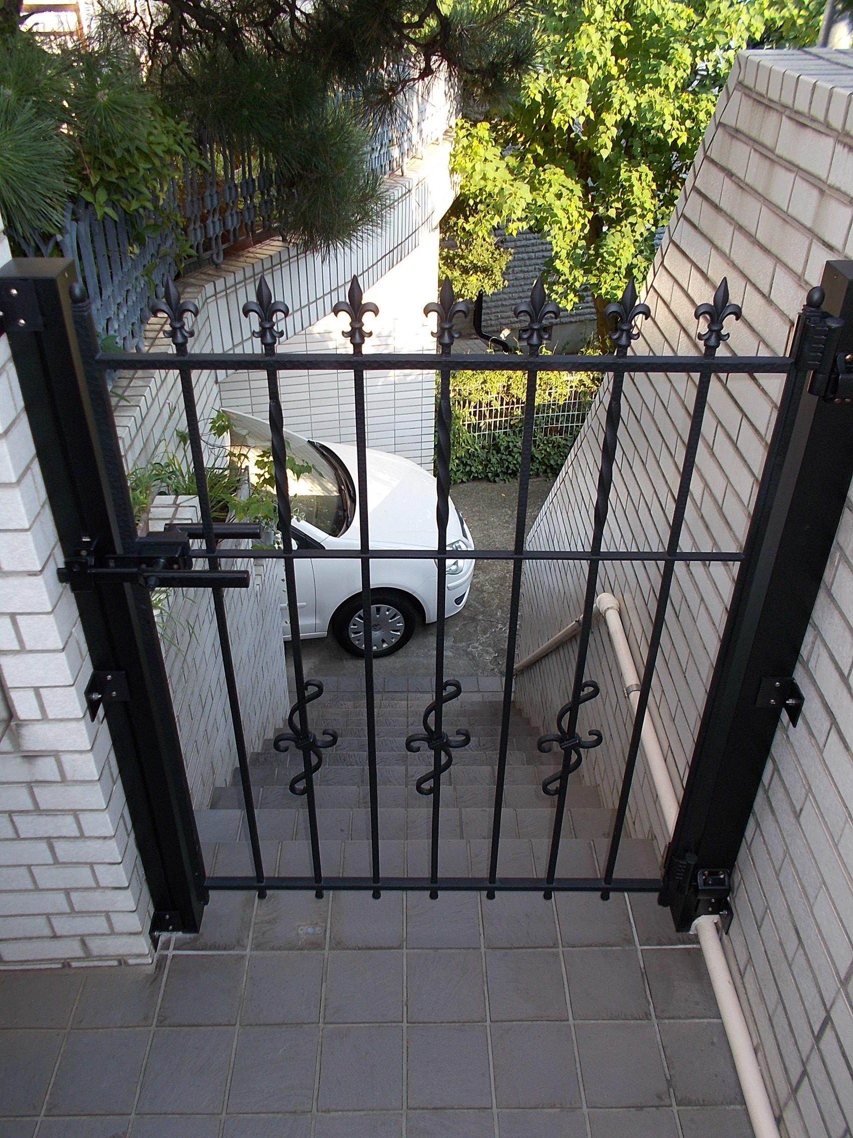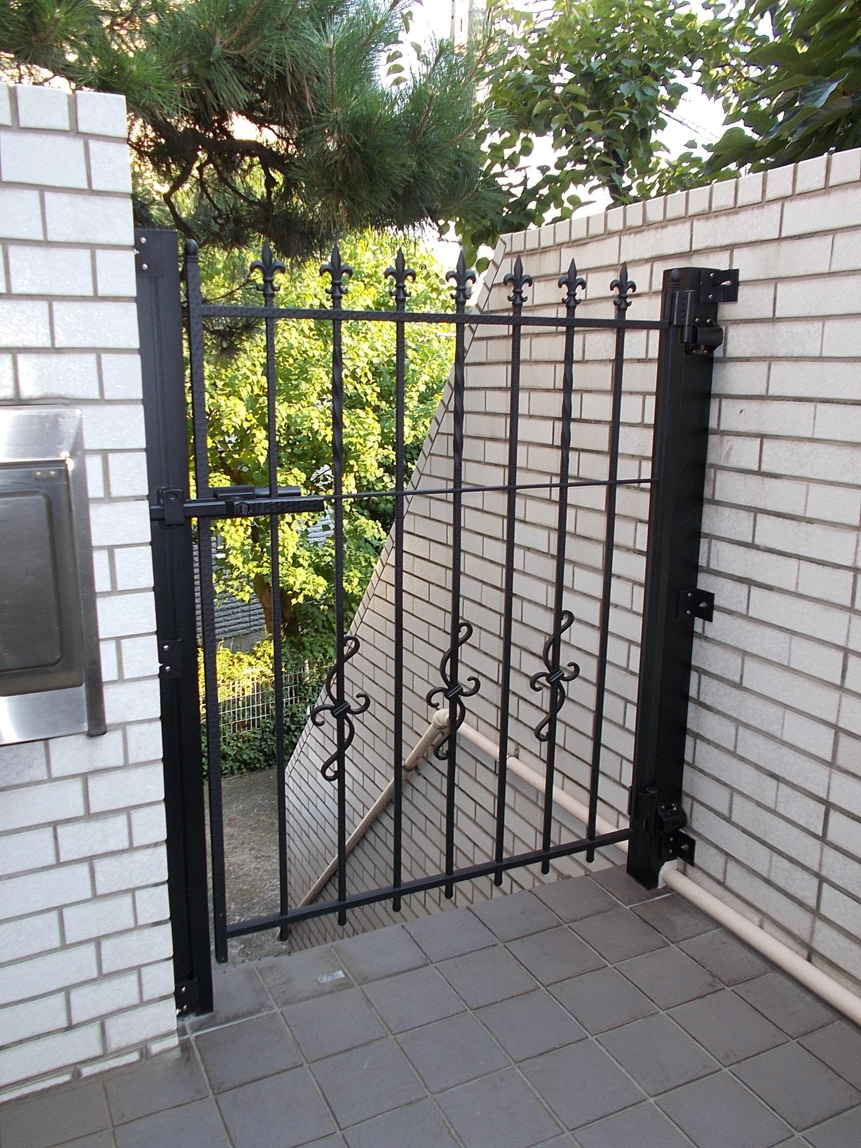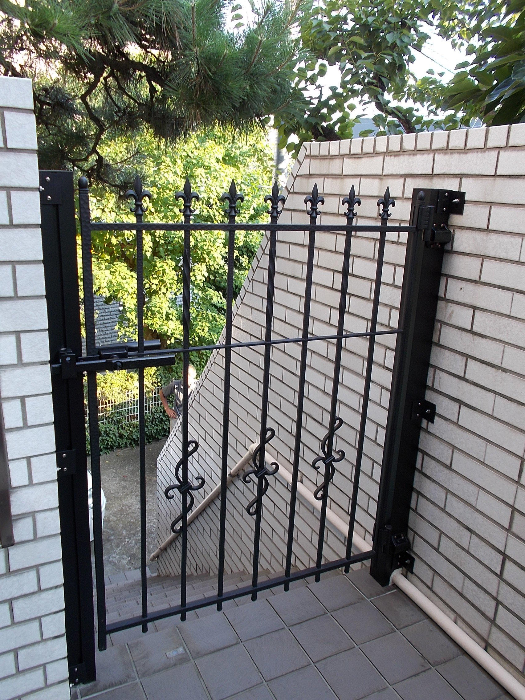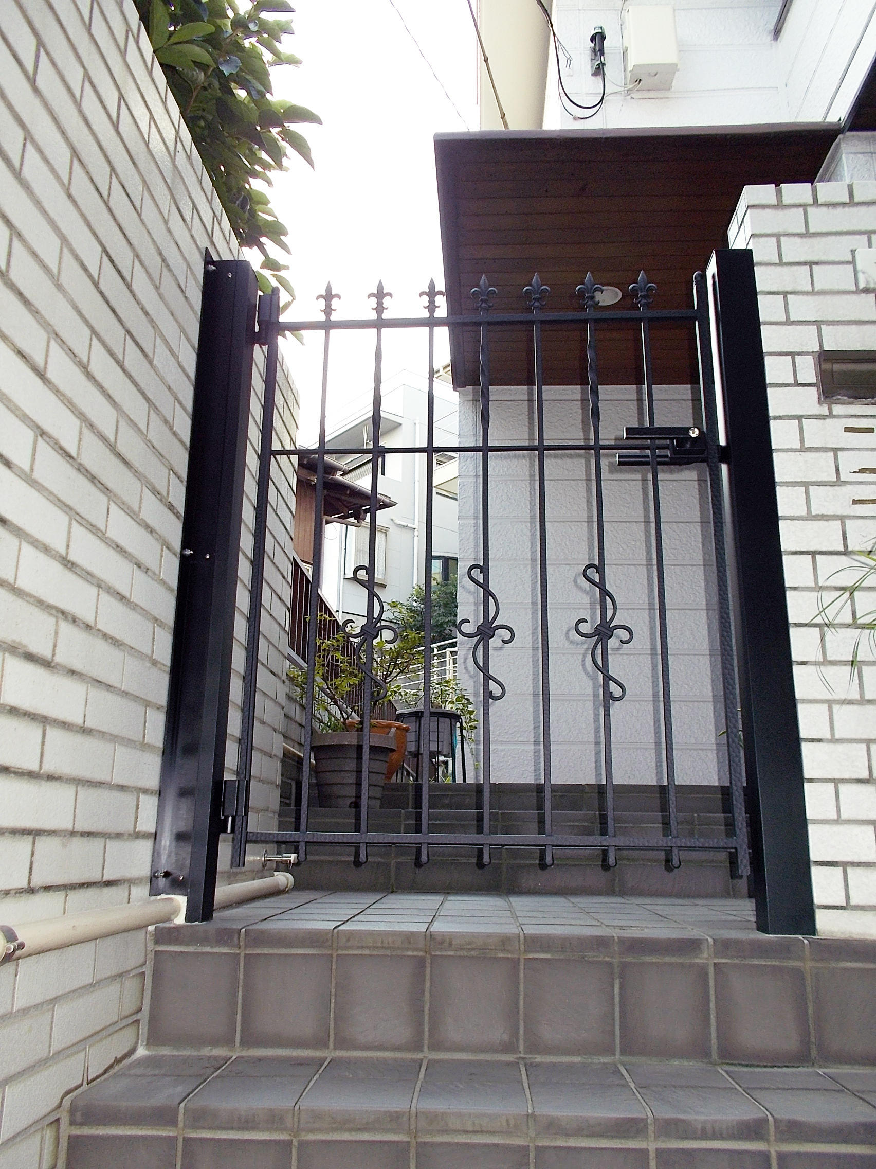 LIXILの門扉 ラフィーネ2型にお取替え。2型は空に向かって伸びる剣先が荘厳さを醸し出すデザインが特徴です。2型のデザインをベースに、剣先とデザインパーツ部分を自分で選べるセミオーダーが可能です。今回は上部パーツ:ツイスト、下部パーツ:唐草にて施工致しました。