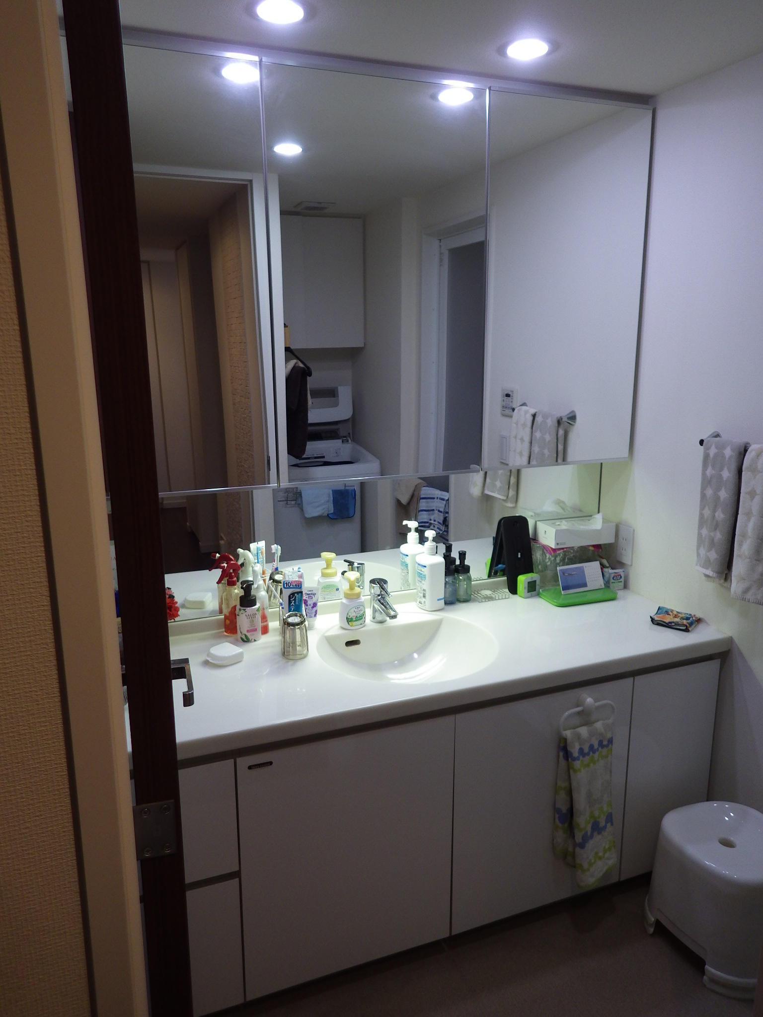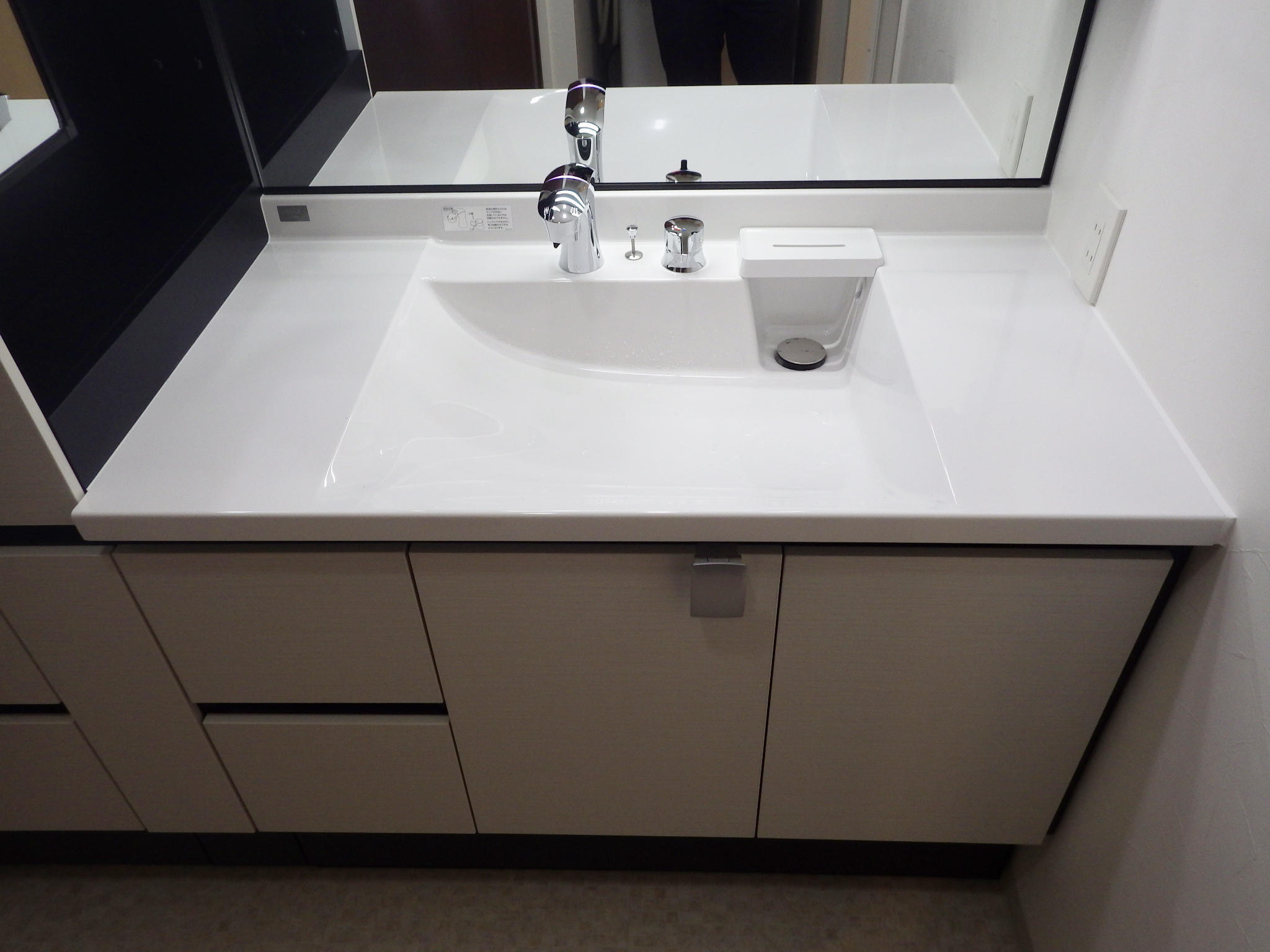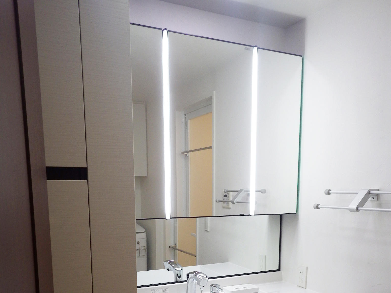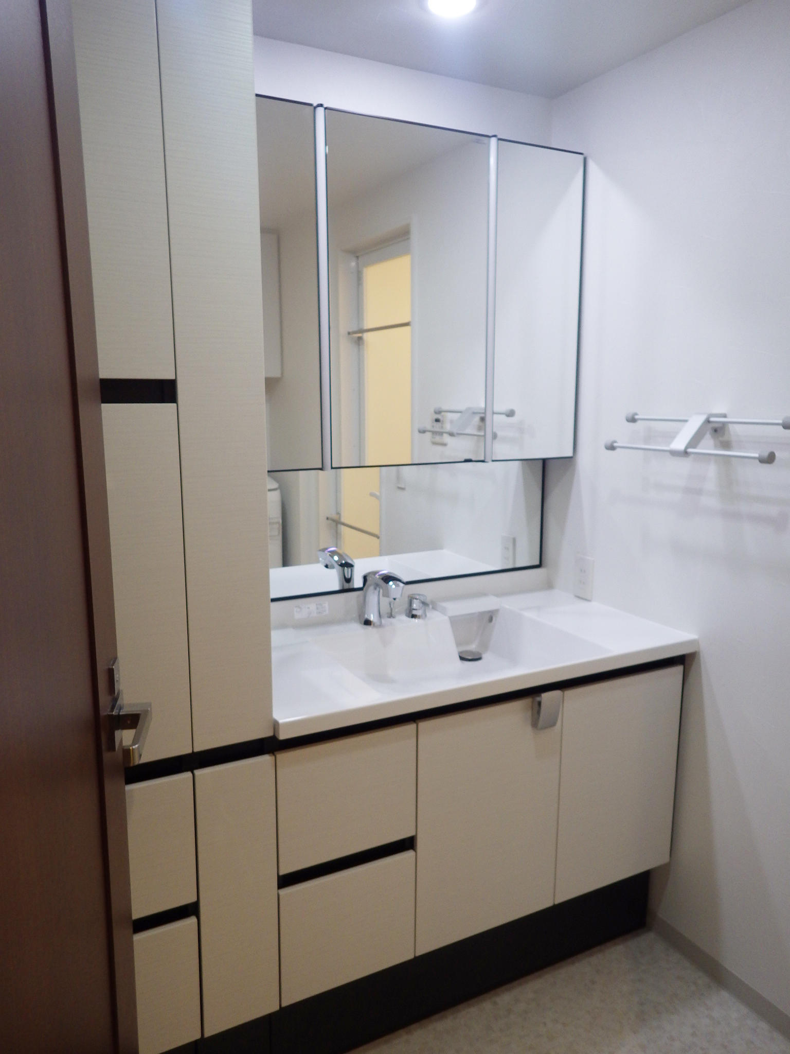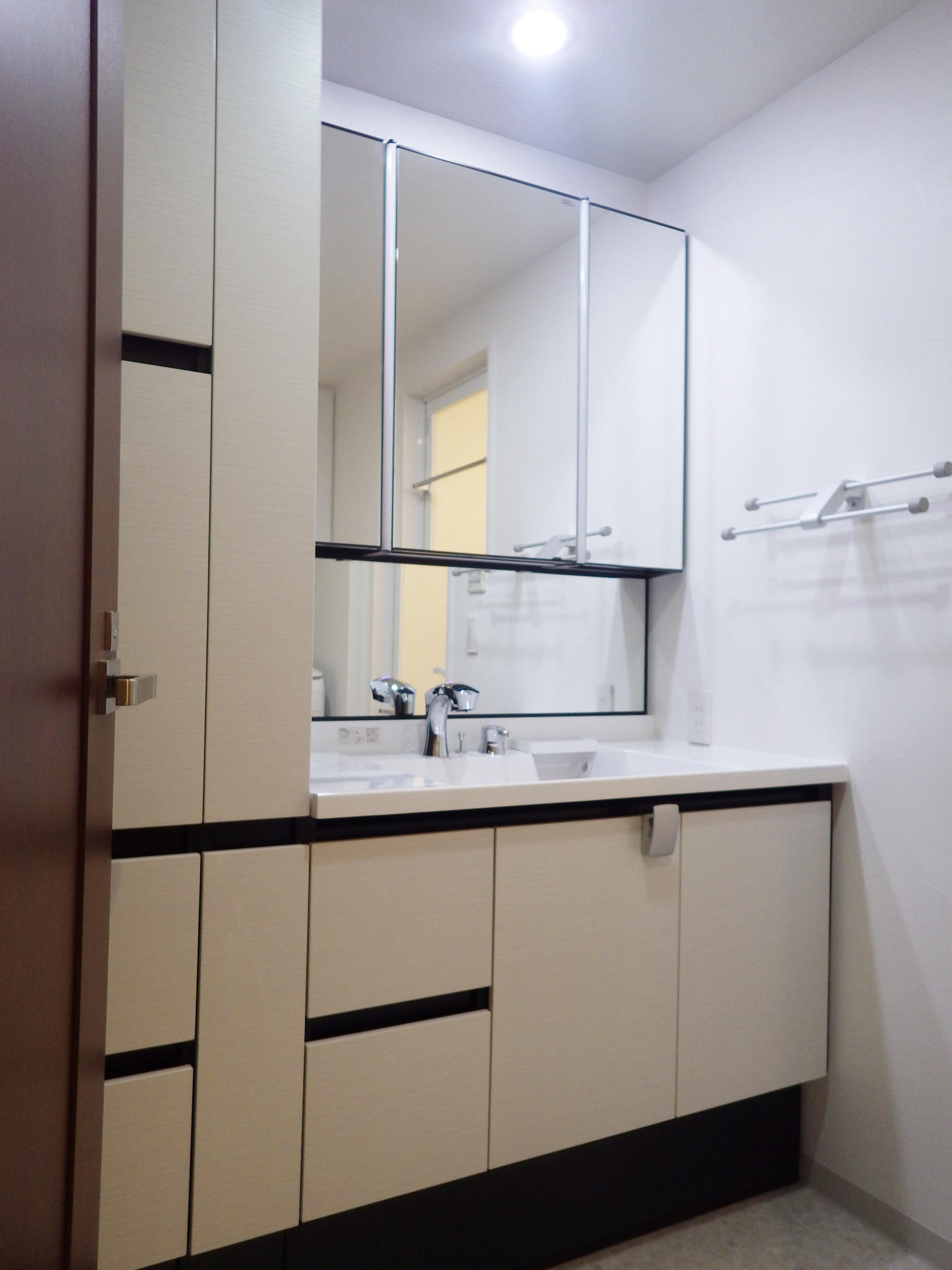 洗面化粧台はLIXIL ルミシスW1680にお取替え。左側にW450/W150のトールキャビネット、右側にW1050のベースキャビネット+3面鏡という組み合わせです。カウンターの高さはお客様の身長に合わせて、850mm(標準高さ800mm+50mm)にしました。またベースキャビネットのけこみ部分は収納になっていて、ストック品や体重計収納としてお使い頂けます。