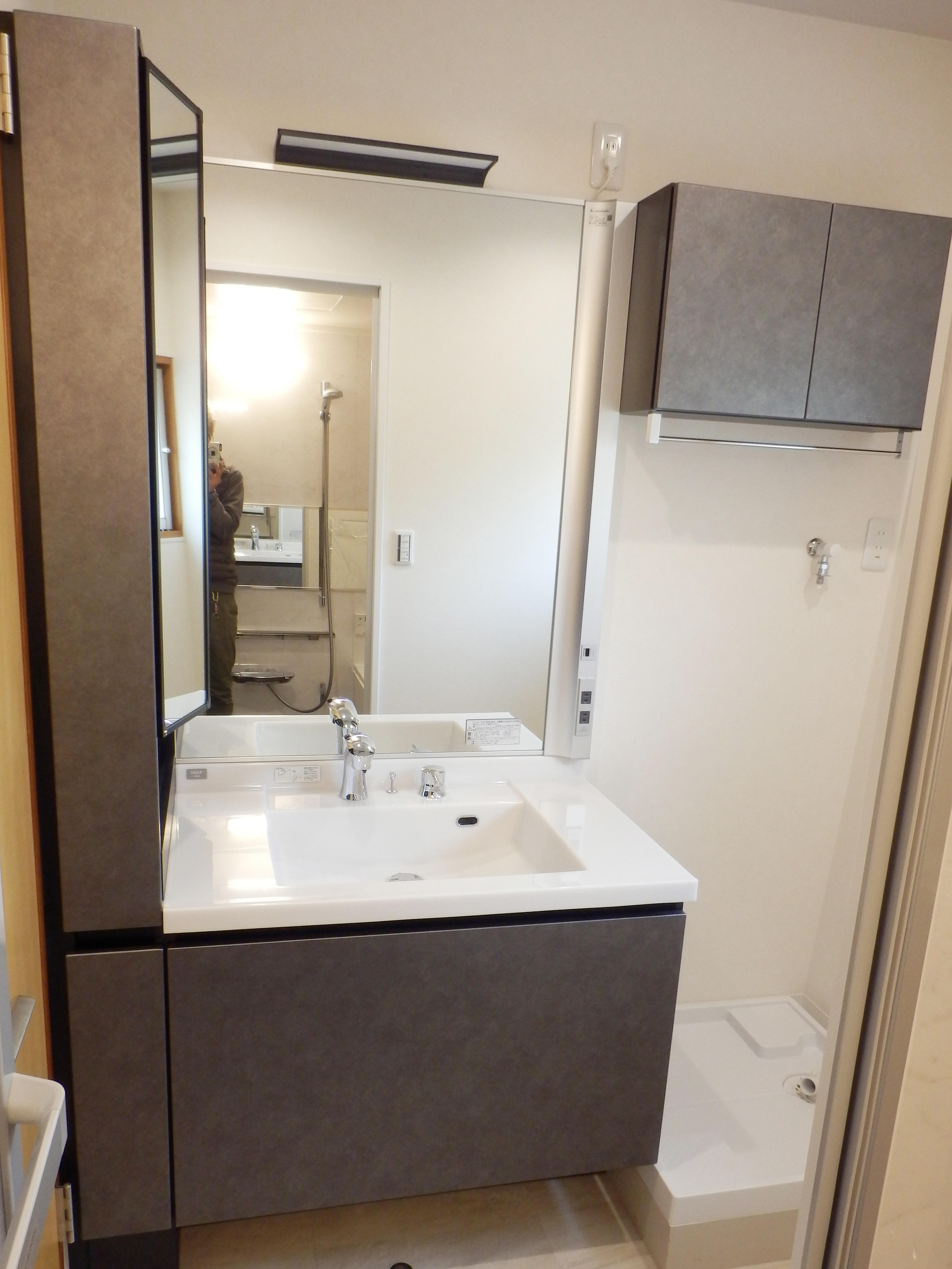 LIXIL ルミシスボウル一体タイプ(間口1,065mm)にお取替え。洗濯機上のスペースにも同色の扉カラー'(ハイグレード/グレインブラック)の吊戸棚を設置しました。水栓はタッチレス水栓。自動吐水と手動吐水が切替操作不要でどちらでも、いつまでも快適に湯水が使えます。