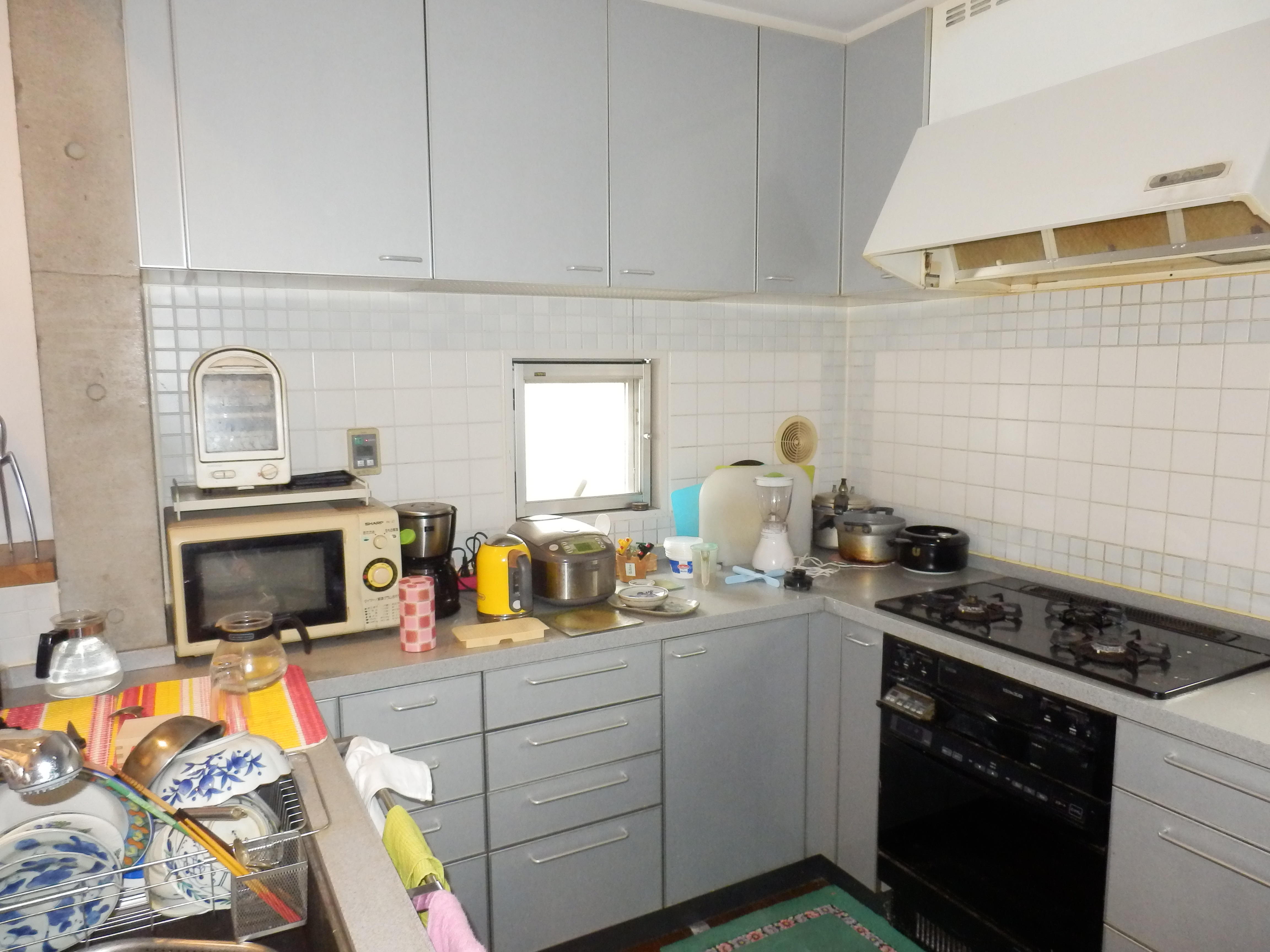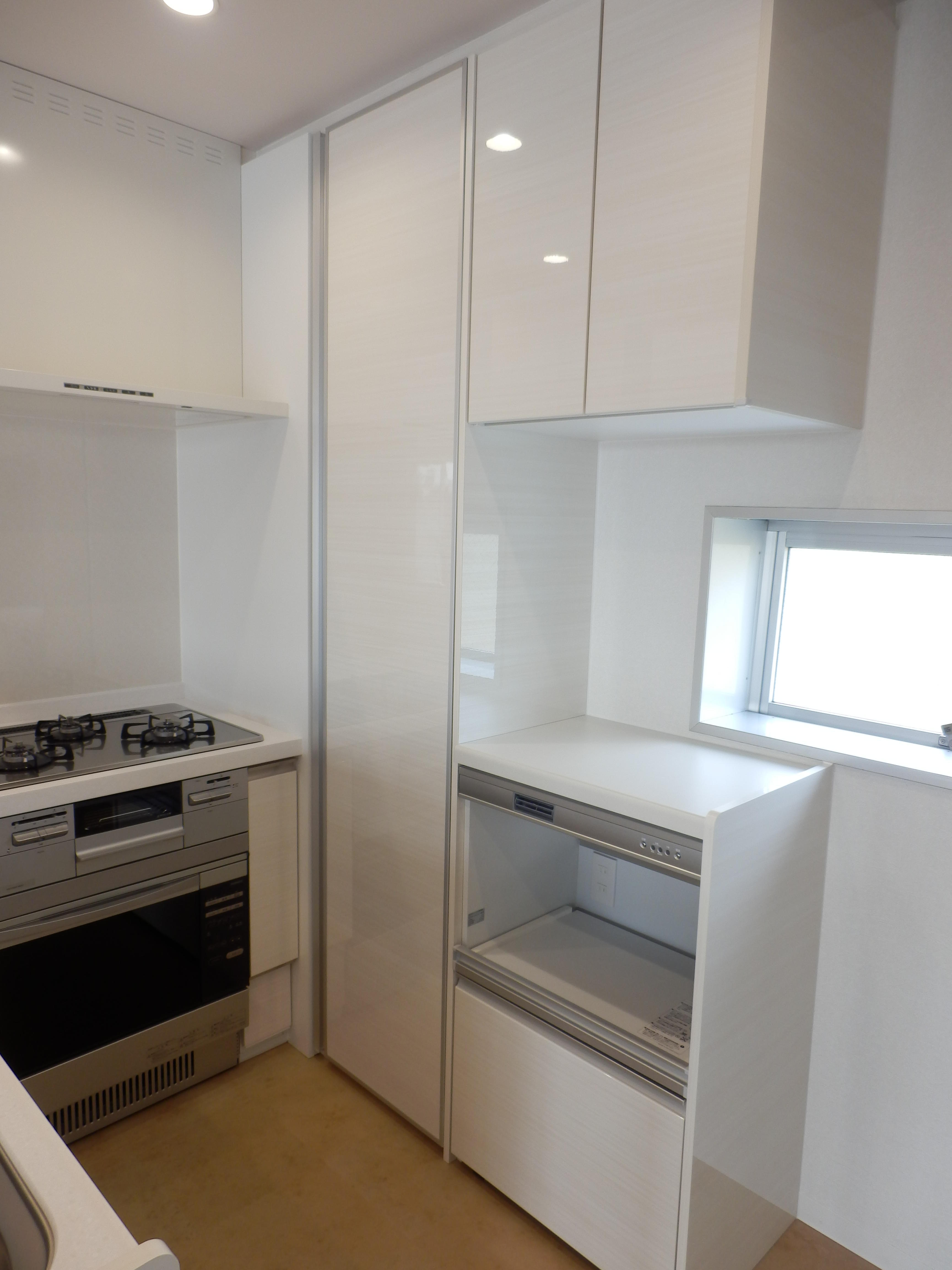 コーナーストッカー&家電収納レンジフード横にはコーナーストッカーを設置。デットスペースになりがちなL型のコーナ部分もきちんと収納スペースとして利用できます。中段は奥まで手が届きやすい、L字型の棚になっています。