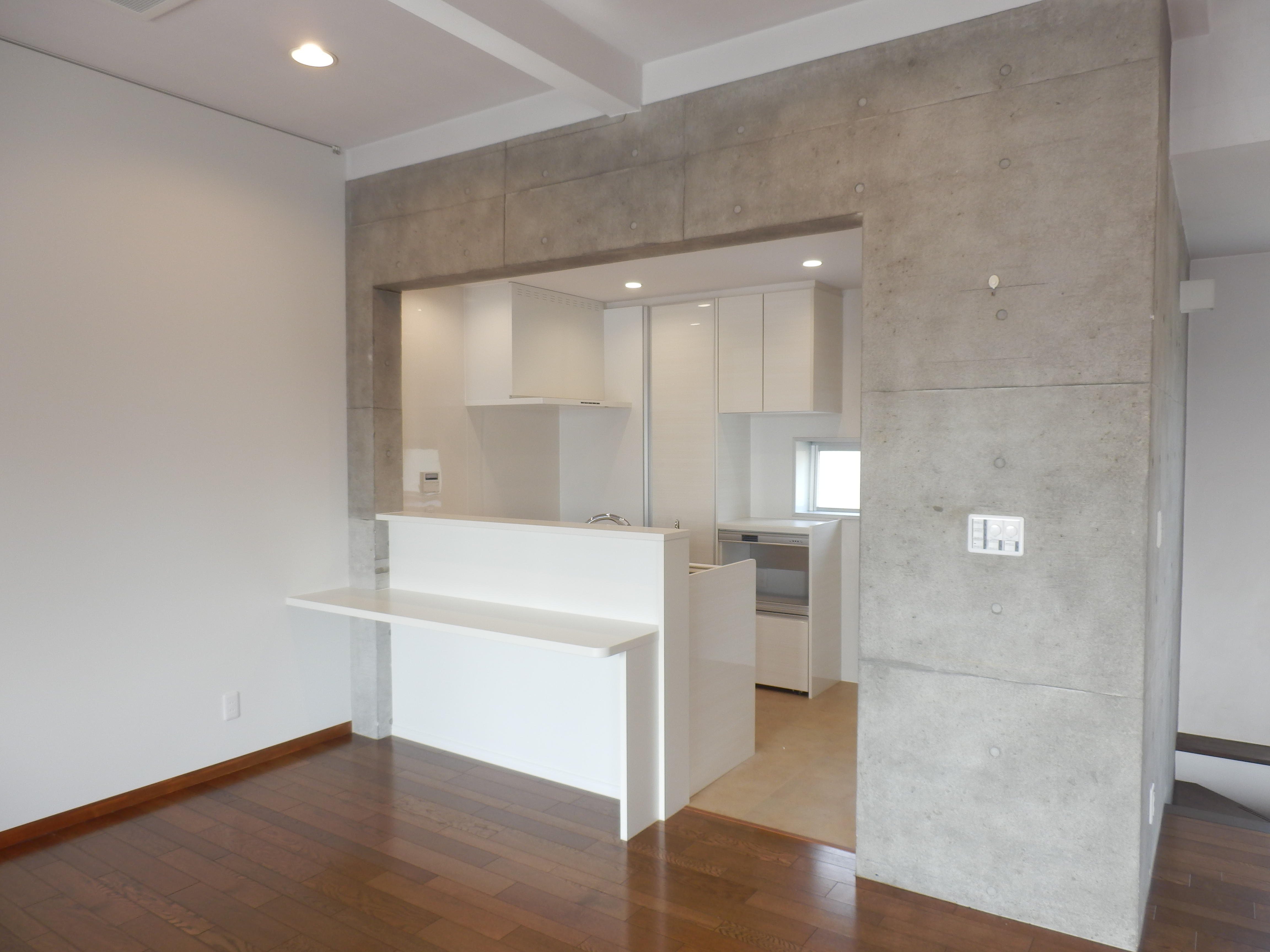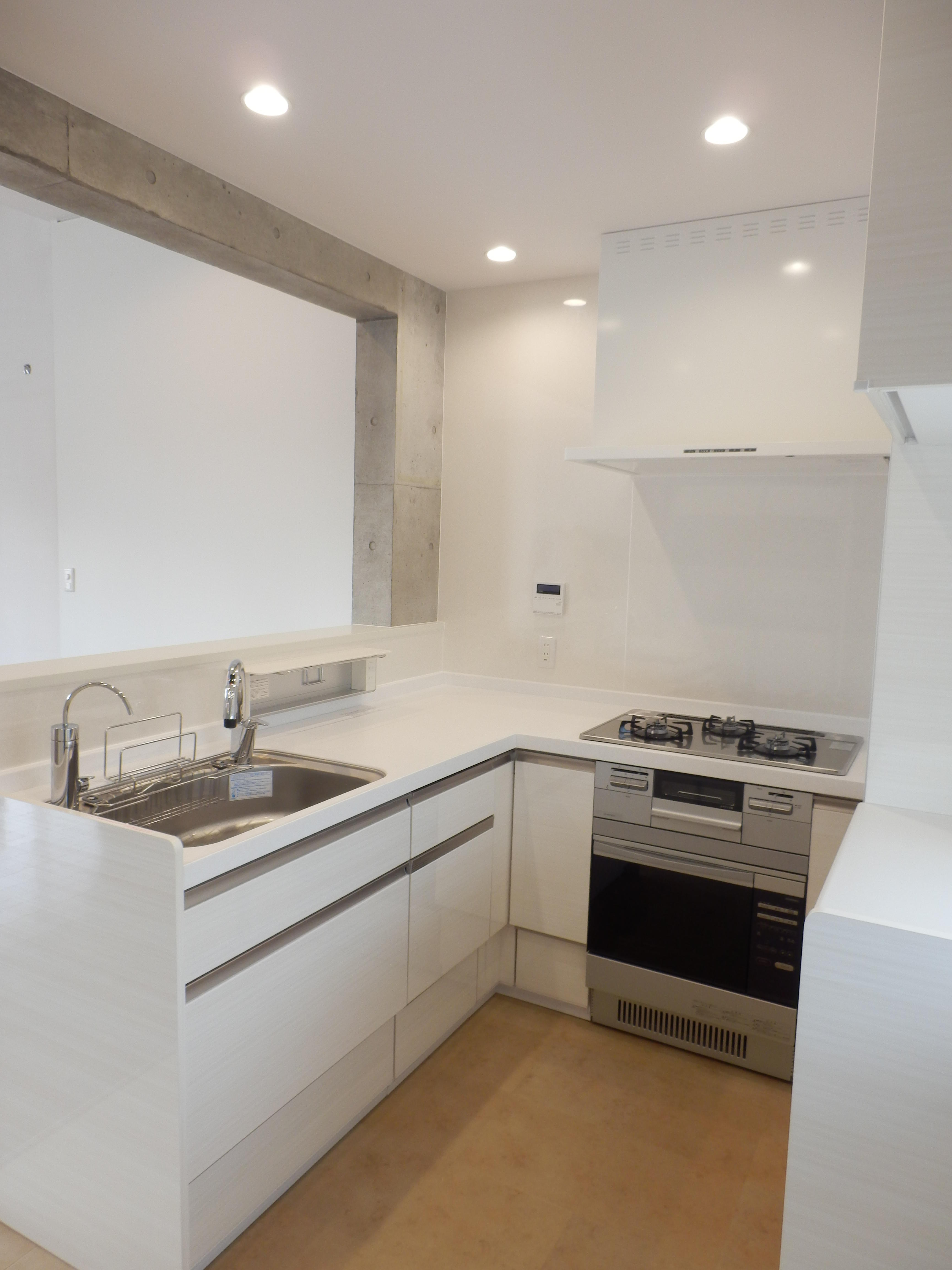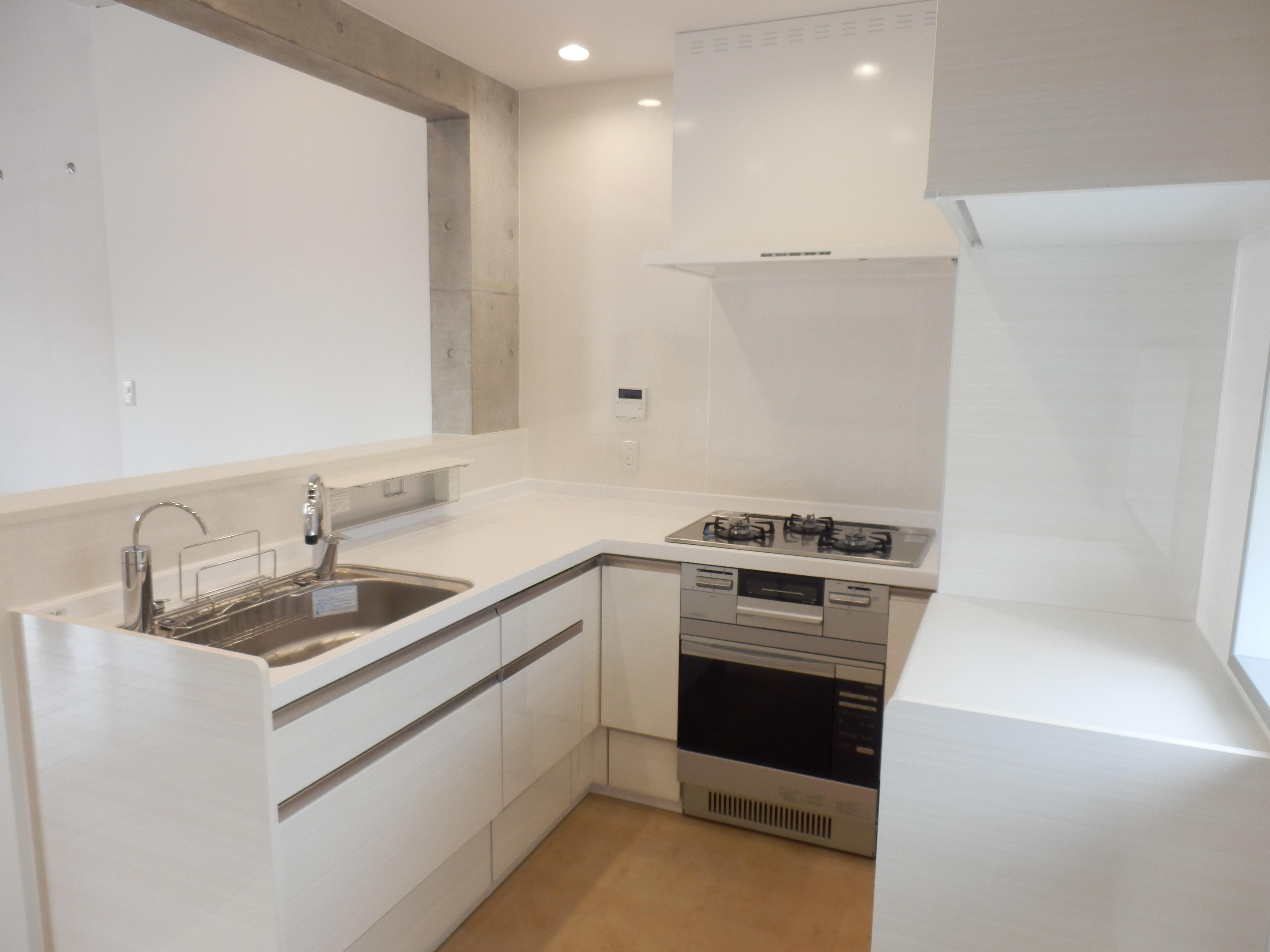 LIXIL リシェルSIにお取替え。扉面材は木目調ホワイトの[ホワイトレオ]をお選び頂きました。以前と同じコの字型配置ですが、レンジフード&ガス機器の位置を変え、コーナーストッカーを設置しました。