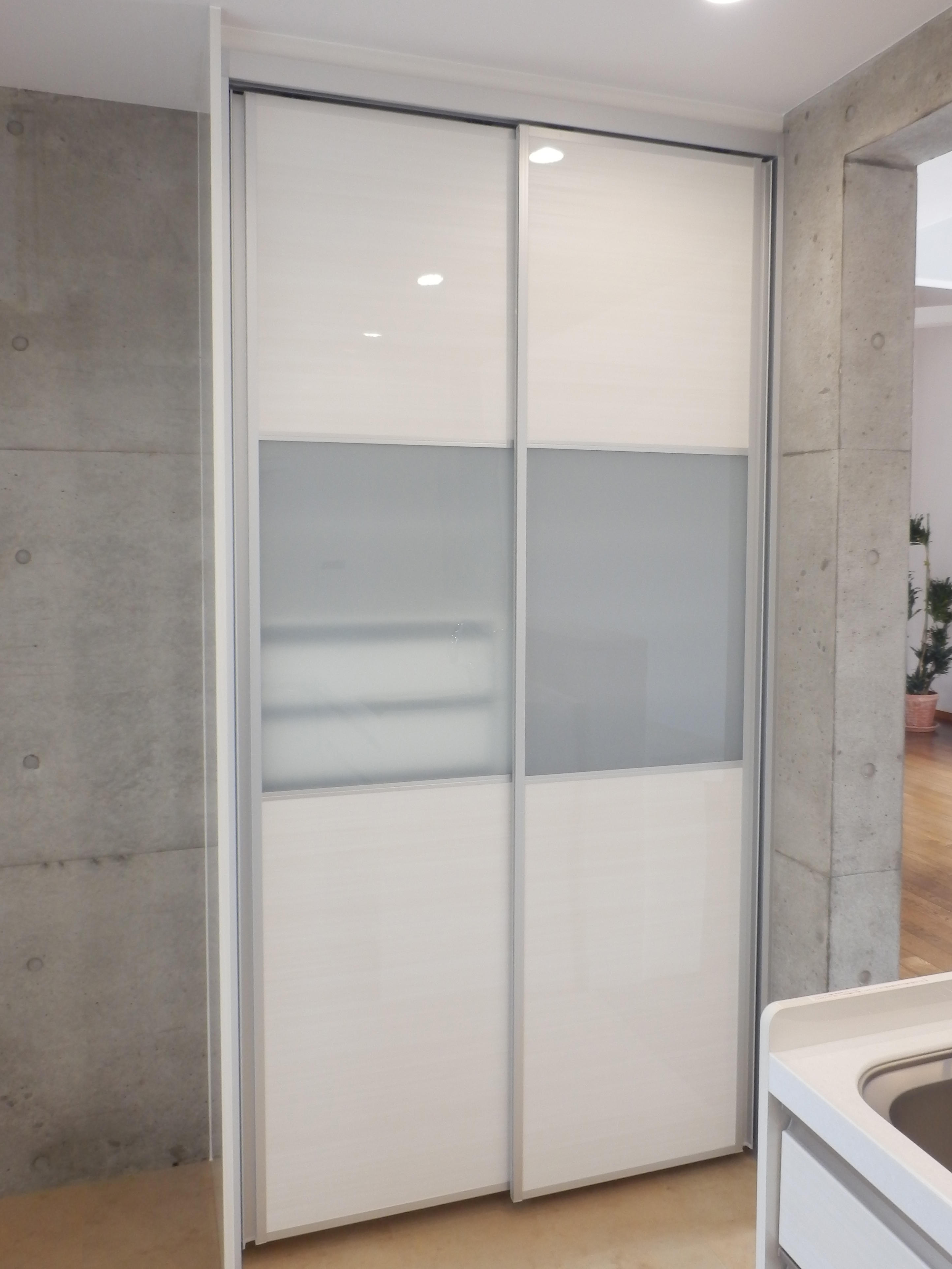 コの字型キッチンの他にW1200の2ウェイクローゼットを設置。大型扉の中段エリアに昇降式の“窓”があるので、扉全体の開け閉めをしなくても、必要な物をサッと出し入れできます。普段良く使う食器やストック品などが収納できる大容量の収納です。