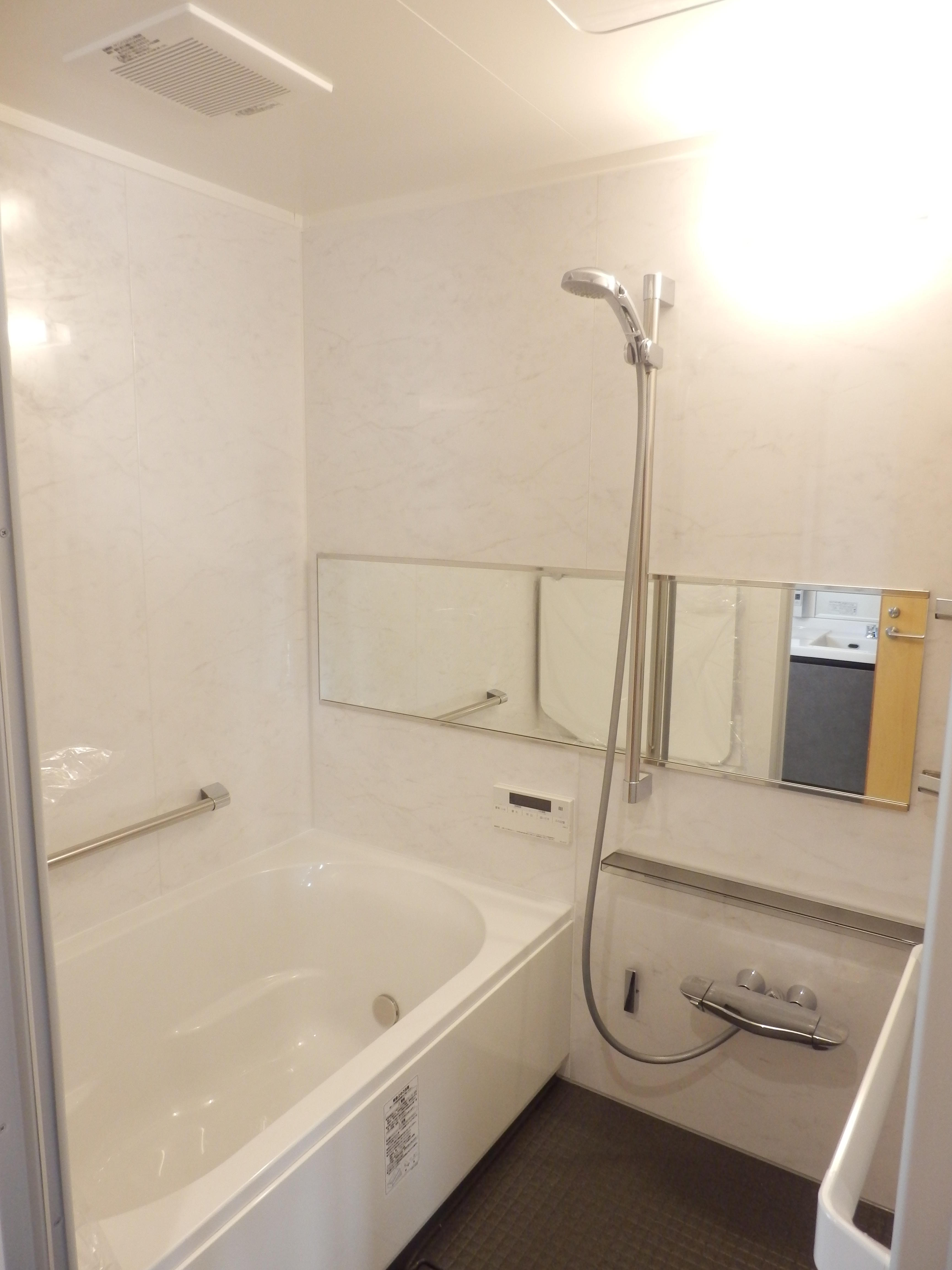LIXIL リノビオVシリーズ1317にお取替え。隣にあったトイレのスペースを利用して、シャワールームからユニットバスに変更しました。石目調ホワイトの[ホワイトストーン]色のパネルで明るくスタイリッシュな浴室に。浴槽は大理石のような上質な光沢と華やかなきらめきをまとう人造大理石浴槽です。
