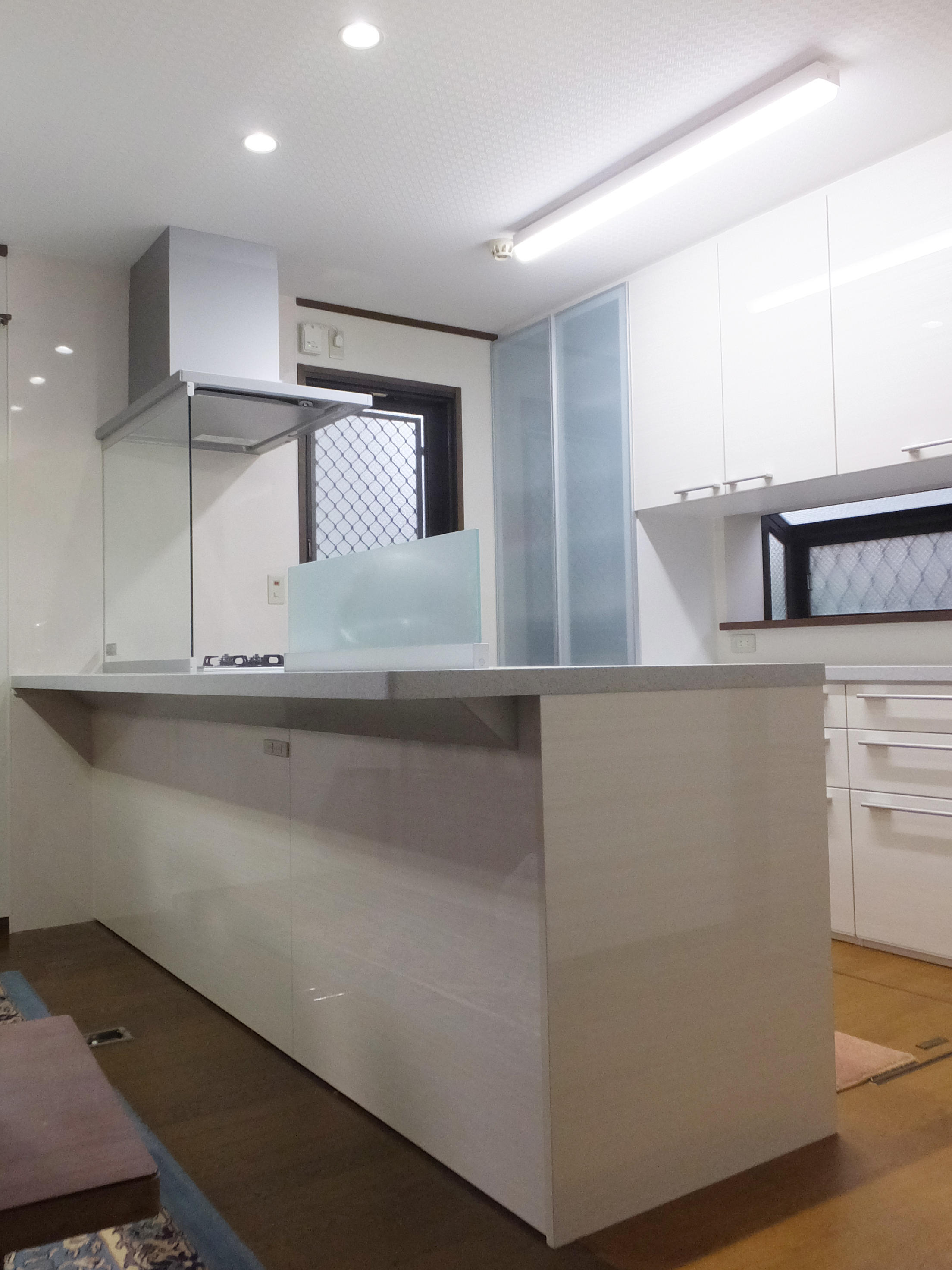 LIXIL リシェルSI W2570にお取替え。お色は「ホワイトレオ」という明るい木目柄です。壁付けI型のものから対面キッチン(ペニンシュラ型)に変更しました。ガスコンロの前には全面タイプのガラスパネルを設置。油汚れなどがリビング側に飛ぶのを防ぎます。