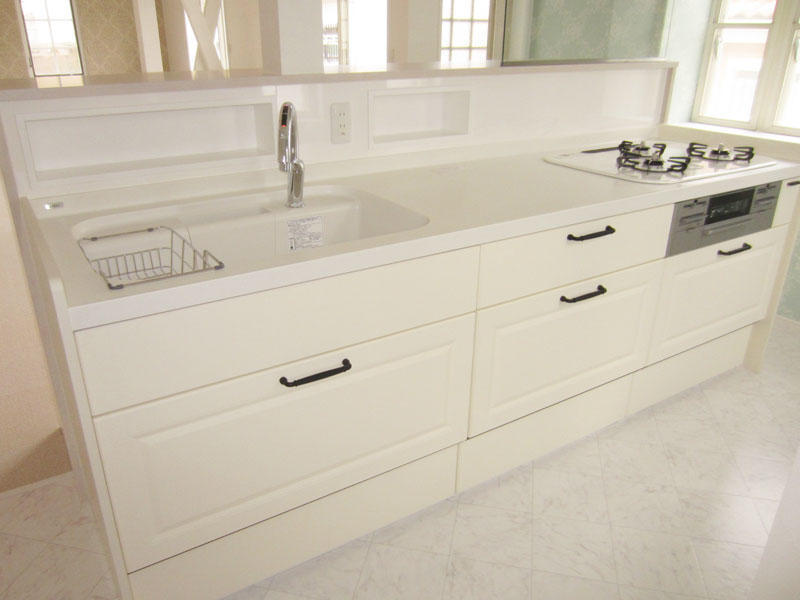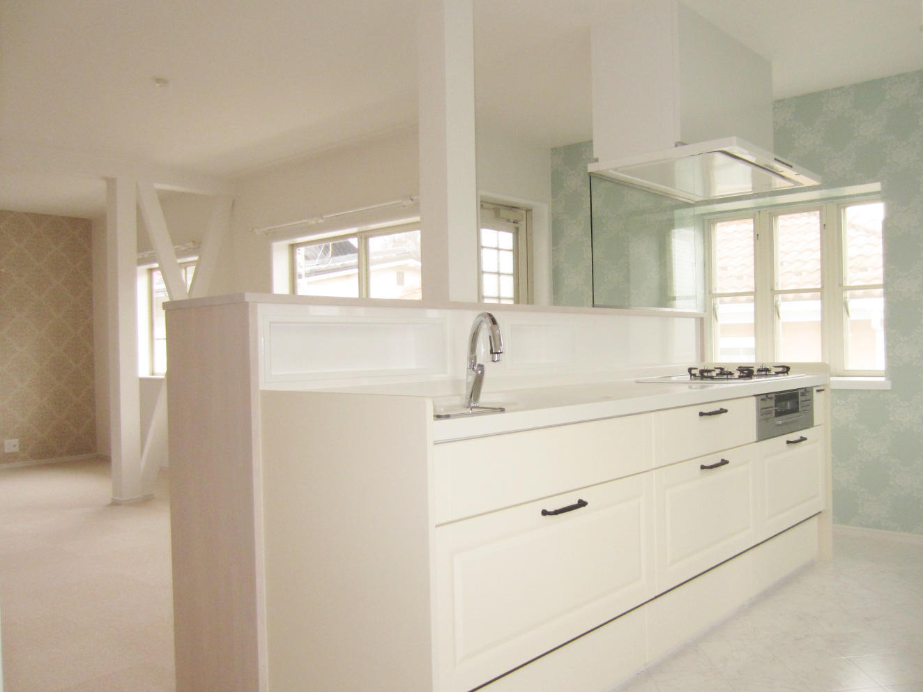LIXIL リシェルSIにお取替えしました。扉の色はフロマージュアイボリーをお選び頂きました。既存のキッチンは、食堂に対面しているとはいえ開口の間口が狭く、使い勝手がよくありませんでした。ご夫婦が楽しく快適な時を過ごすことができるように、壁を撤去し、キッチンの向きを変更しました。調理した料理をよりスムーズに食卓に運ぶことができる「動線」を確保し、シンク側・コンロ側のどちら側からもキッチンに入れるオープンキッチンにリフォームしました。