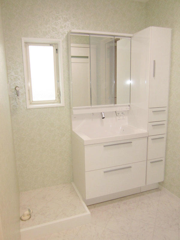LIXIL L.C.(エルシー)にお取替え。間取り変更して、洗面脱衣室は以前より広いスペースになりました。