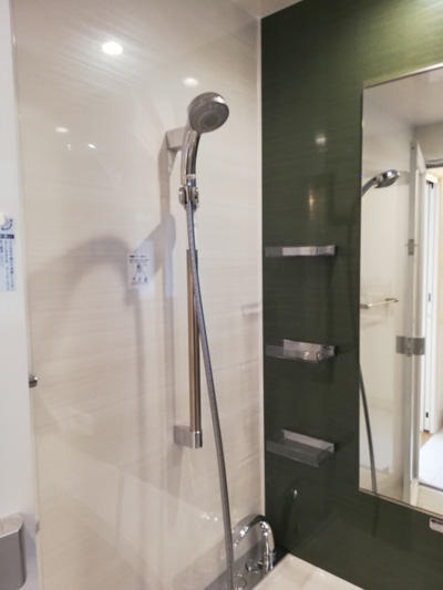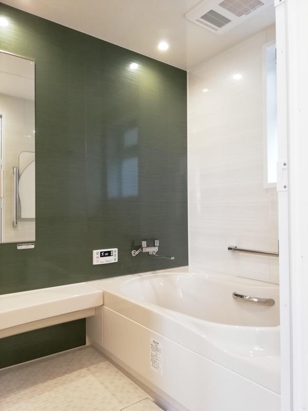 LIXILの最高級ユニットバス スパージュ1620サイズにお取替え。アクセントの壁パネルは縦横ストライプがクロスした柄にゴールドパールを添えた深みのあるグリーン「HGストライプ」柄をお選び頂きました。