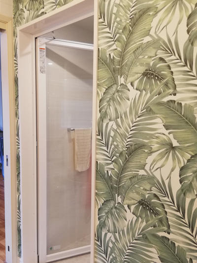 浴室入口周辺にはボタニカル柄のクロスを施工しました。アクセントパネルの深みのあるグリーンとも統一感があります。