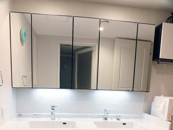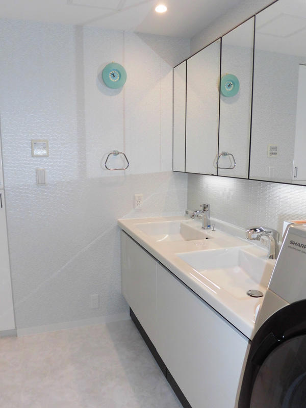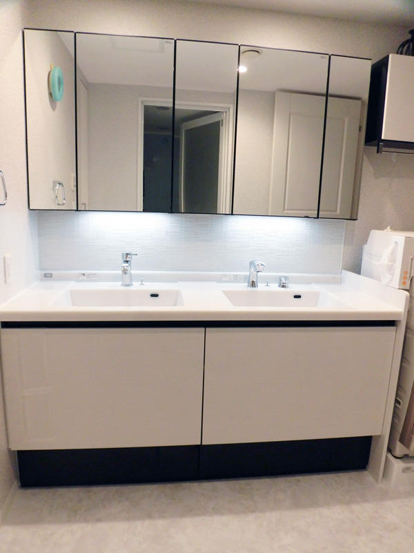 洗面ボウルが割れてしまったことがきっかけで洗面化粧台のリフォームをご検討されていました。 ボウルが小さくて使い勝手が悪いので、洗面化粧台をサイズアップして2ボウルにしたいとのご希望でした。