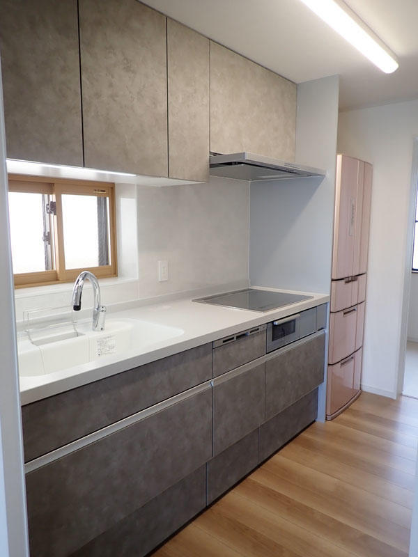 LIXIL エルシィ にお取替え。扉カラーは、落ち着いた色合いの鏡面木目シリーズで高級感のあるカームウッドライトをお選び頂きました。「キレイアップカウンター」は、バックガードがミラー下まであり、凹凸がないので、飛び散った水滴もサッとひと拭きでお手入れラクラクです。上から水が出る「キレイアップ水栓」は、水栓まわりに水がたまりにくいのでお掃除簡単です。