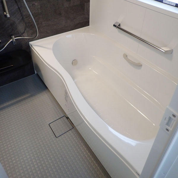 LIXIL アライズMタイプ にお取替え。アクセントパネルは「組石グレー」石柄の鏡面仕上げで流れ模様のある大理石、乱形組石など天然石の豊かで上質な空間を演出します。浴槽は1600ロング浴槽。足も肩まわりも、ゆったり伸ばして入浴できます。浴槽は清潔感のあるホワイト、床はスポンジでお掃除もラクラク。寒い冬場でも、冷ヤッとしない。キレイサーモフロアのグレー色をお選び頂きました。