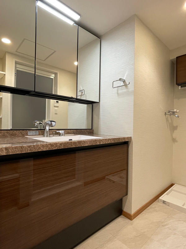 LIXIL ルミシス W1190にお取替え。埋込収納は撤去し、鏡は収納できる三面鏡に変更しました。扉の色はハイグレードの「アンティークブラウン」です。高級感のある光沢のある面材と上品なカウンターで、美しいホテルのような洗面化粧台に生まれ変わりました。